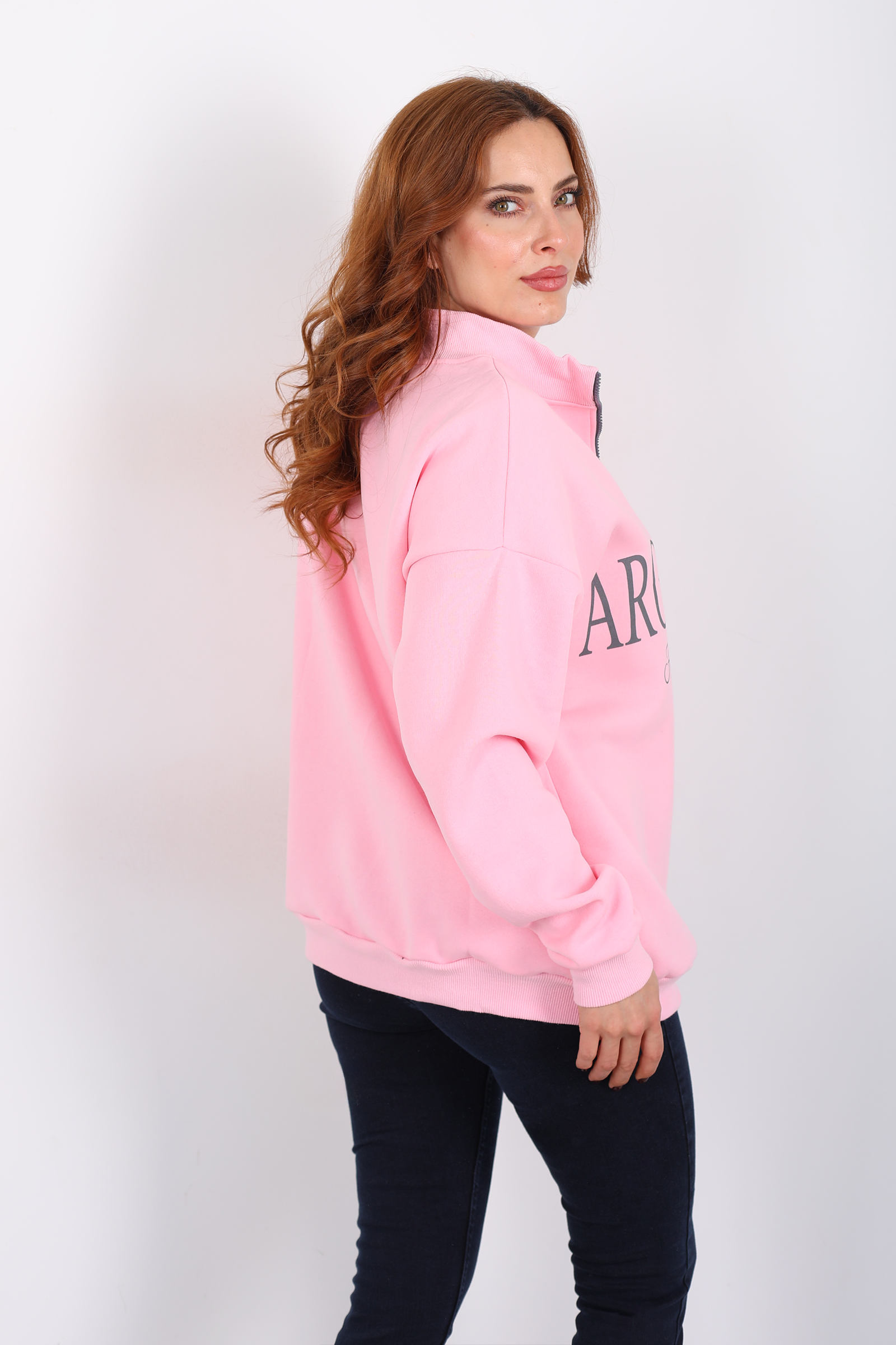 Dik Yaka Yarım Fermuarlı Pembe Kadın Baskılı Sweat
