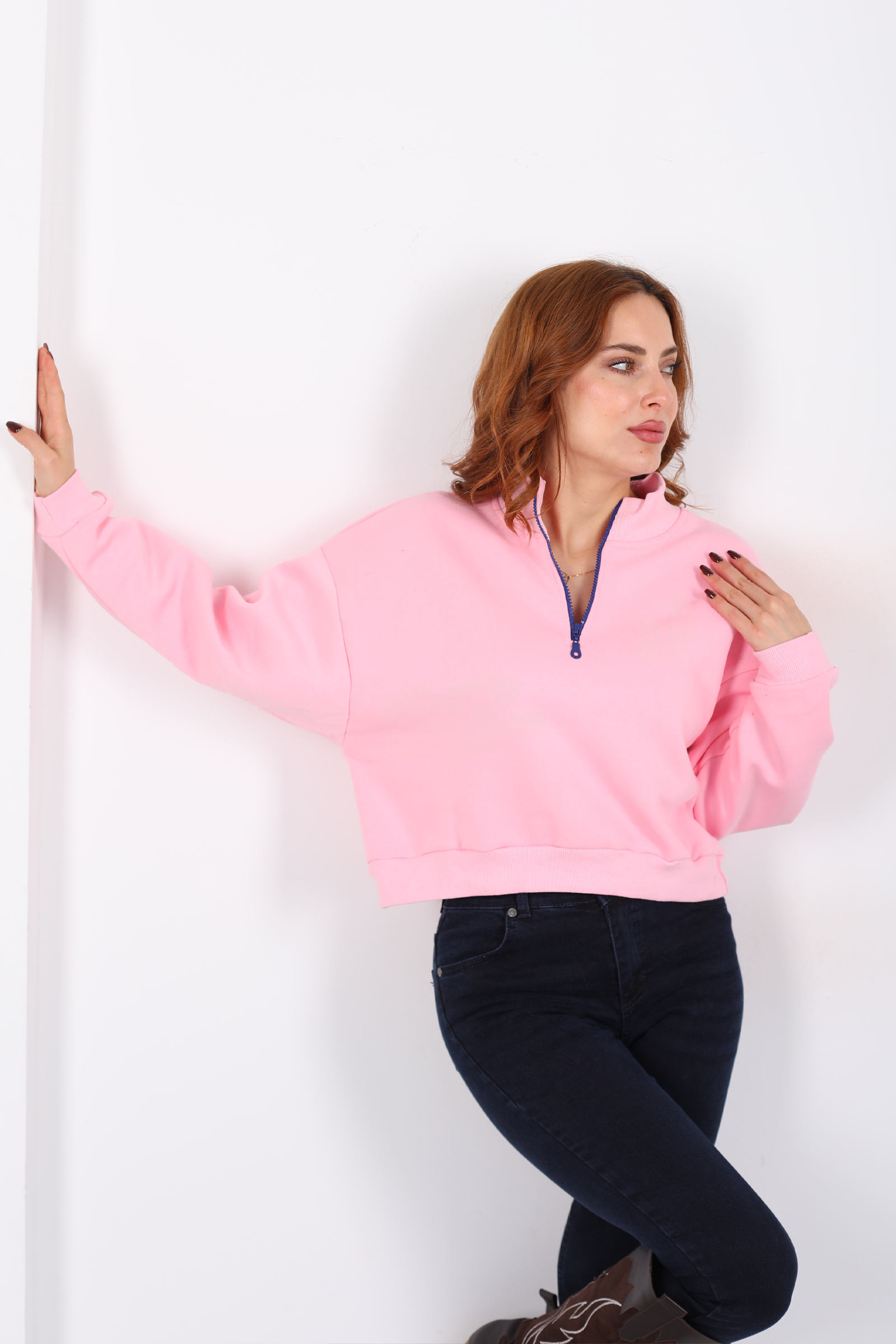 Dik Yaka Yarım Fermuarlı Pembe Kadın Üç İp Sweat