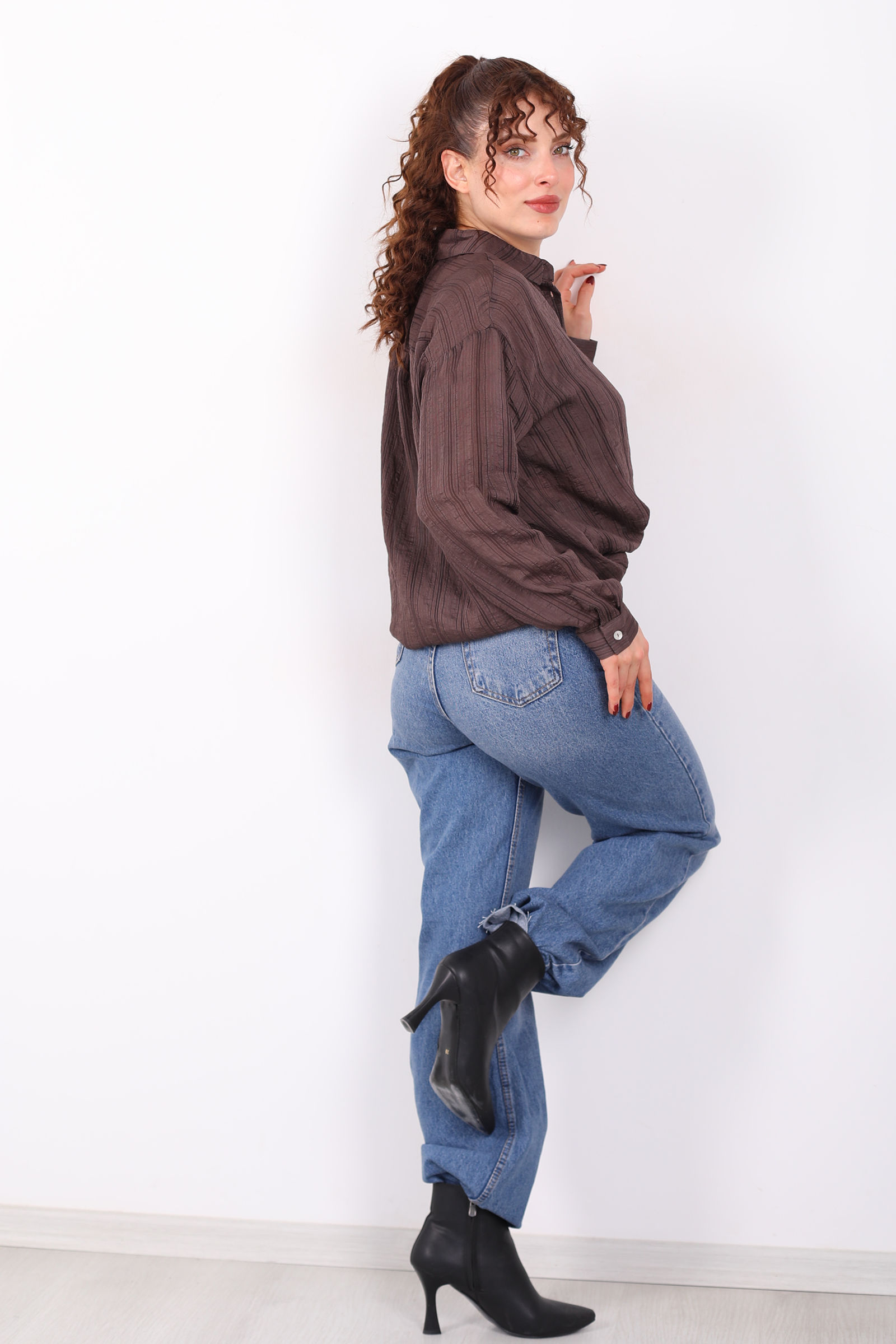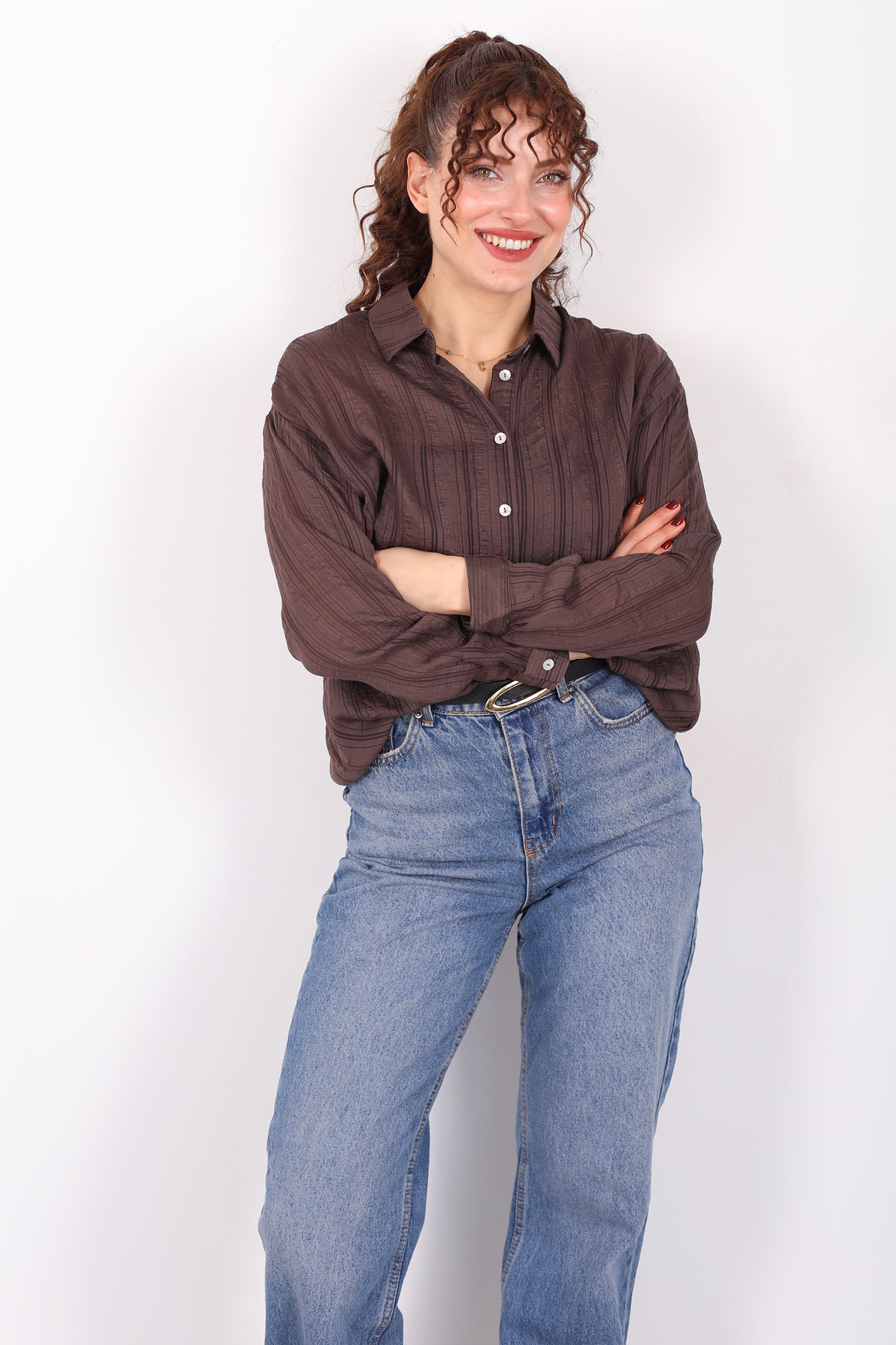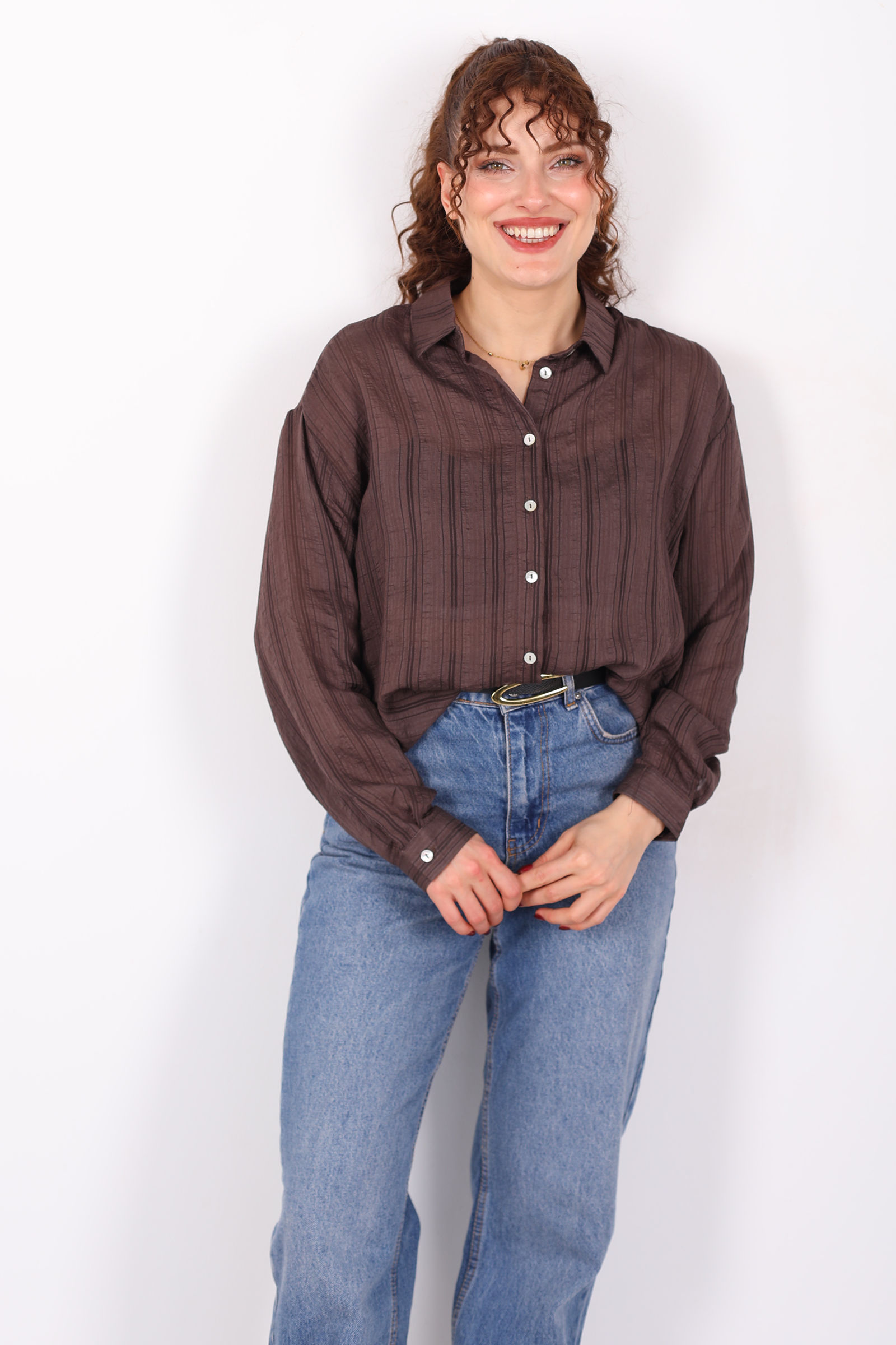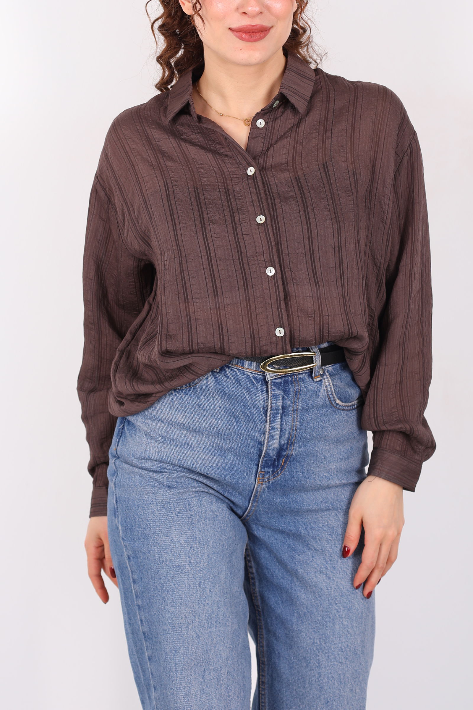 Trendlerin ötesine geçen rahat şıklık: dokulu oversize hafif transparan kadın kahverengi gömlek, günlük stiline zarif bir dokunuş eklemek isteyenlerin favorisi olacak. Kahverenginin sıcak ve doğal tonu, hafif transparan dokusuyla birleşerek ferah ve modern bir görünüm yaratır. Oversize kesimi, gömleğe salaş ama şık bir ifade kazandırırken rahat kullanım sağlar.