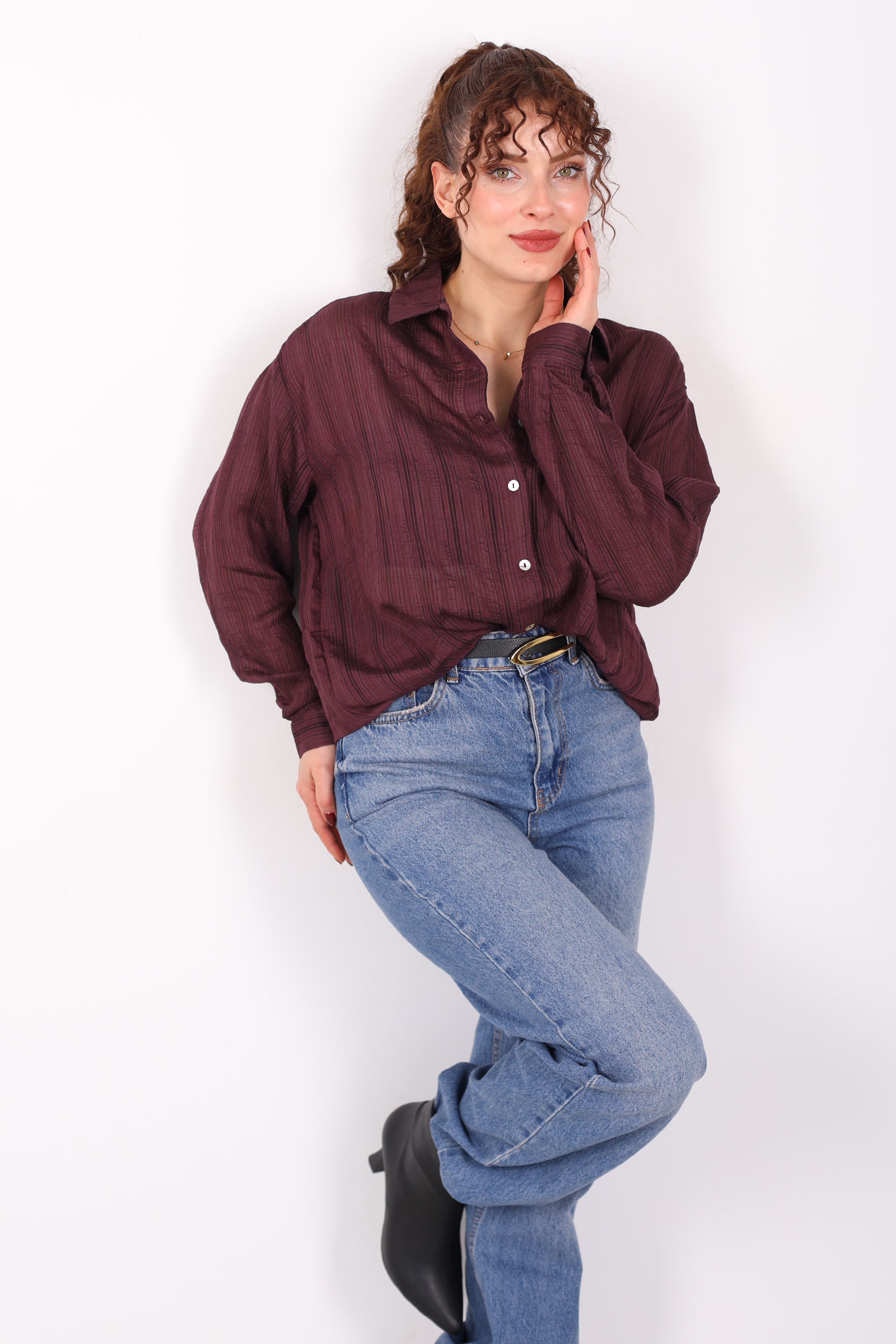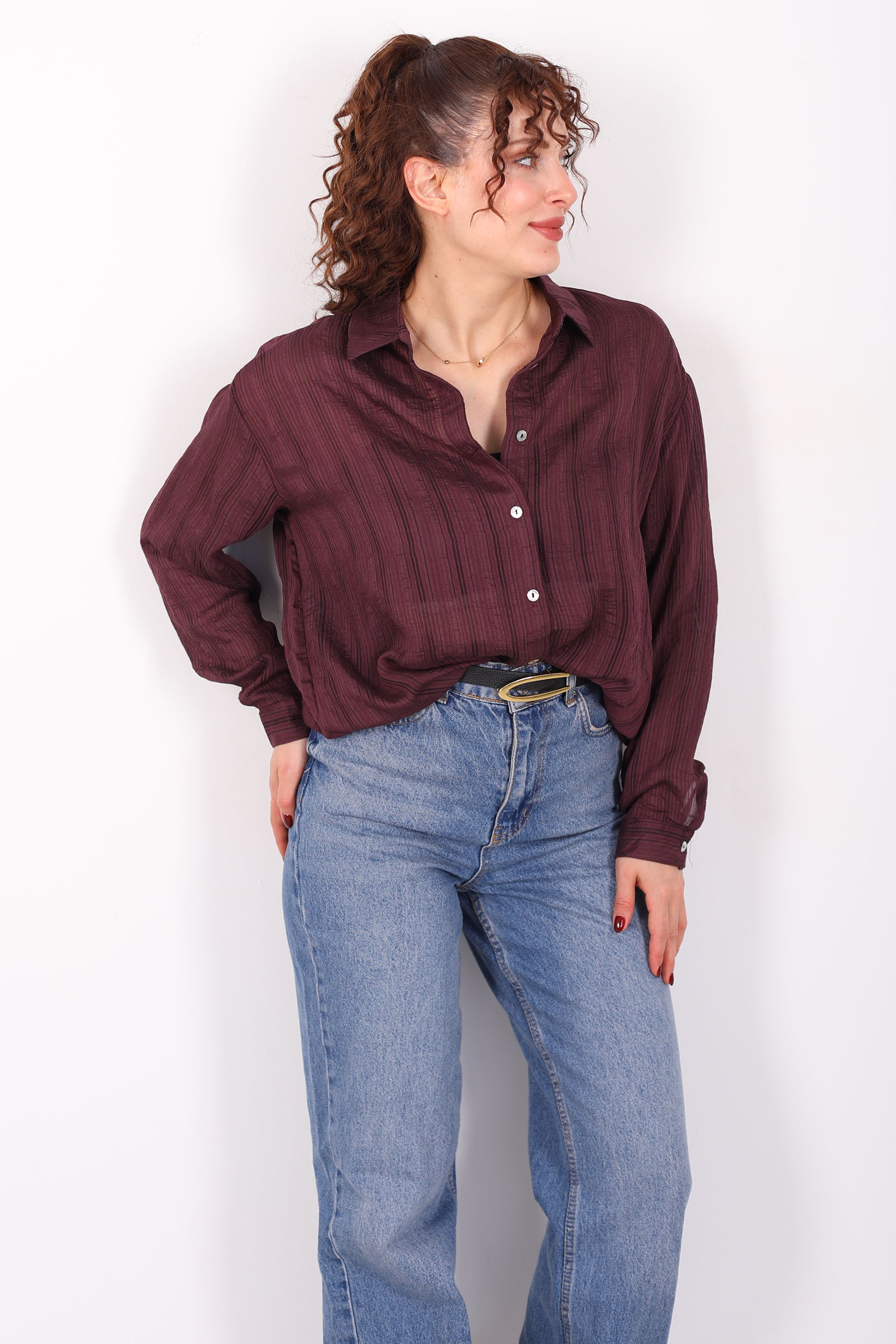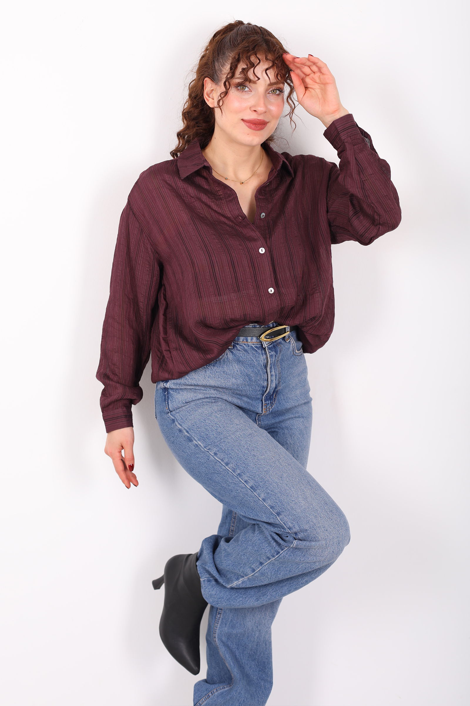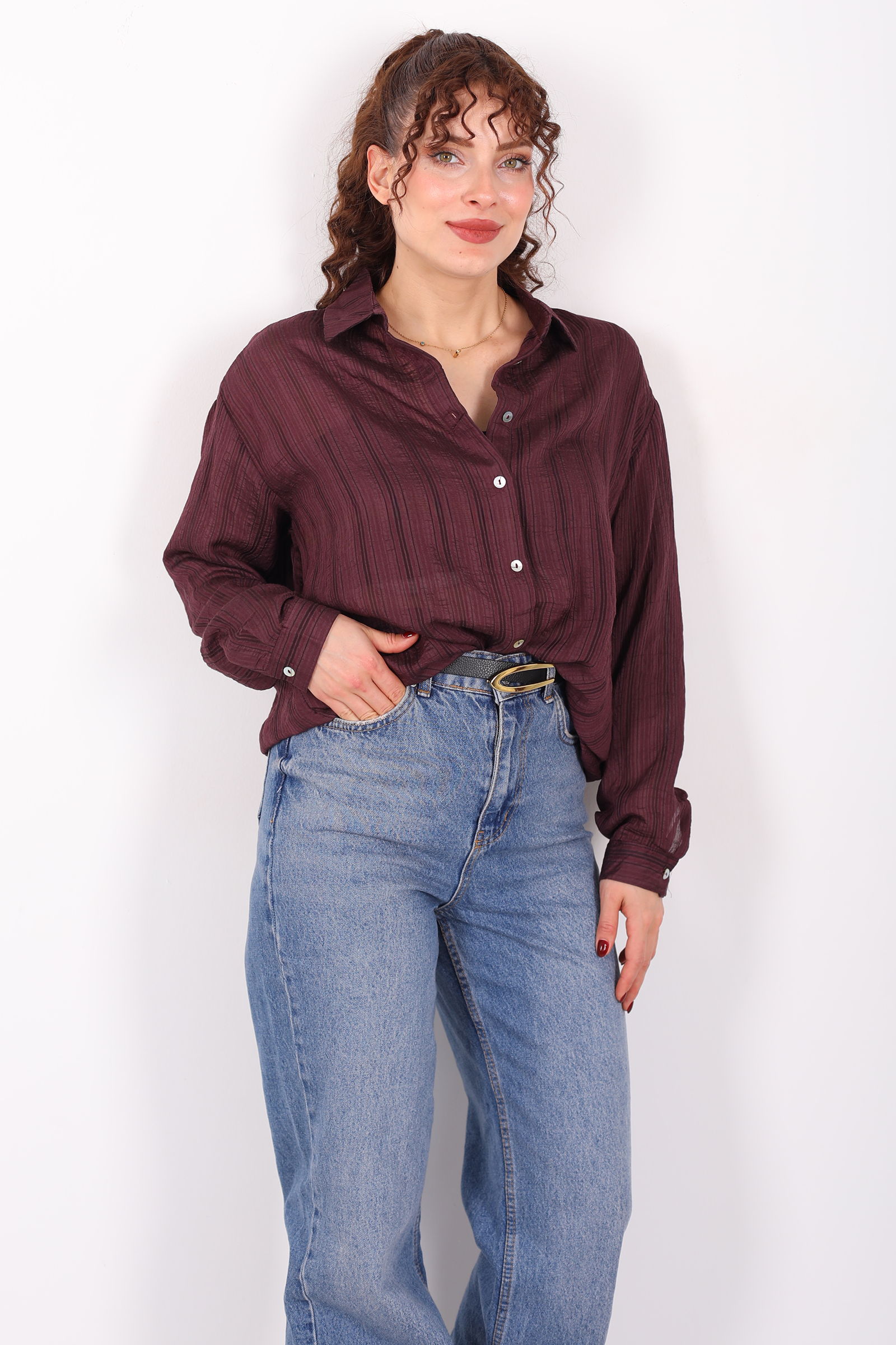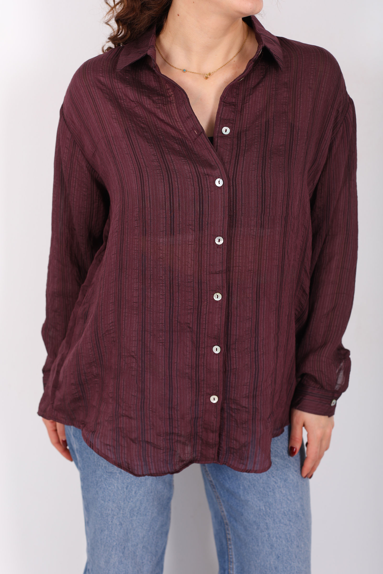 Zarafetin trend kesimle buluştuğu dokulu oversize hafif transparan kadın mürdüm gömlek, stiline modern ve ferah bir dokunuş eklemek isteyenler için ideal bir seçenek. Derin mürdüm tonu, transparan ve dokulu yapısıyla sade kombinlere sofistike bir karakter kazandırır. Oversize kesimi sayesinde salaş ve rahat bir siluet sunarken, hafif dokusu gün boyu konfor sağlar.