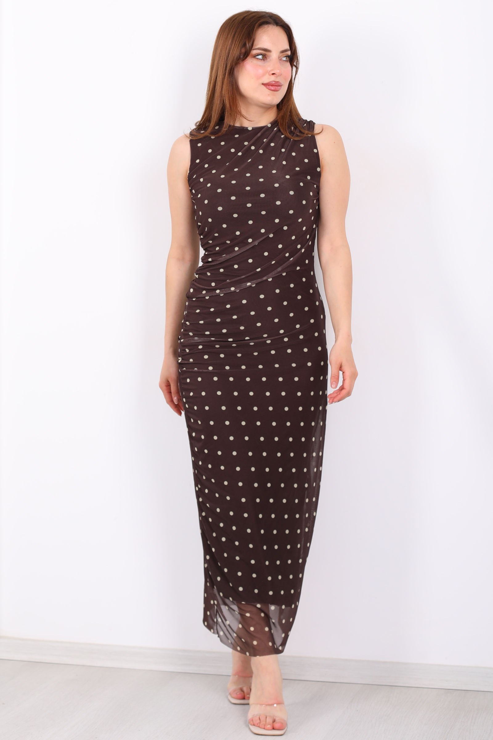 Drape Detaylı Puantiyeli Midi Kahverengi Kadın Tül Elbise