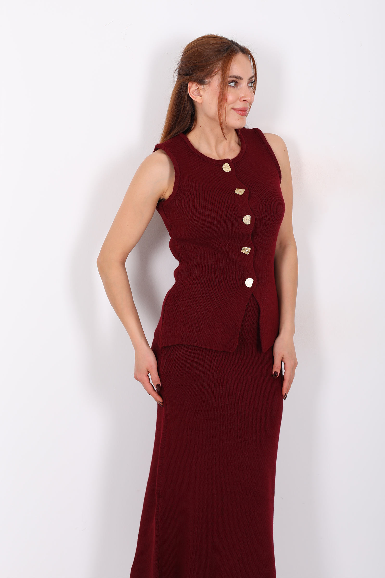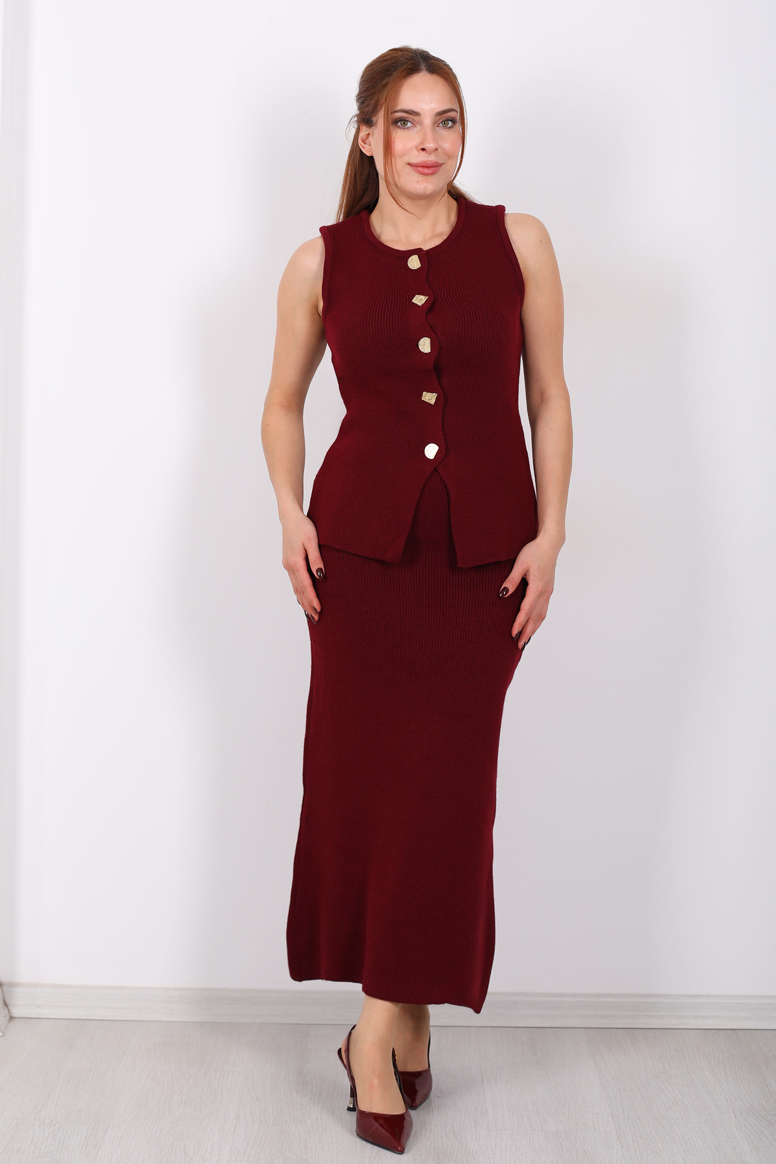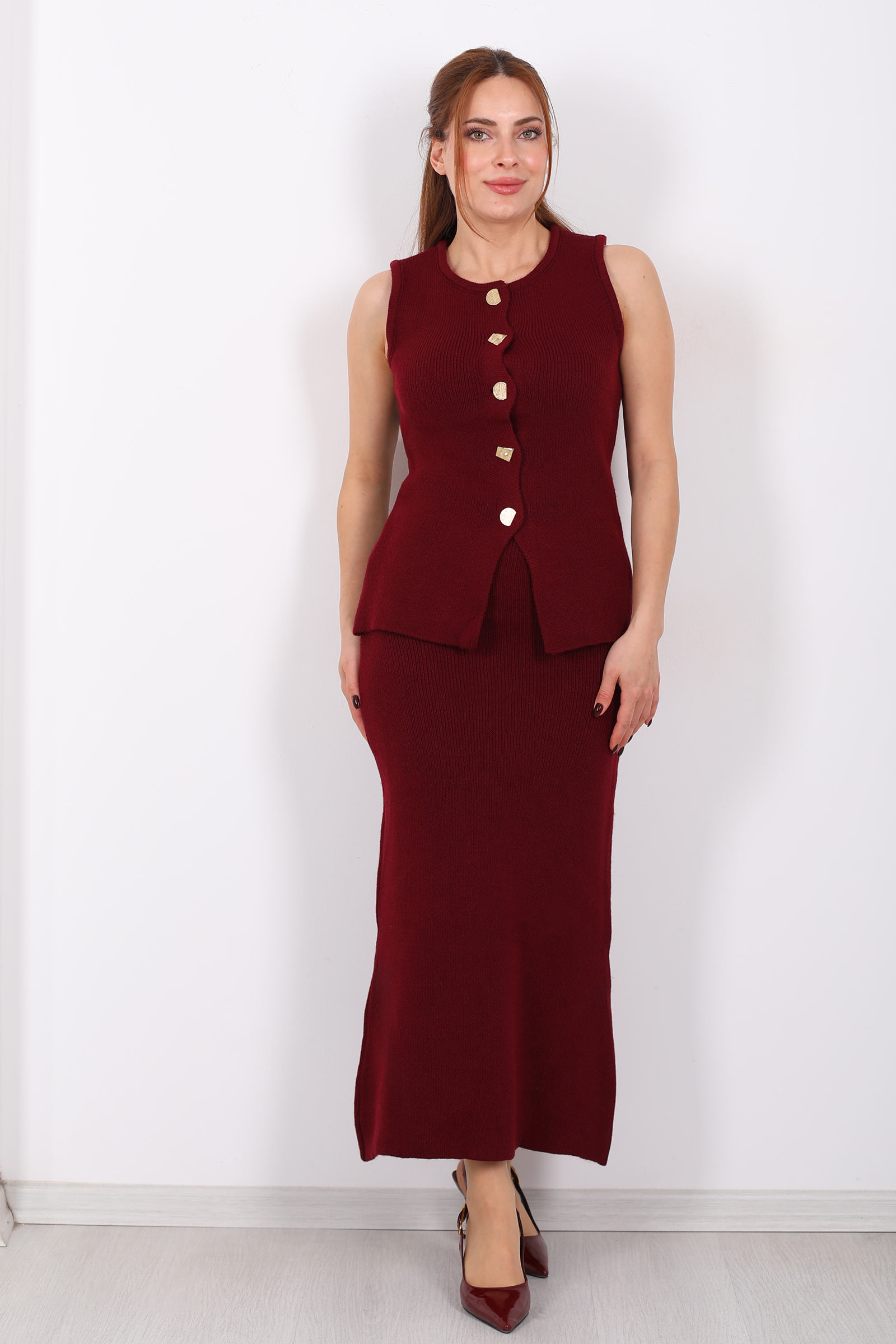 Düğme Aksesuarlı Kadın Bordo Etek Triko Takım