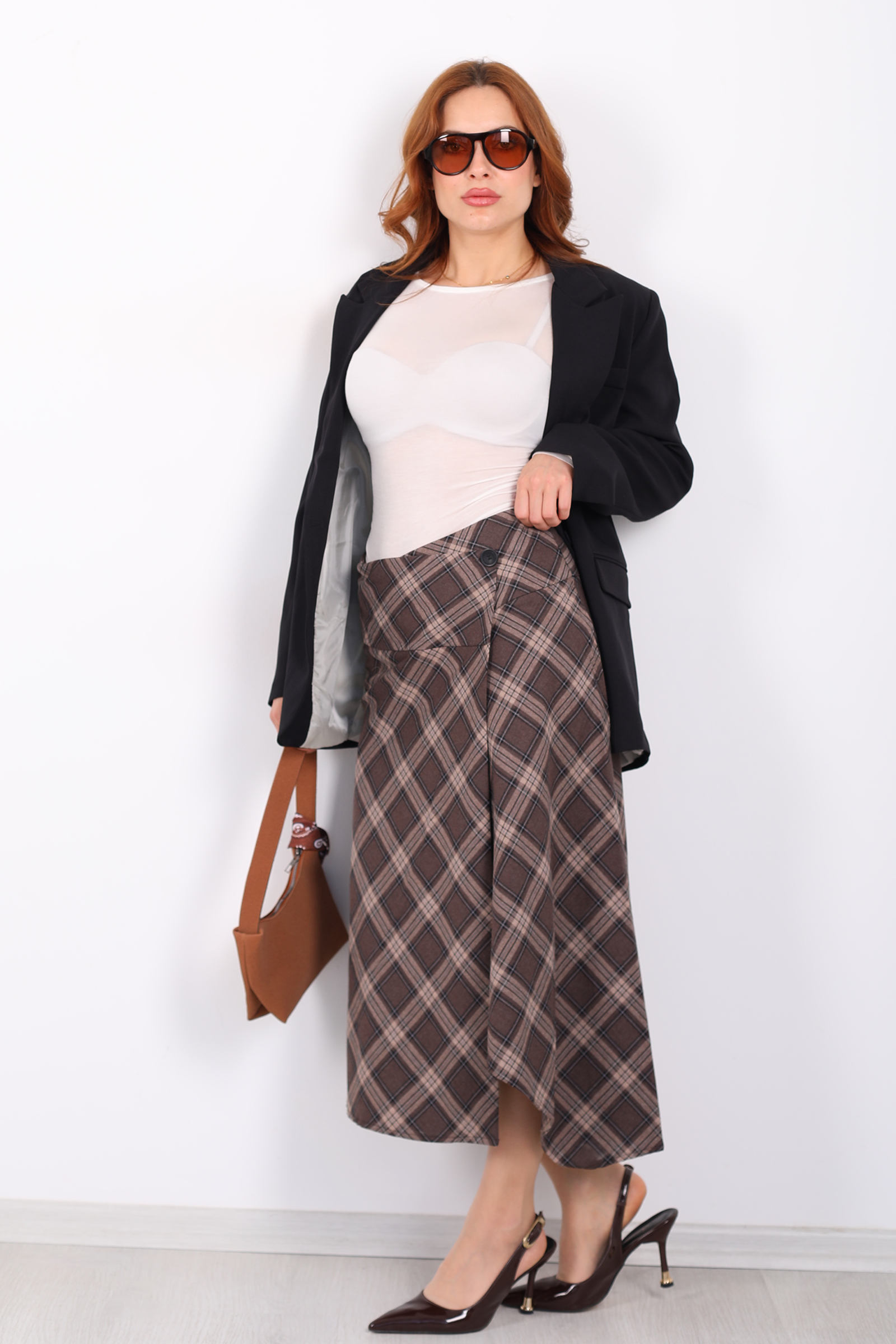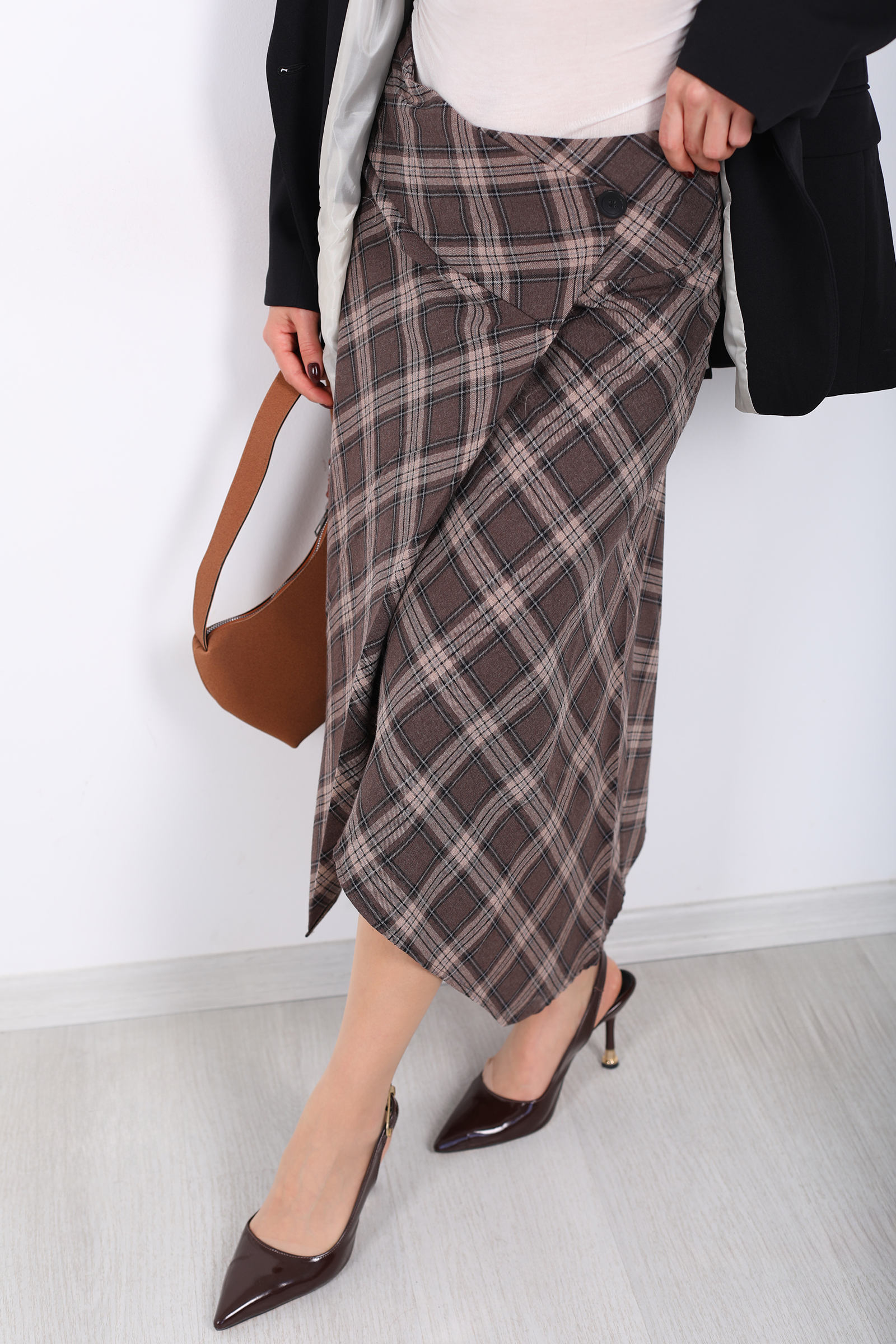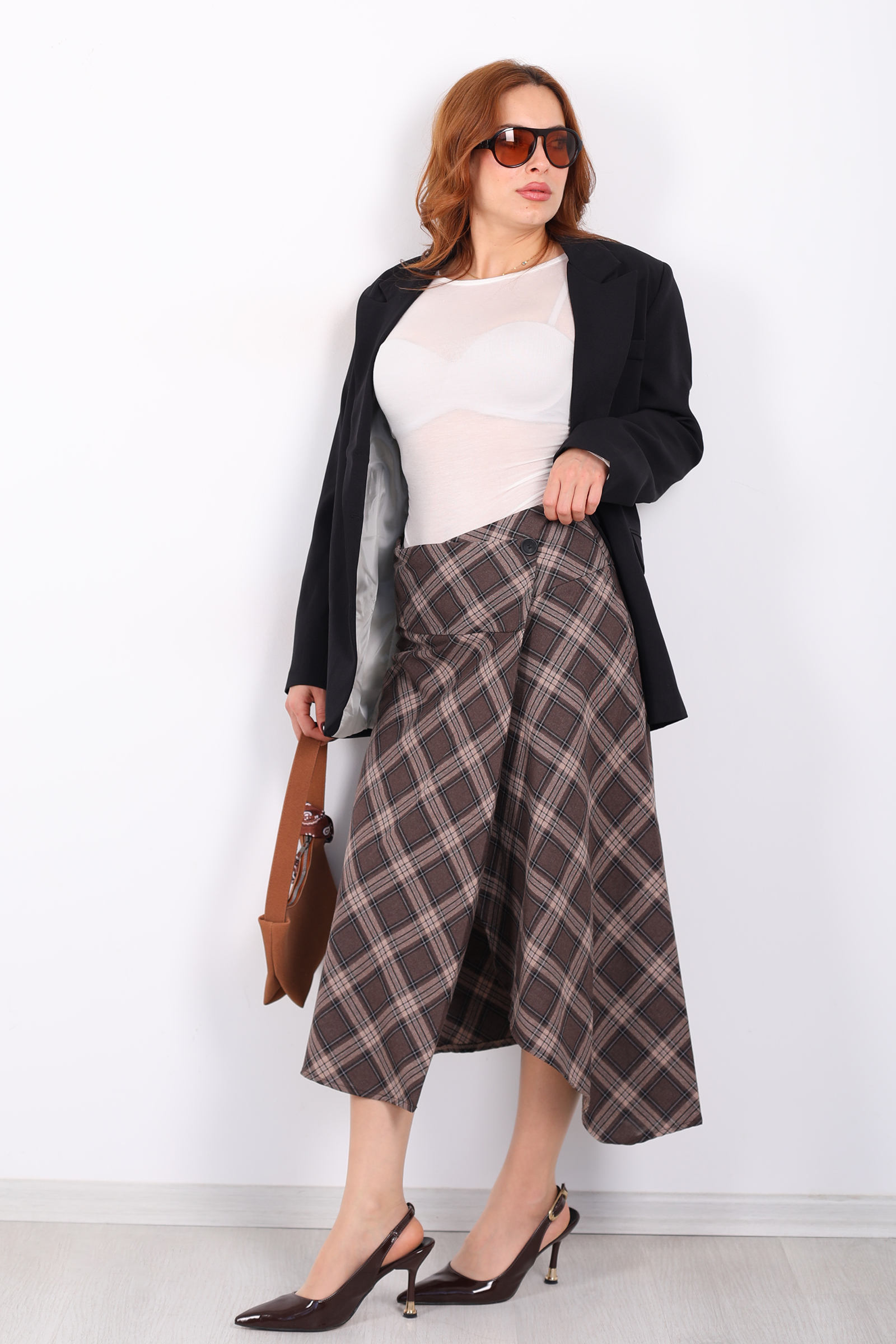 Düğme Kapamalı Ekose Kahverengi Kadın Midi Etek
