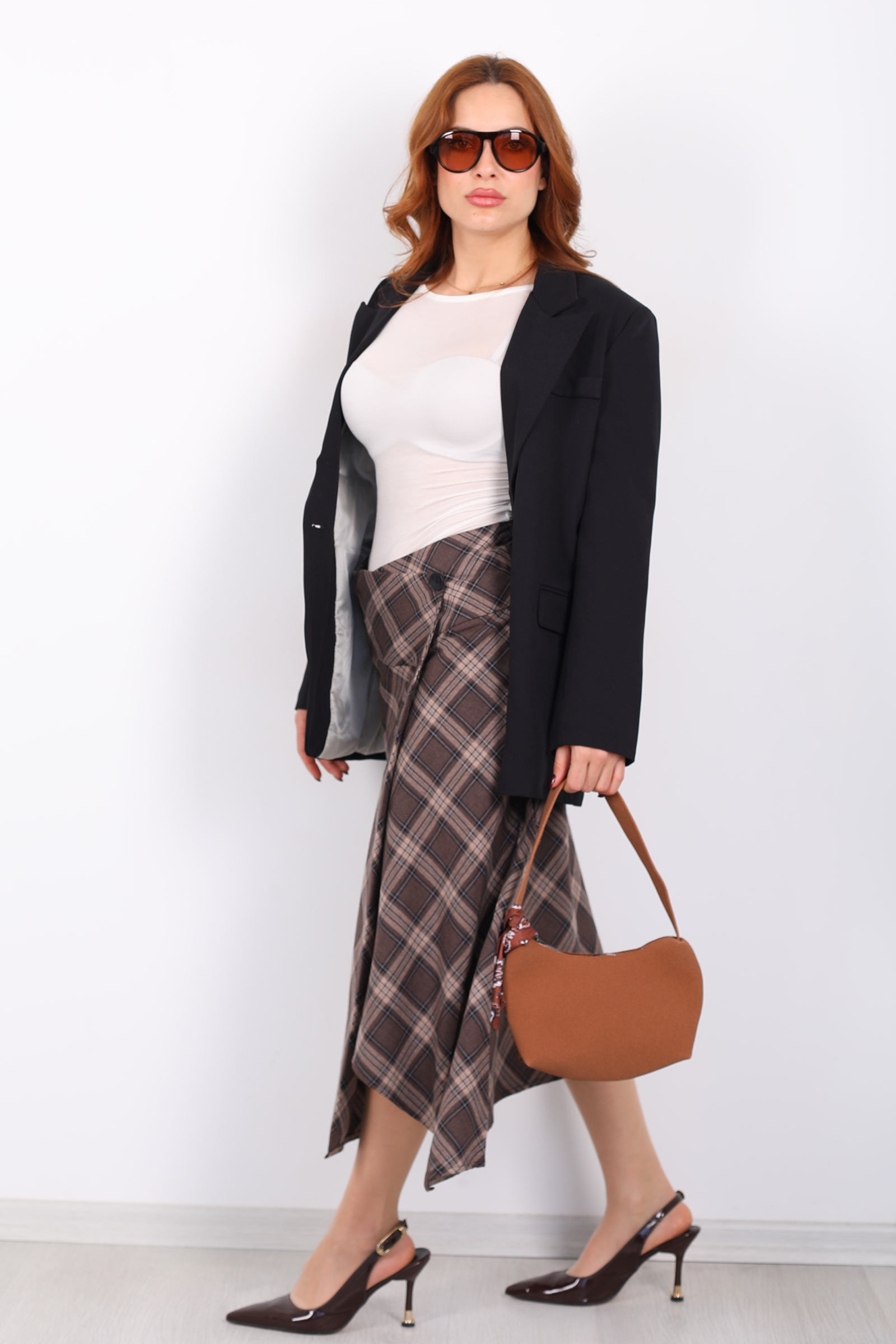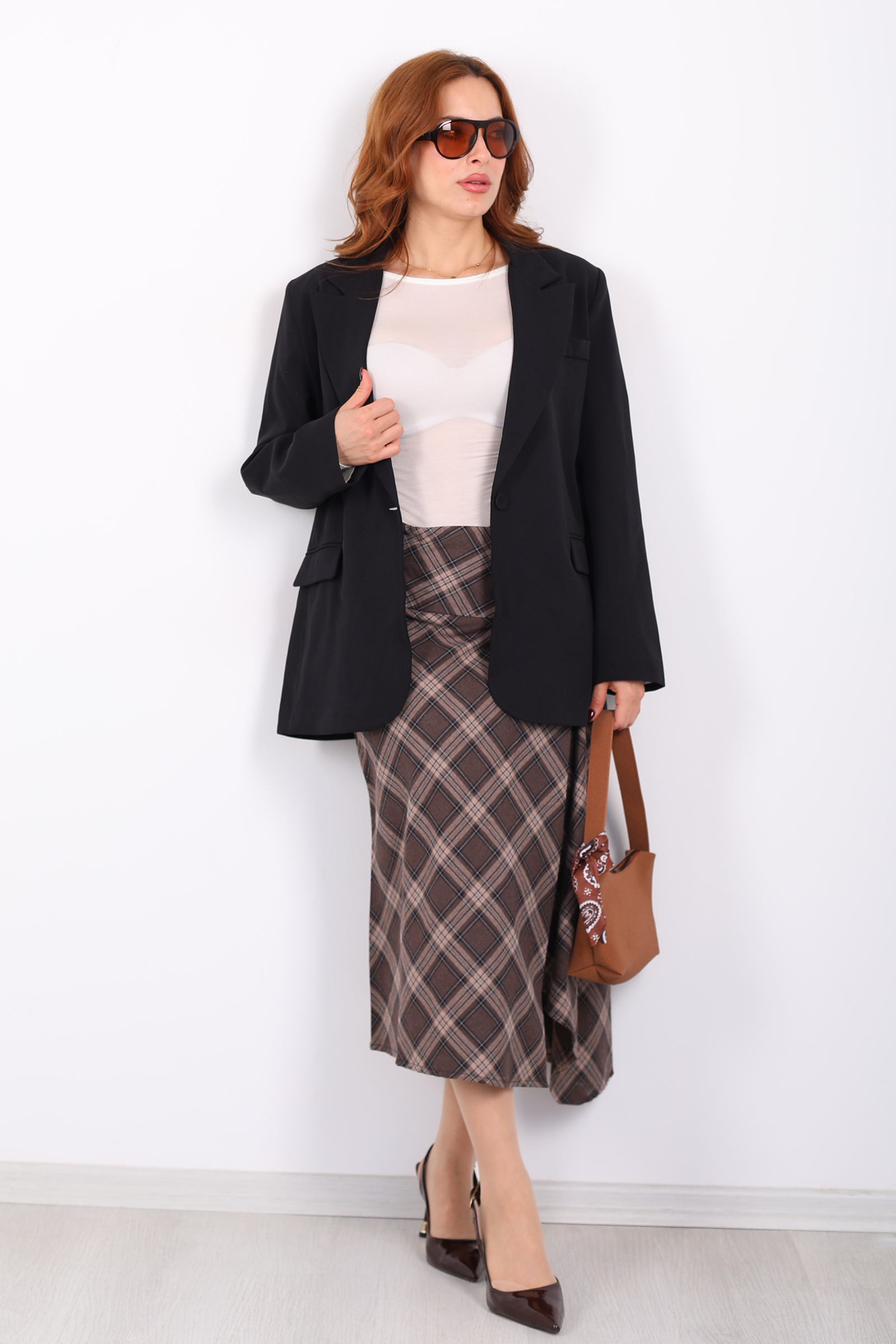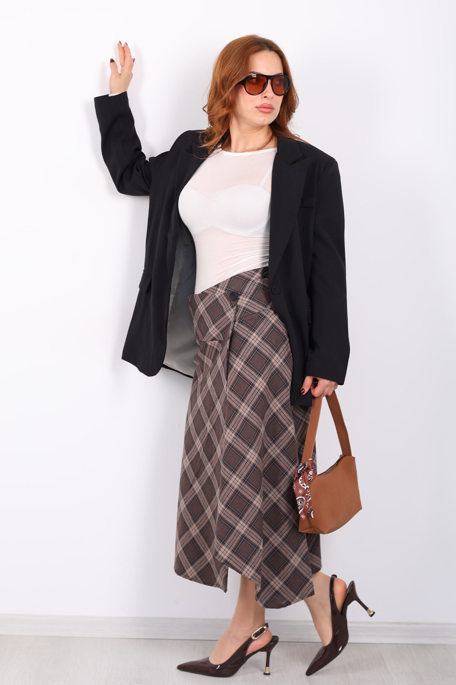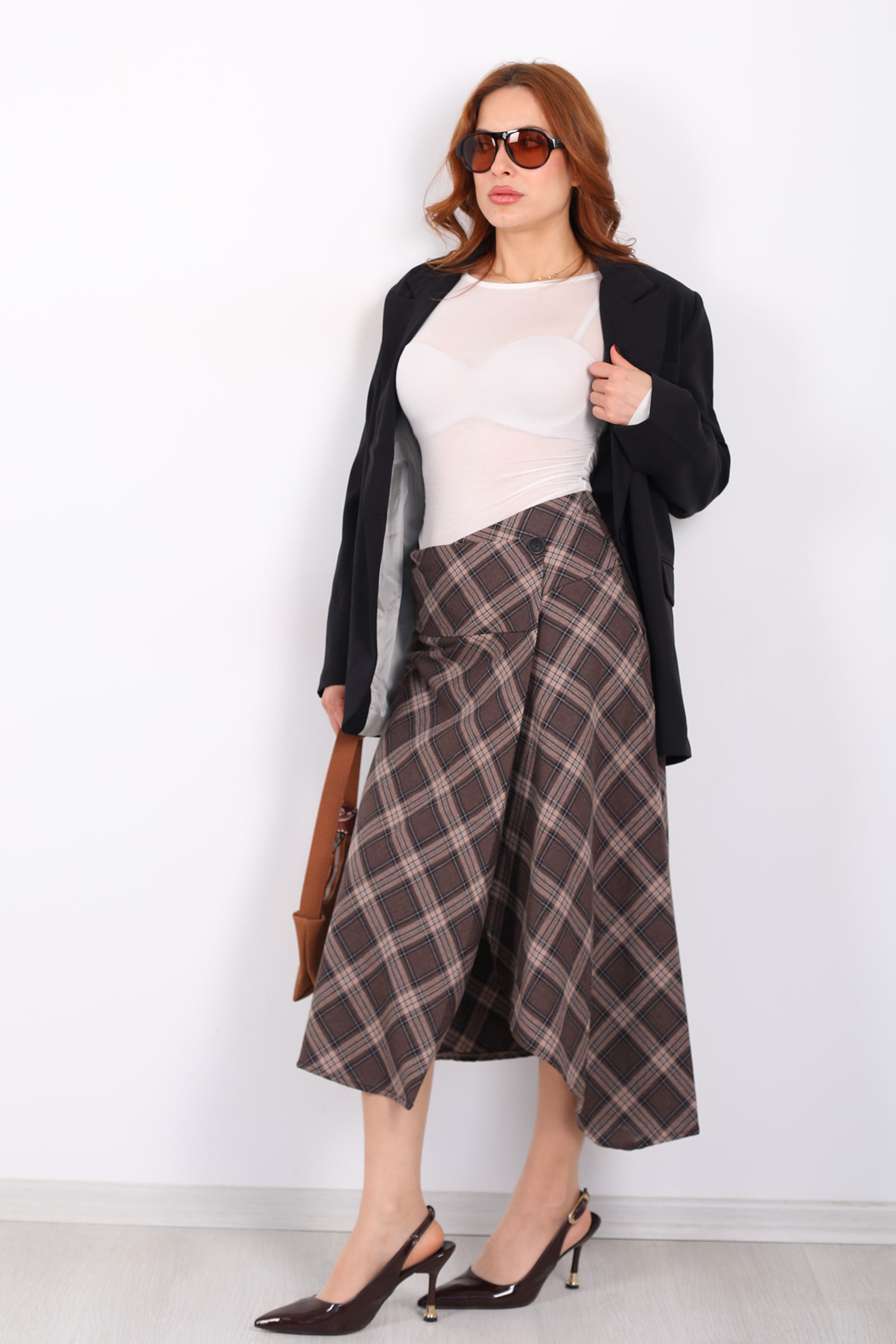 Düğme Kapamalı Ekose Kahverengi Kadın Midi Etek