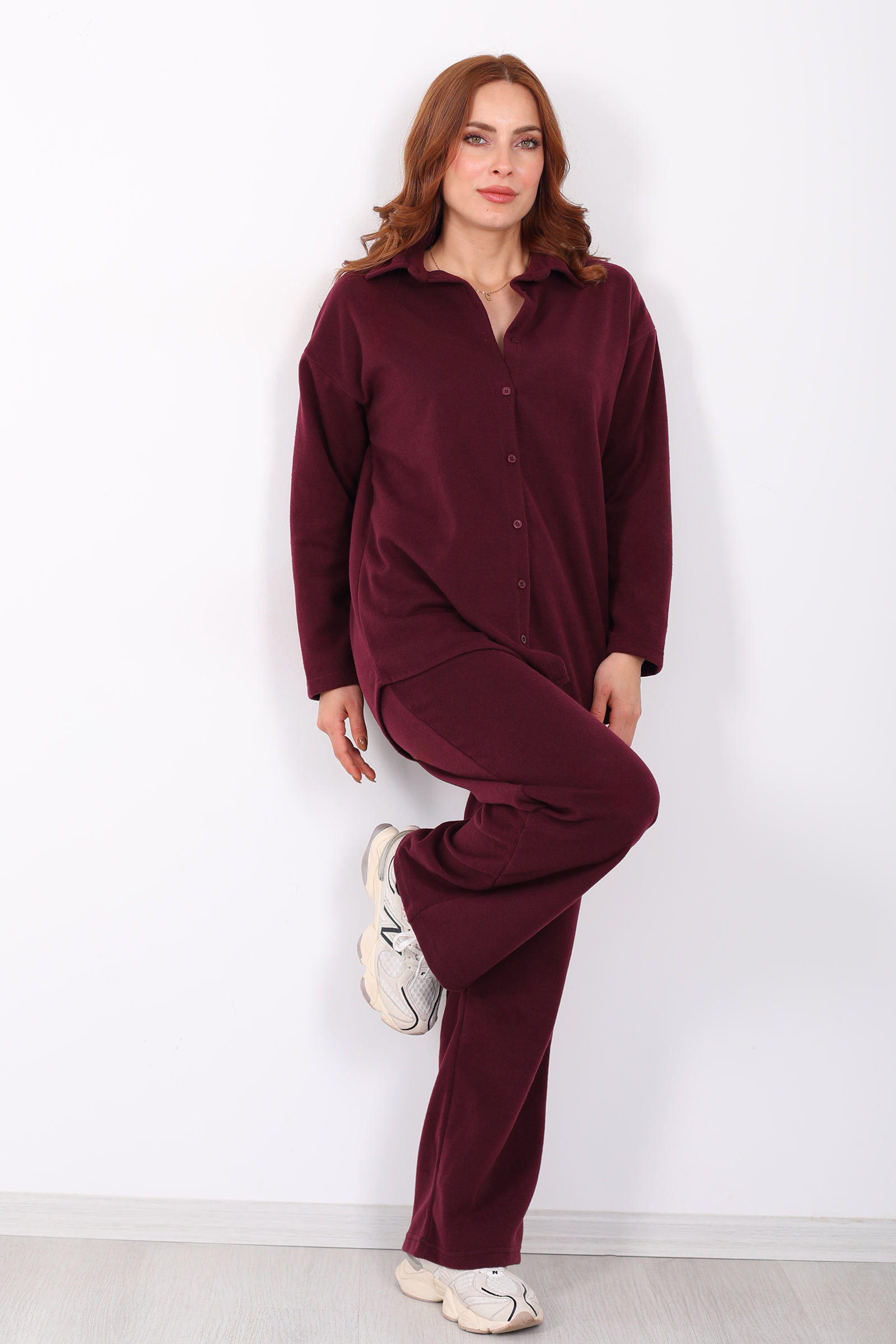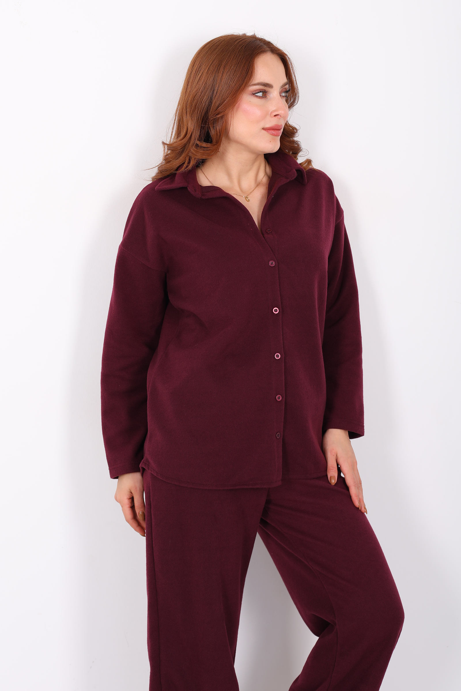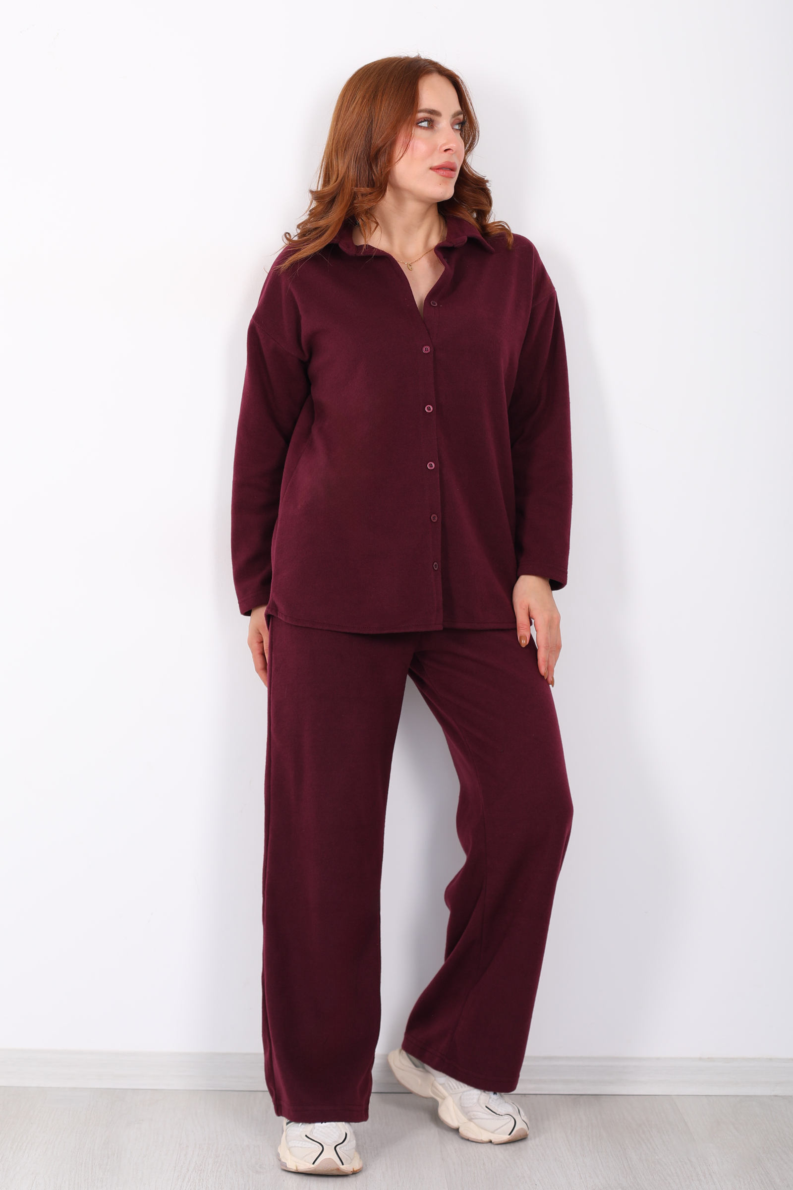 Düğmeli Bol Paça Bordo Kadın Selanik Takım