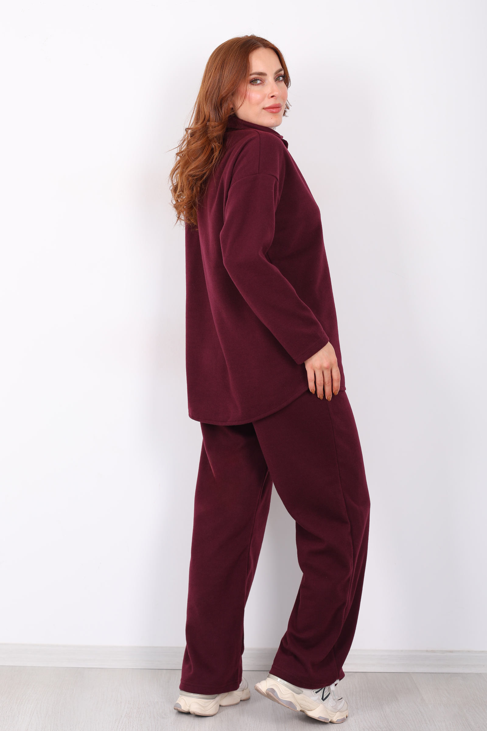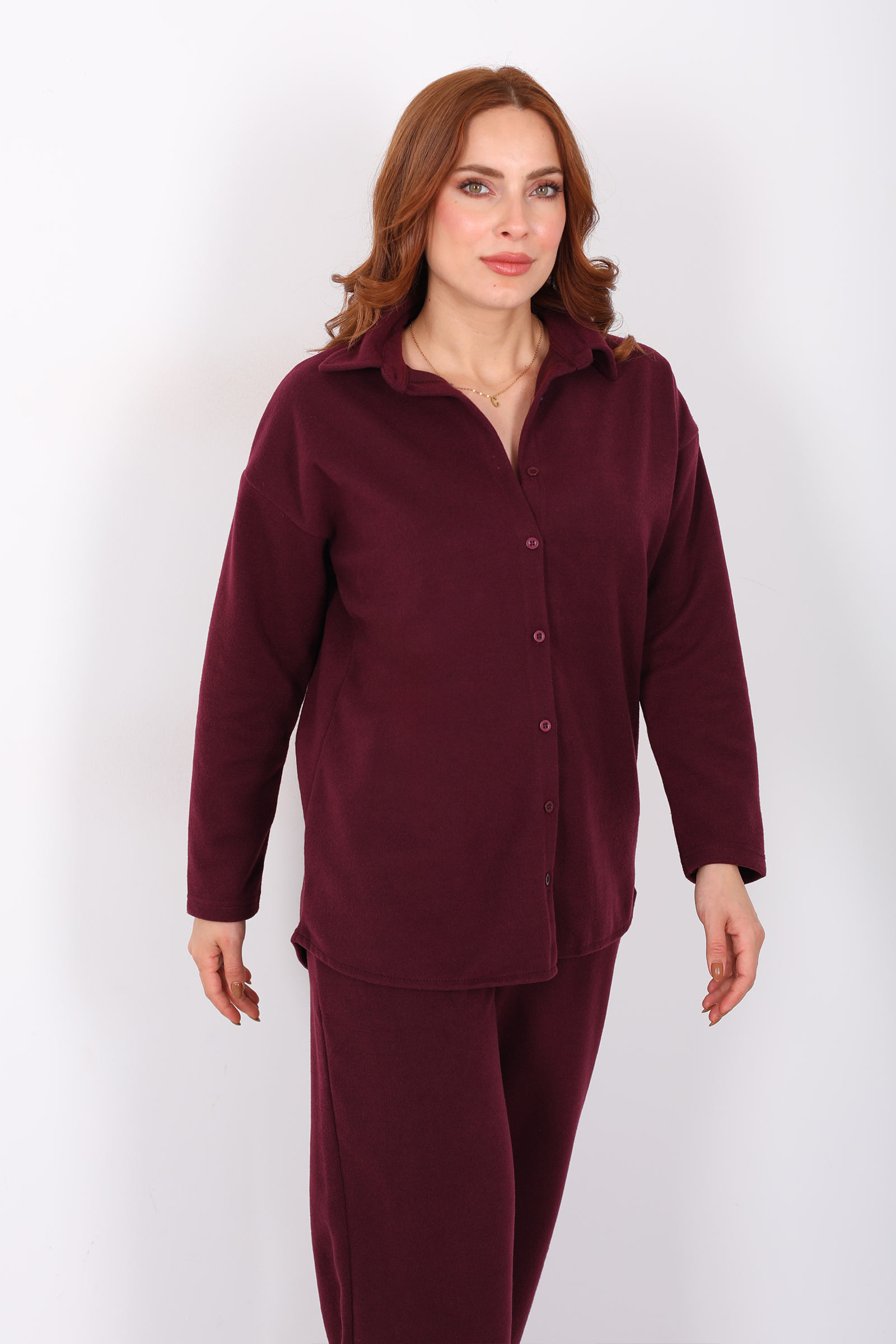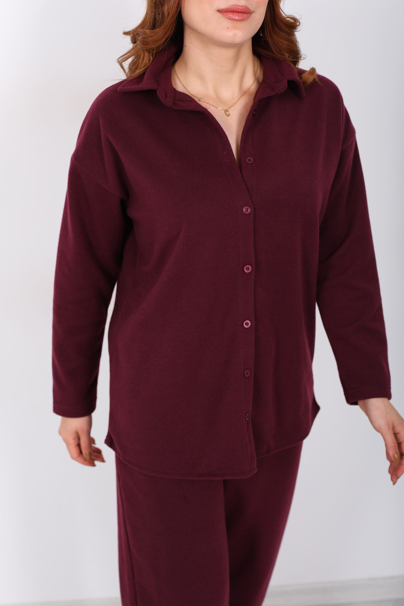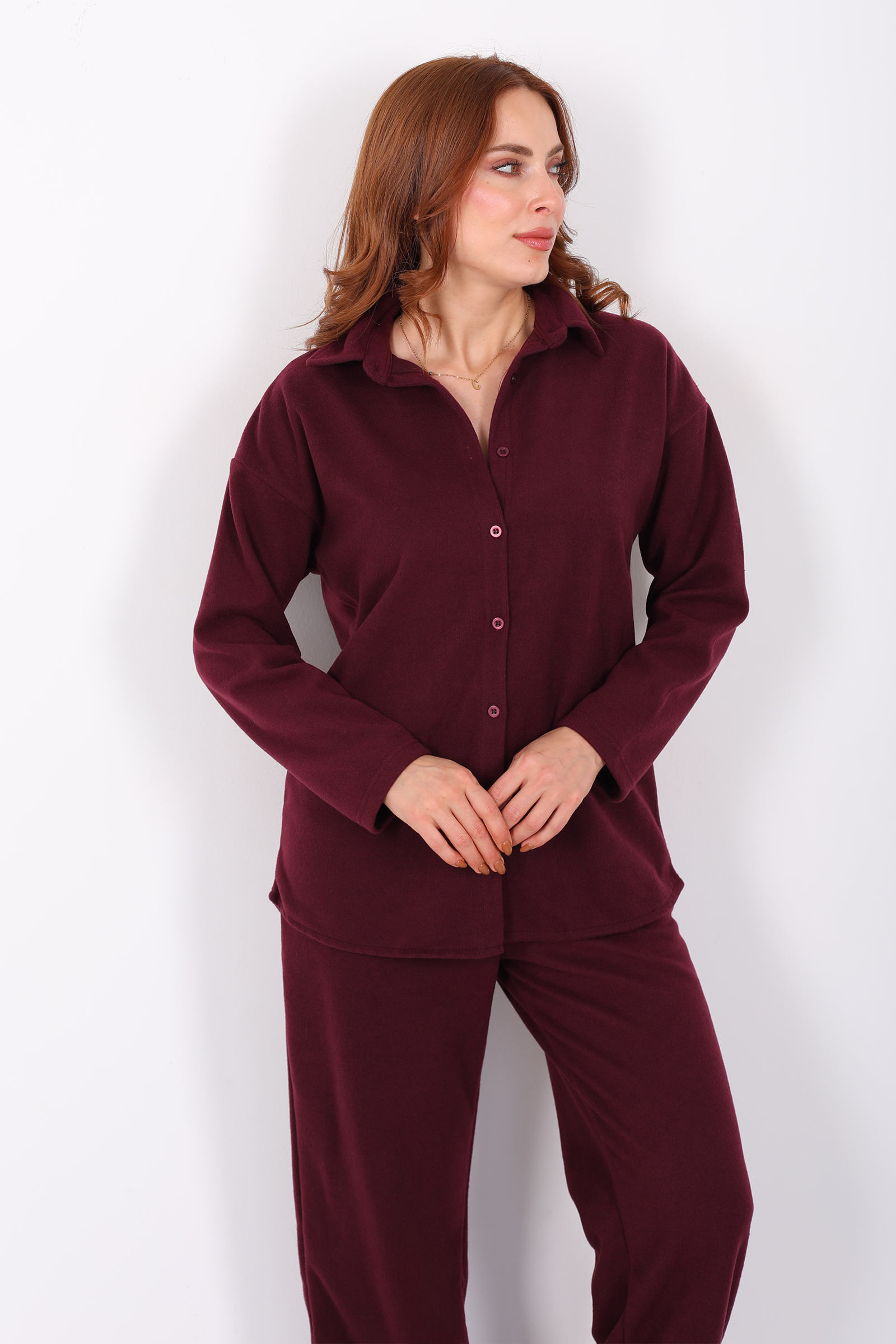 Düğmeli Bol Paça Bordo Kadın Selanik Takım