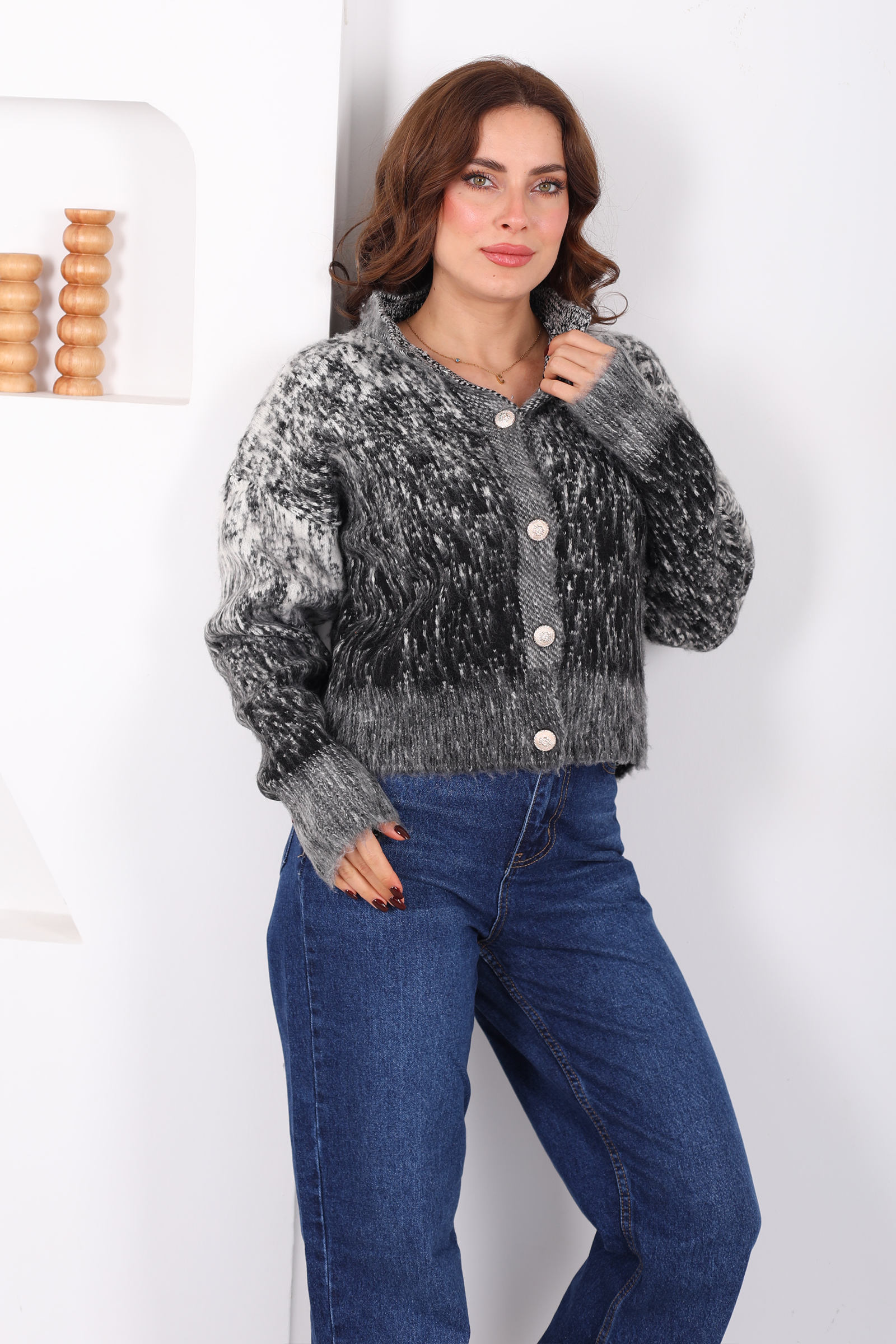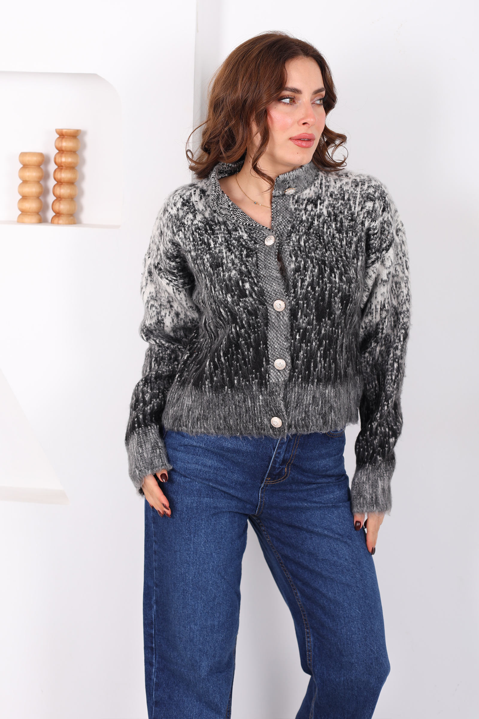 Düğmeli Desenli Füme Kadın Triko Ceket