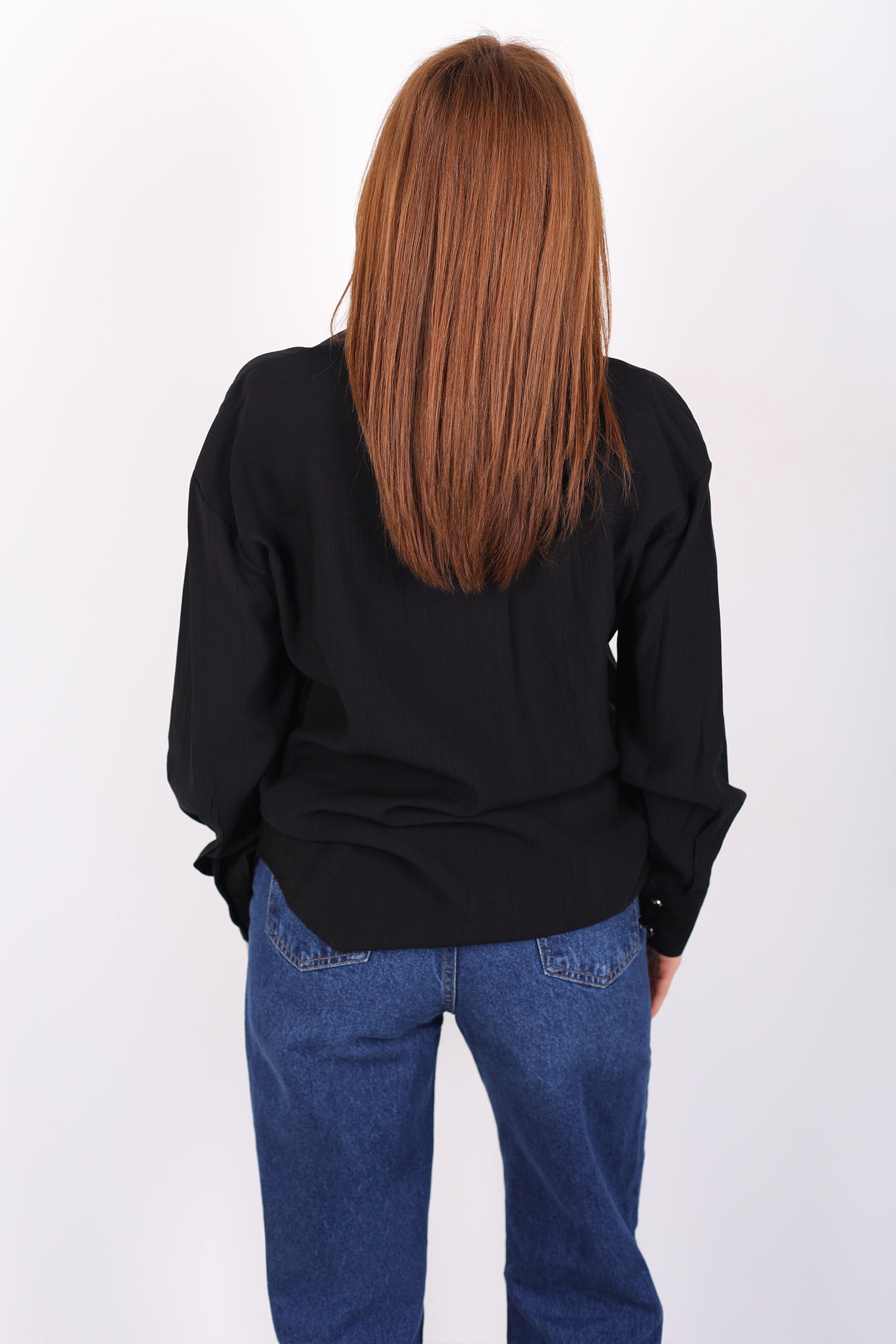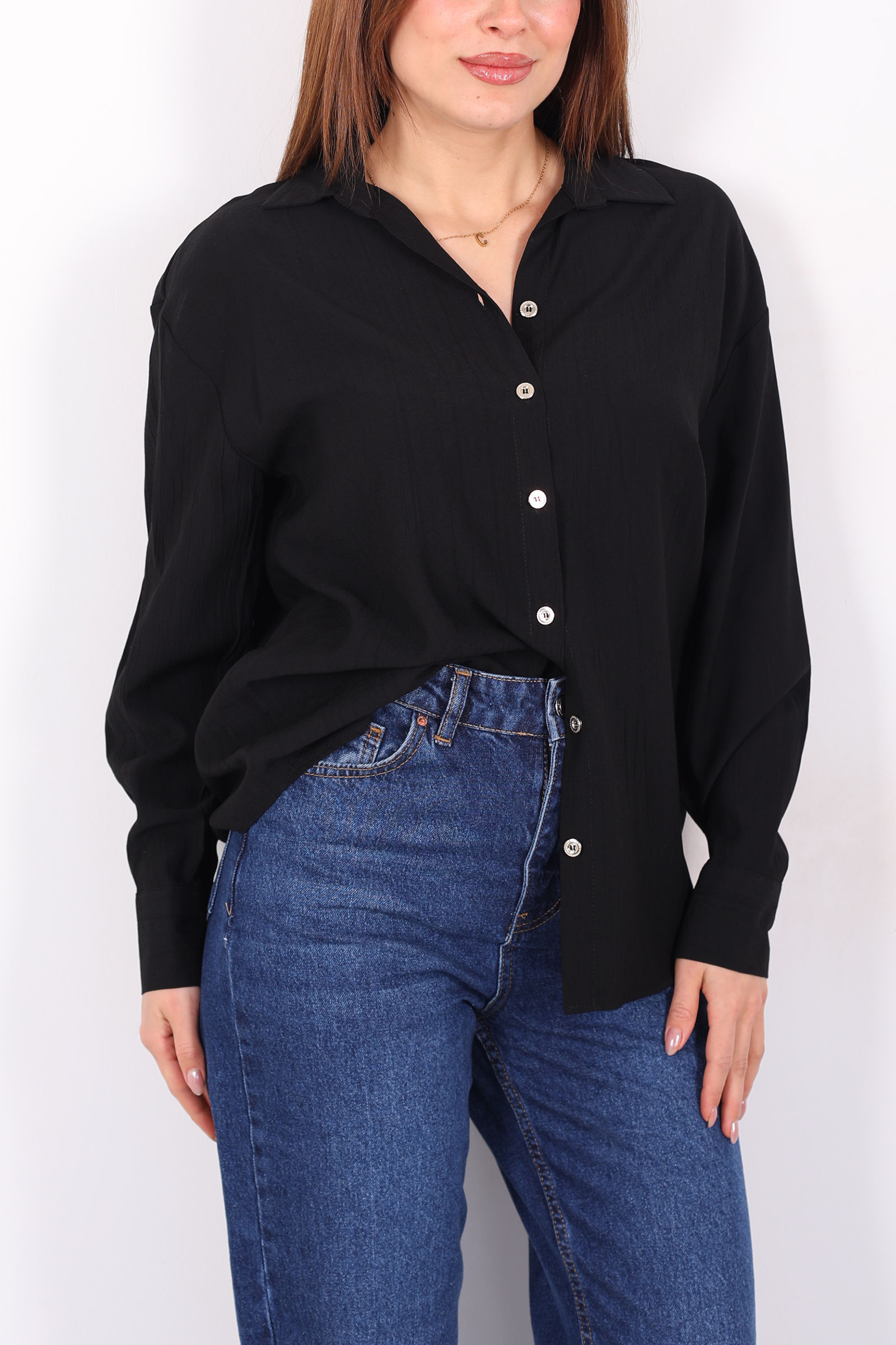Siyah düğmeli dokulu oversize gömlek, şıklığı ve rahatlığı birleştirerek stilinize modern bir dokunuş katar. Gömleğin dokulu kumaşı, ona sofistike bir hava katarken, oversize kesimi rahatlık ve hareket özgürlüğü sunar. Düğme detayları, gömleğe klasik bir şıklık katarken, siyah rengi ise her ten rengiyle uyum sağlar ve her durumda zarif bir görünüm sunar. Bu gömlek, jean, etek veya pantolonlarla mükemmel uyum sağlar ve her türlü kombine zarif bir dokunuş ekler.