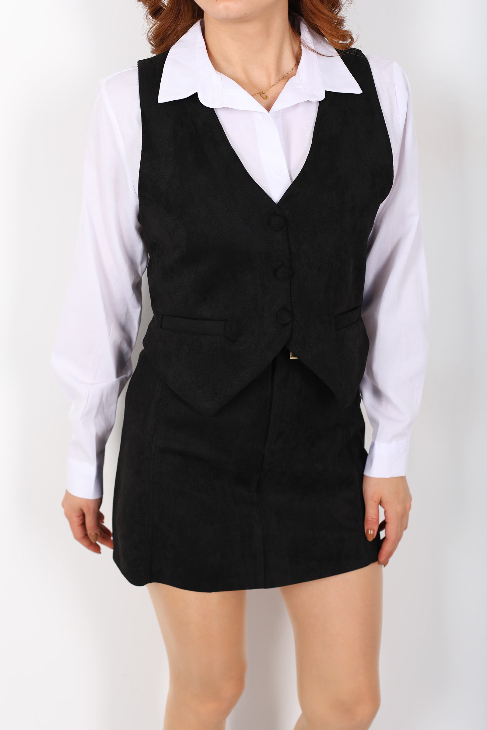Keten Görünümlü Düğmeli Siyah Kadın Yelek