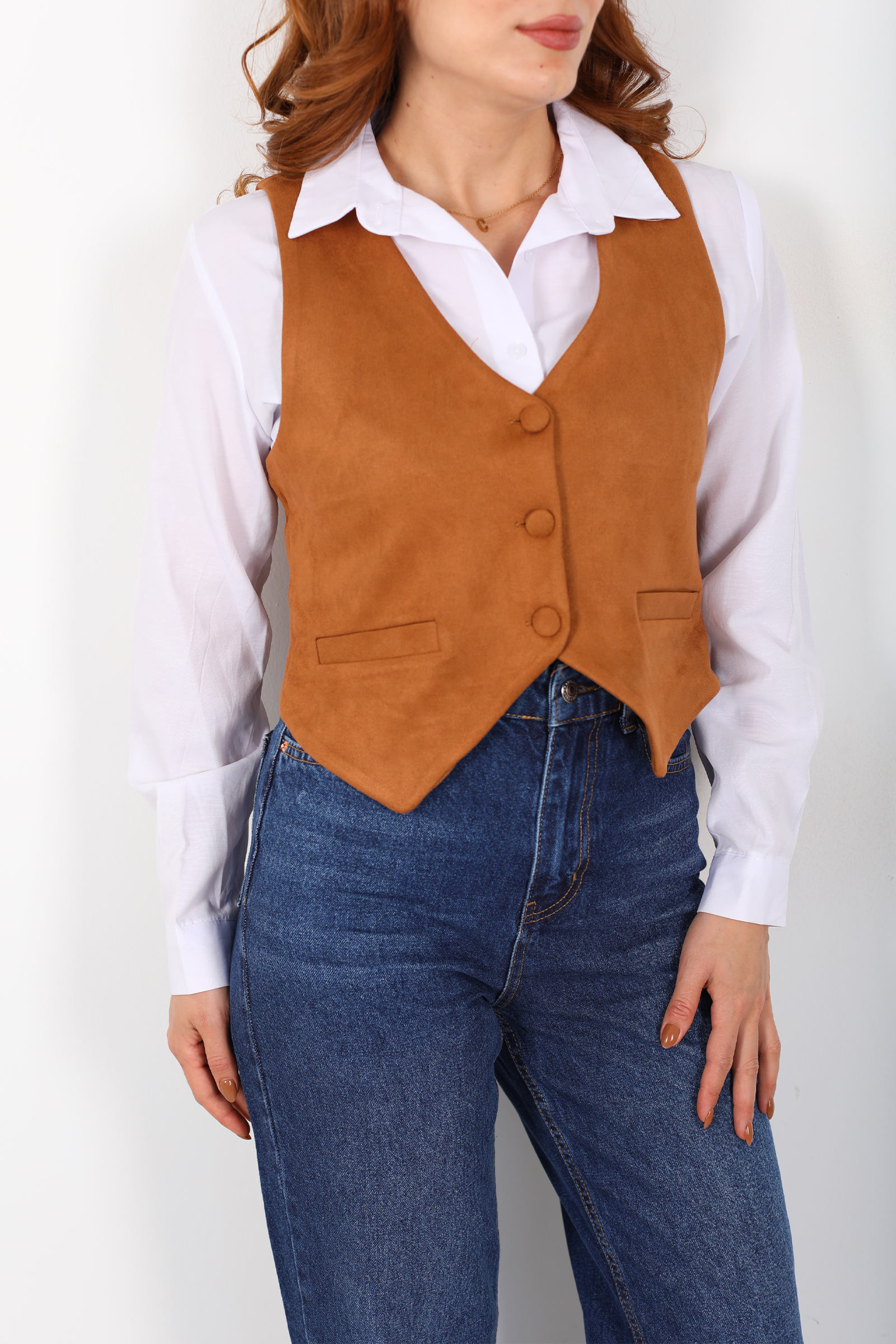 Fermuarlı Kolsuz Acı Kahve Kadın Deri Yelek