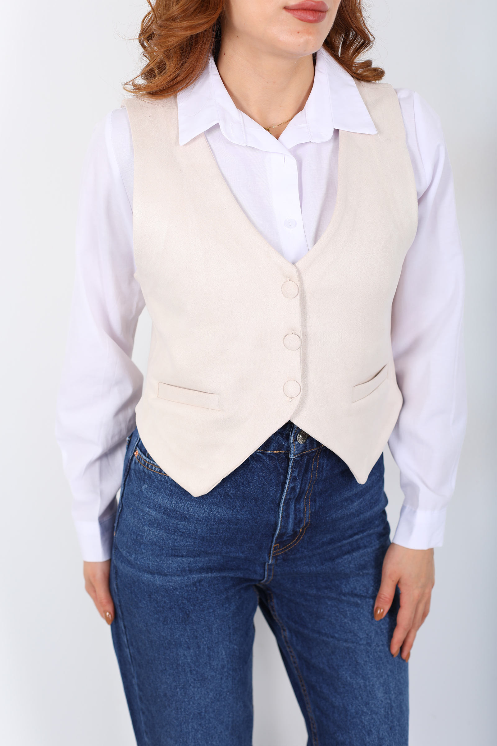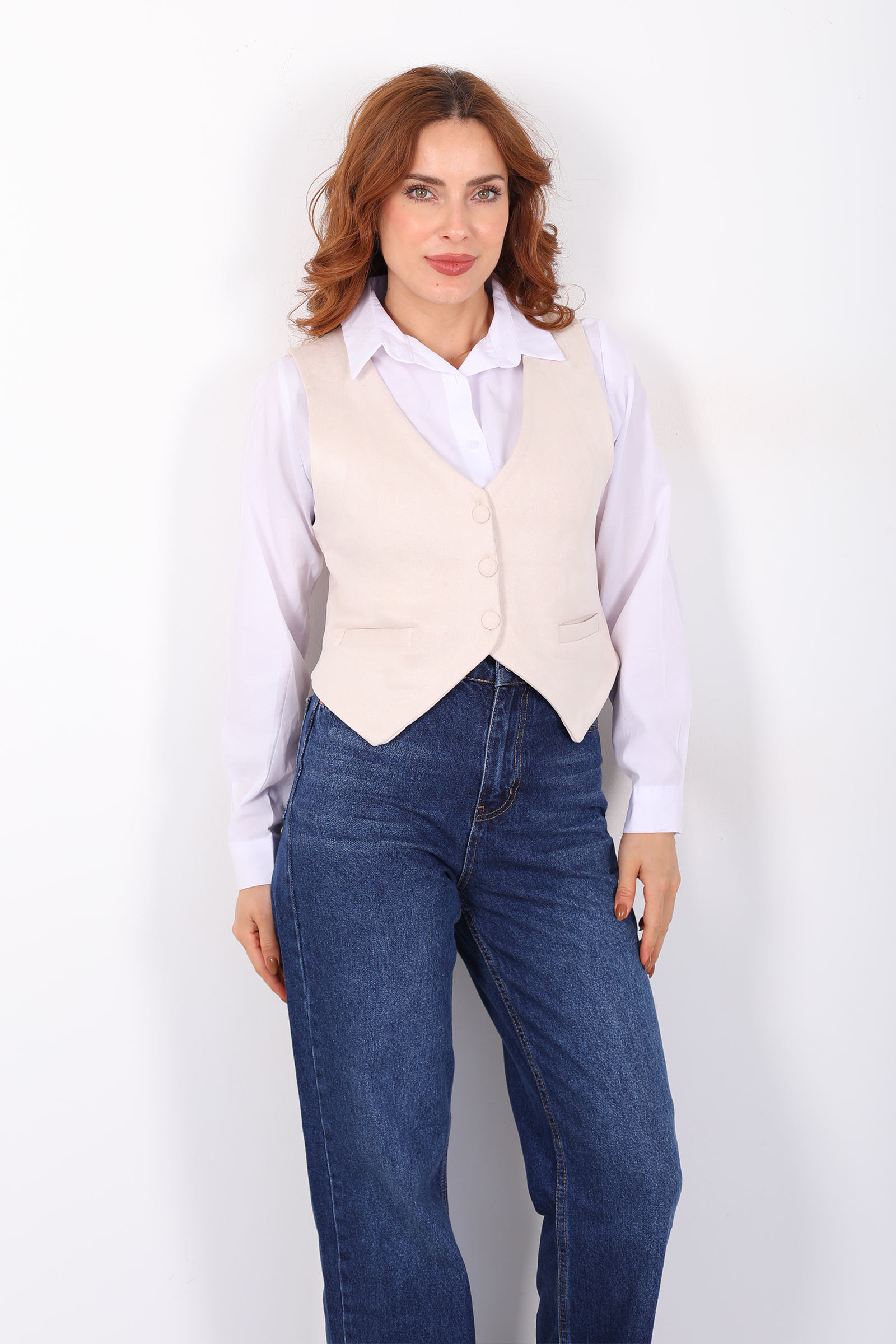 Düğmeli Kadın Taş Rengi Süet Yelek