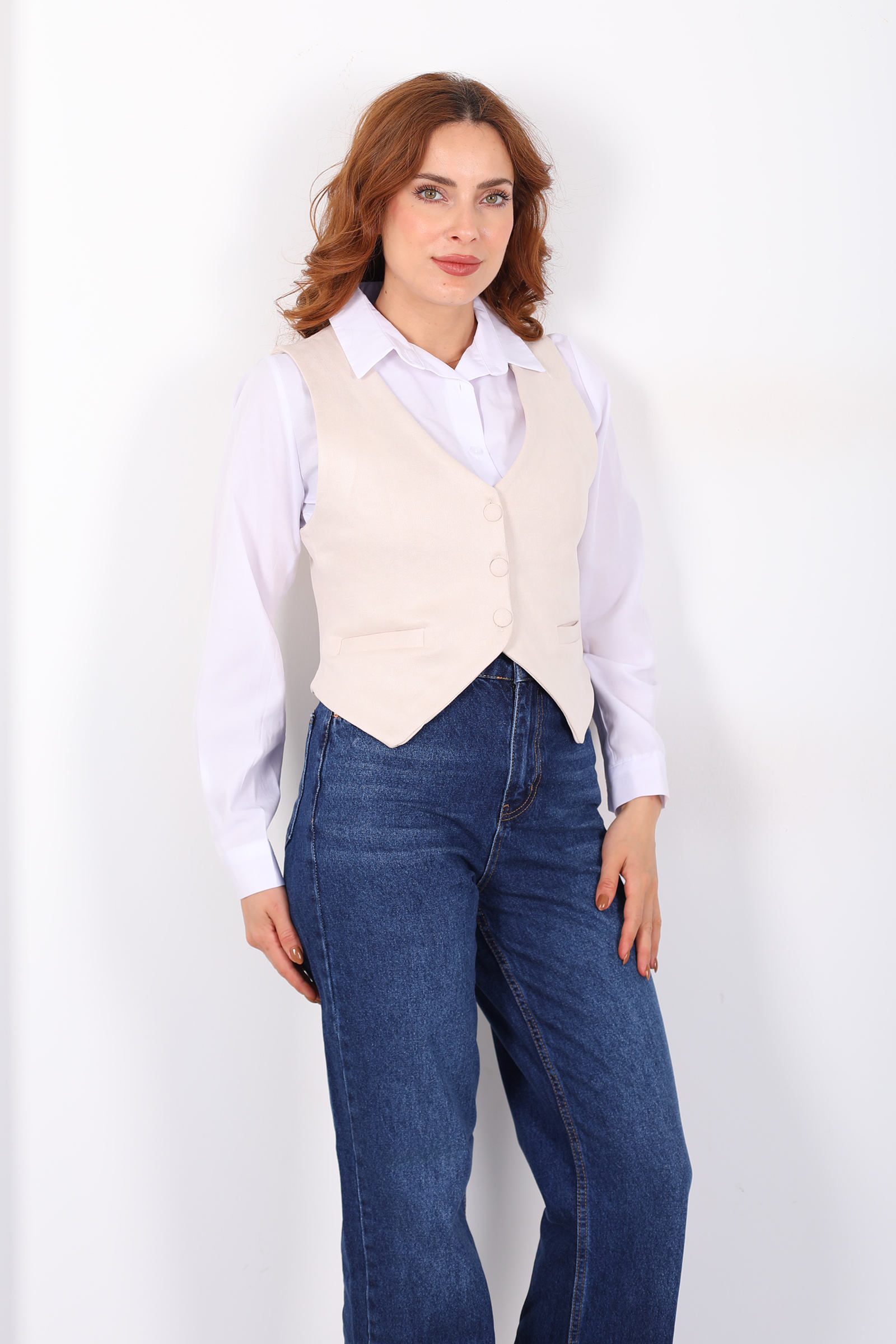 Keten Görünümlü Düğmeli Lacivert Kadın Yelek