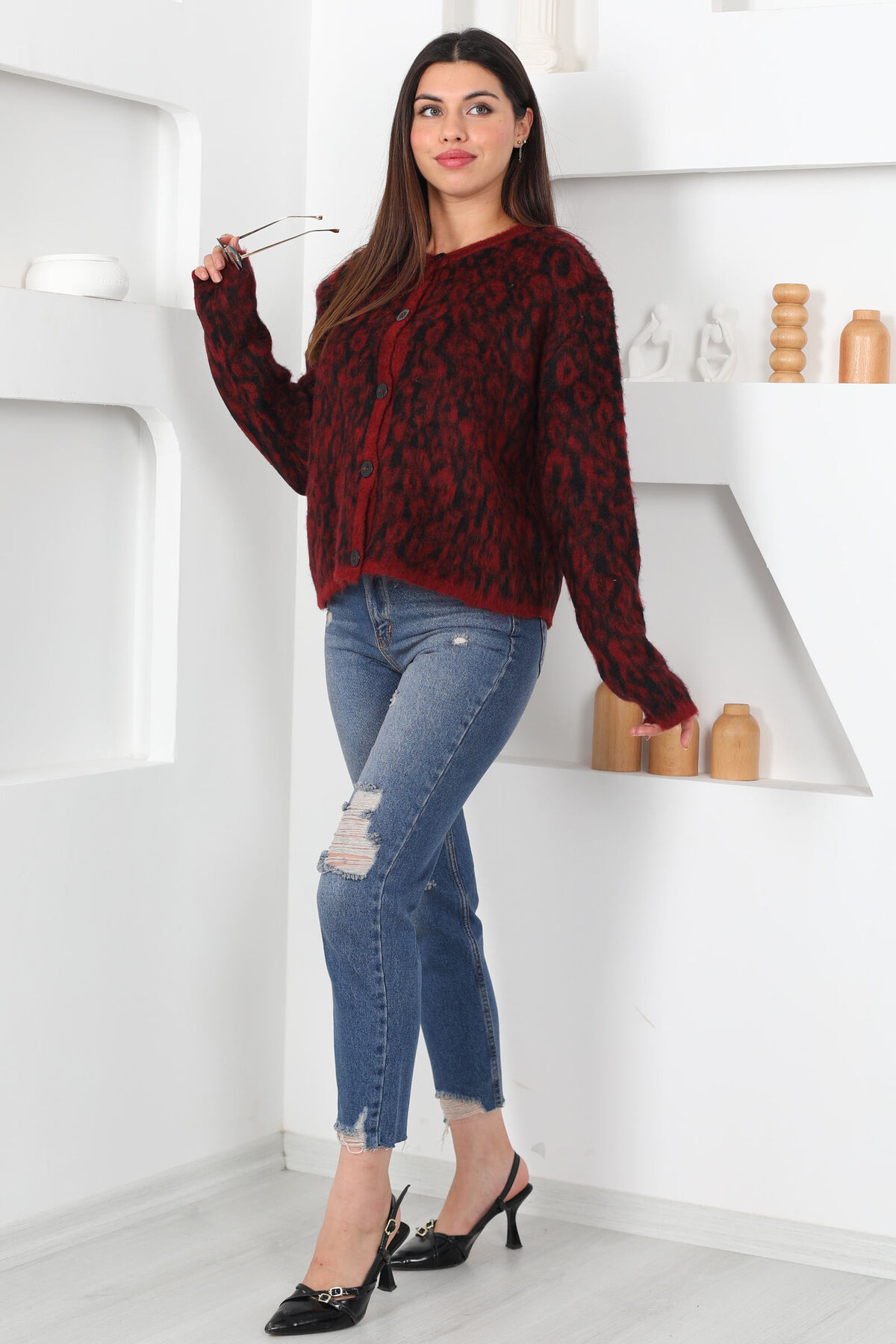 Düğmeli Leopar Bordo Kadın Yün Hırka