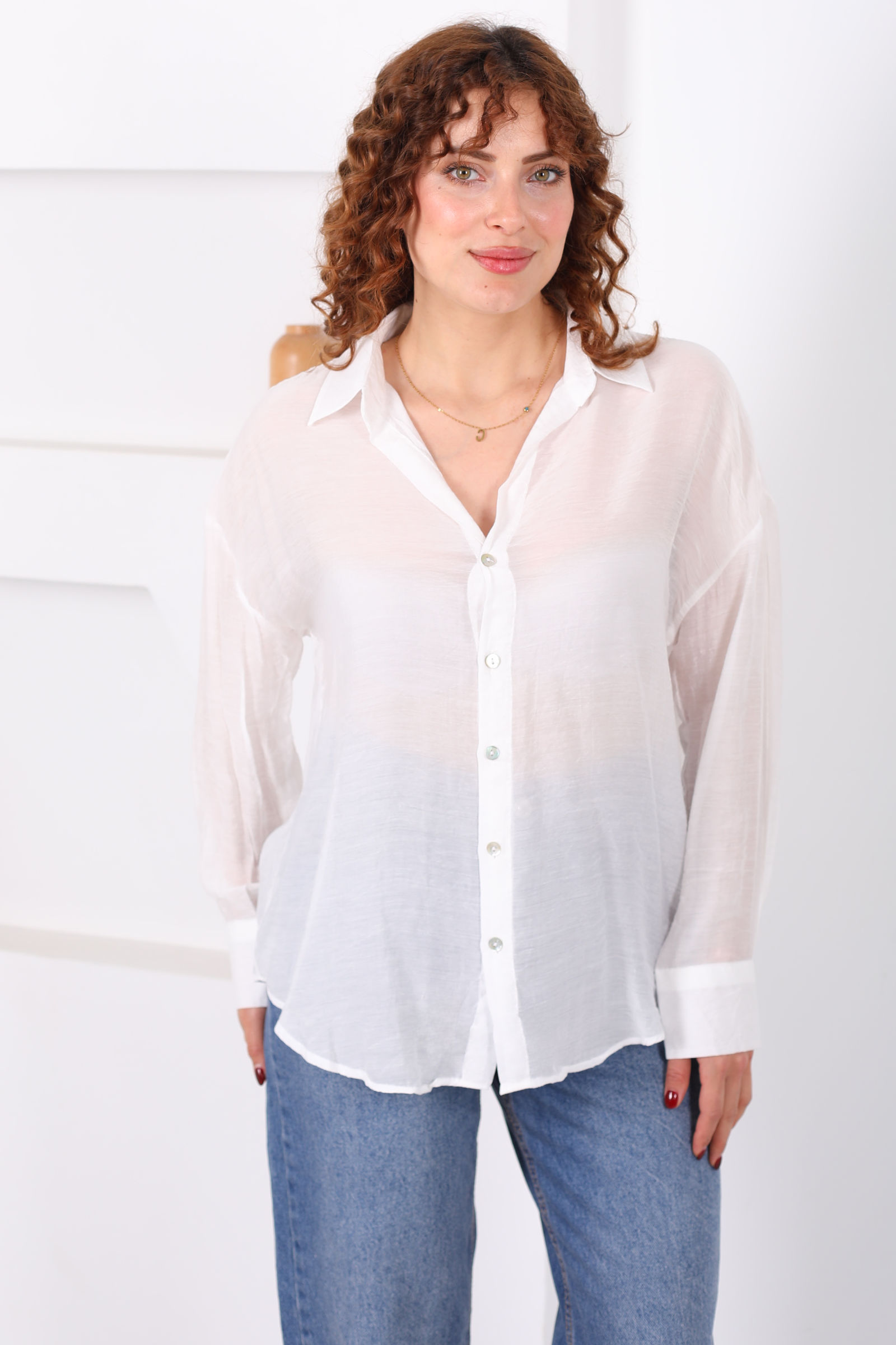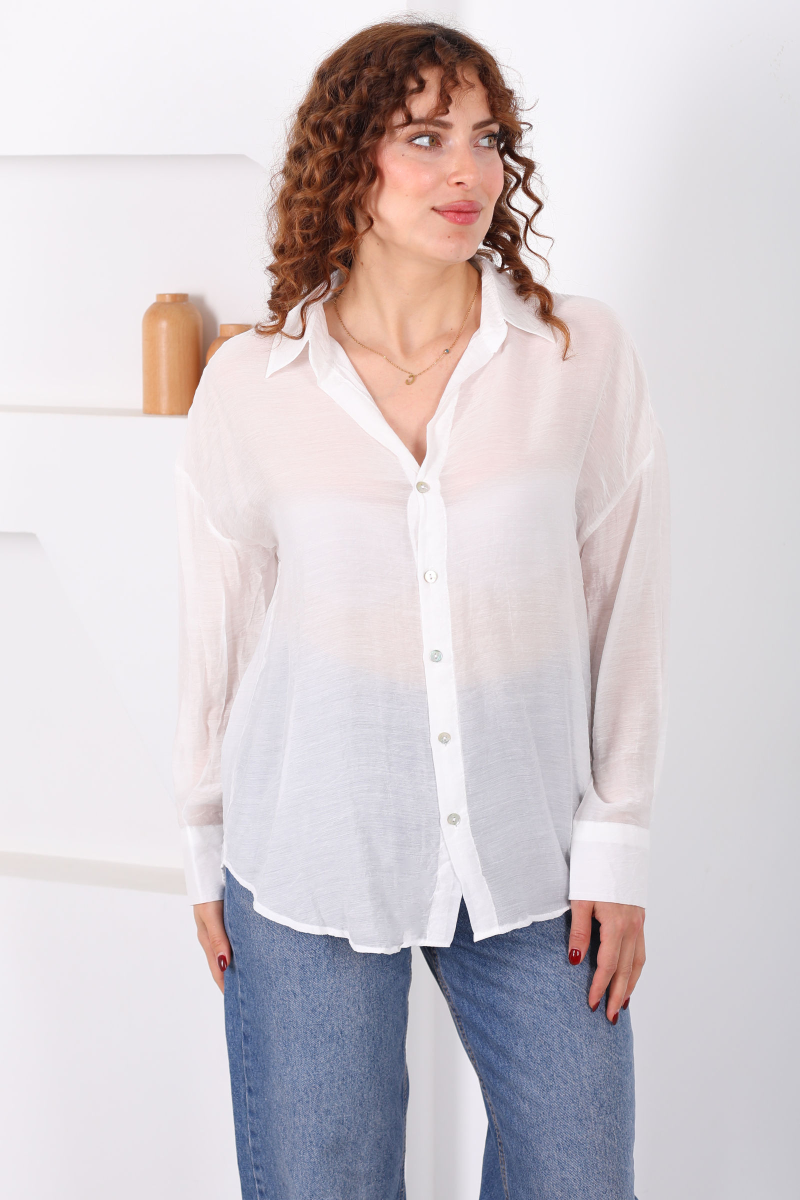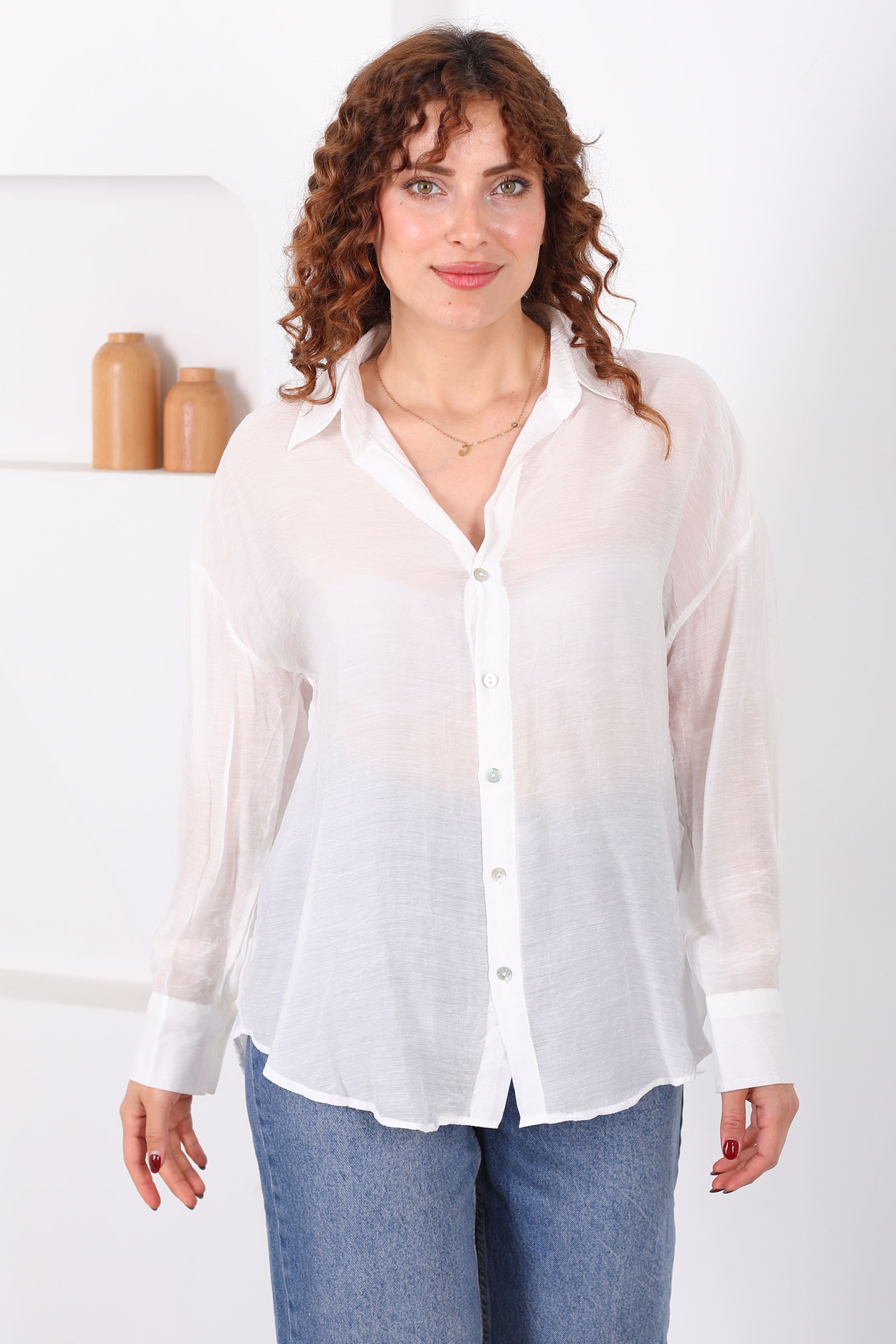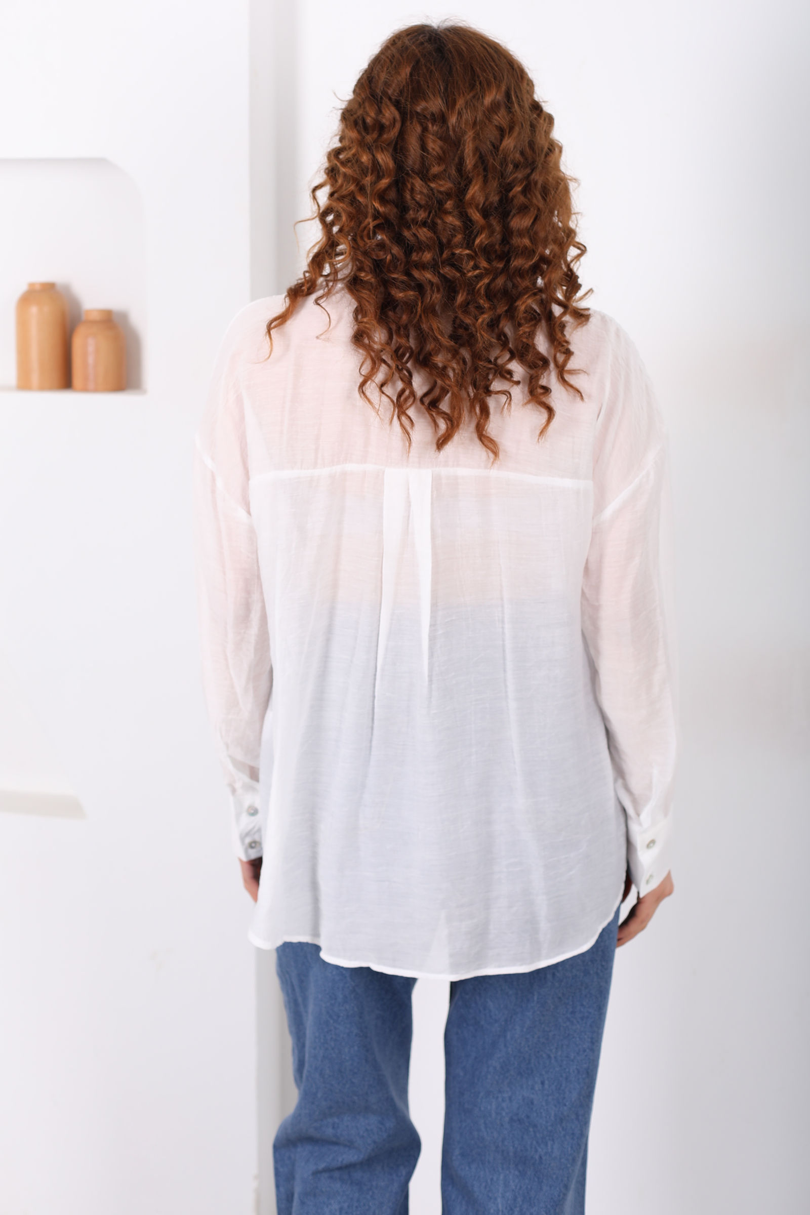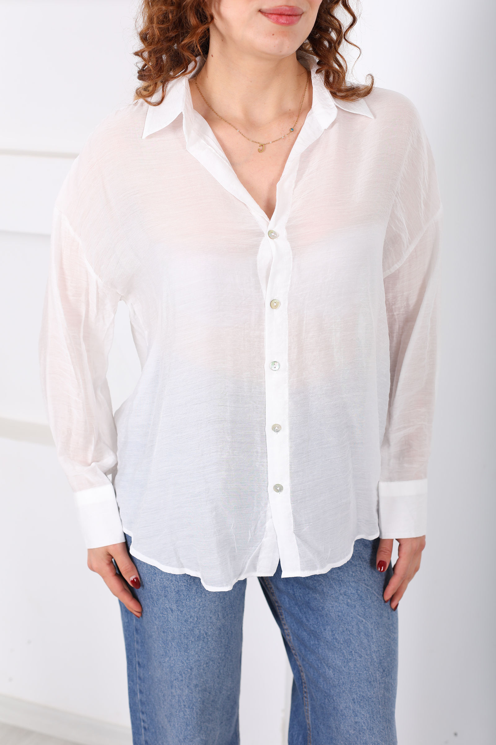 Düğmeli Oversize Transparan Kadın Beyaz Gömlek