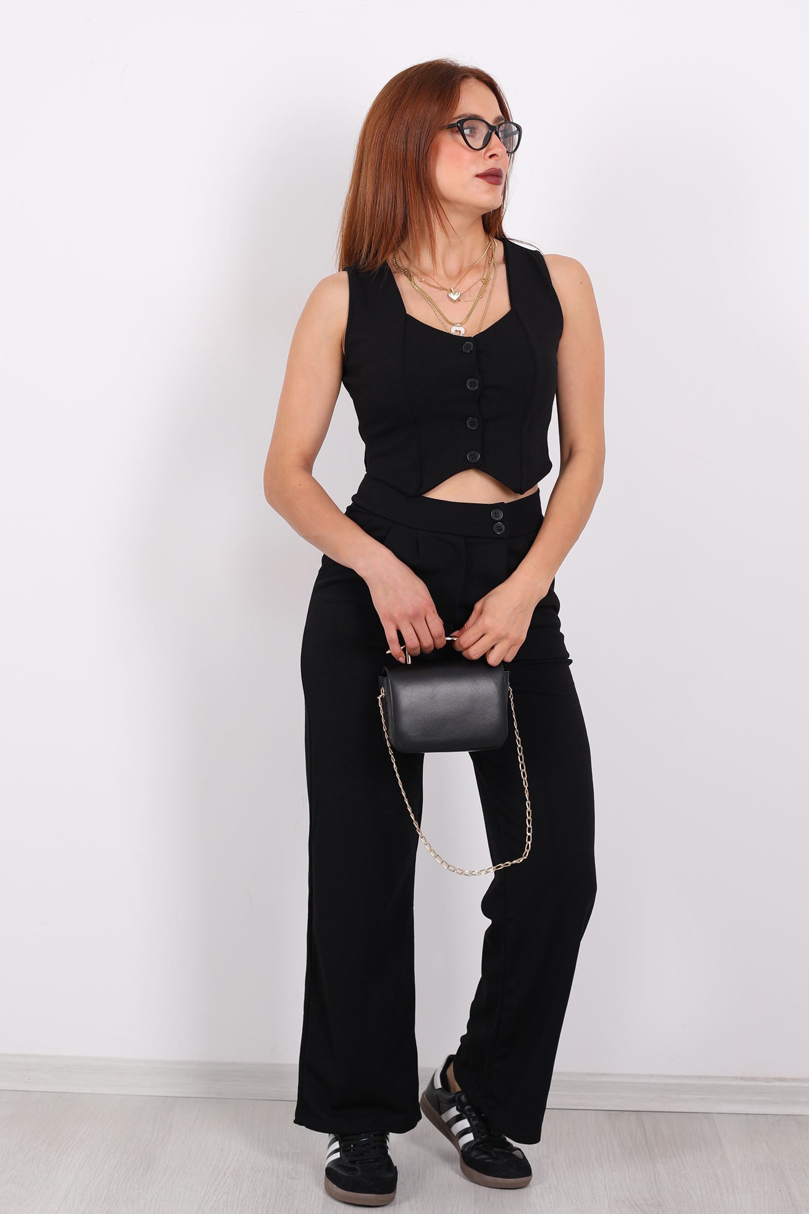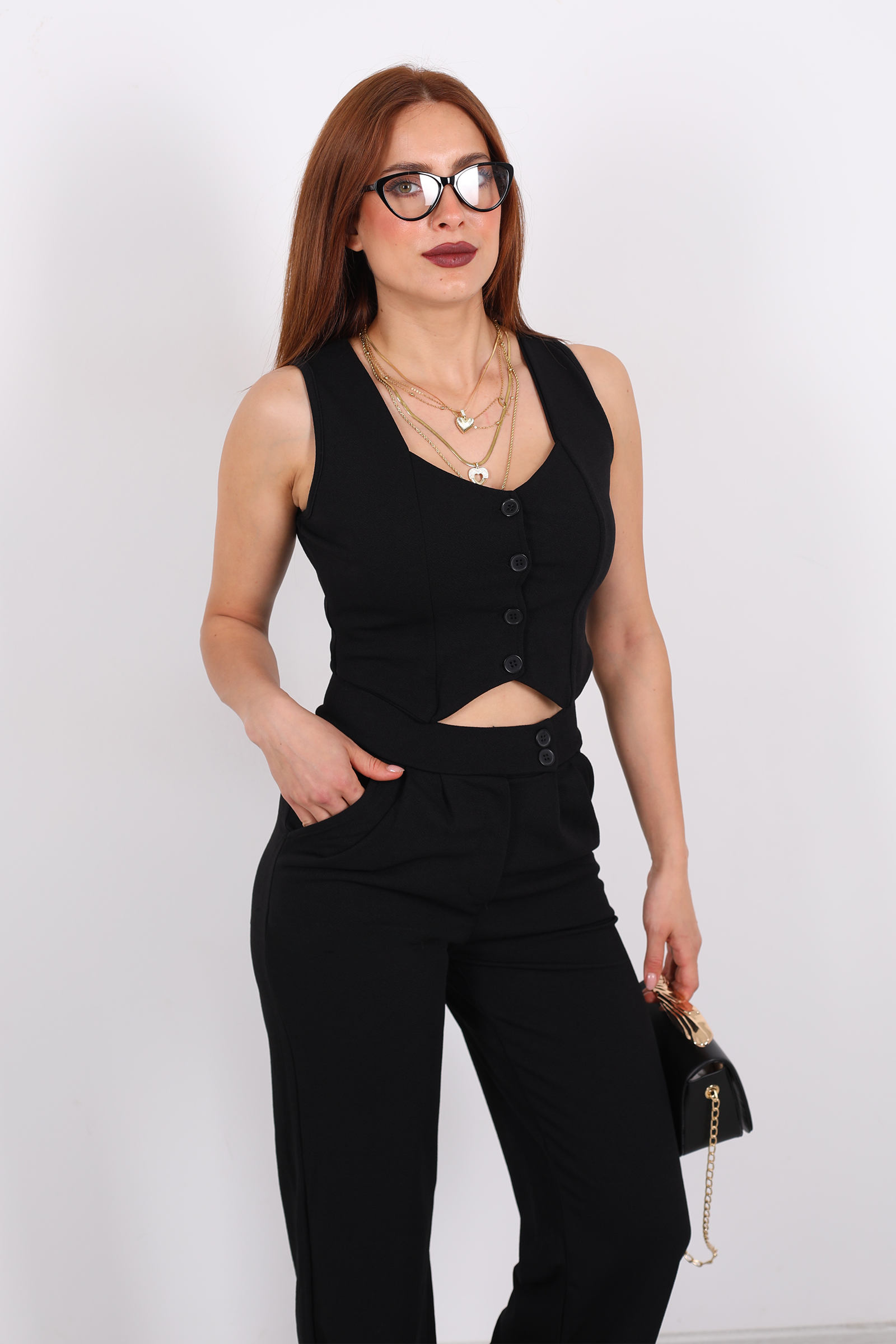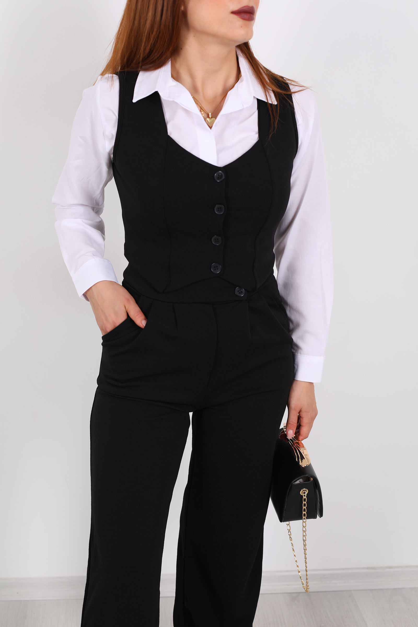 Stiline güçlü bir duruş kazandırmak isteyenler için tasarlanmış bu takım, hem şık hem de rahat bir kombin sunuyor. Zarif pile detaylarıyla yeleği, klasik bir dokunuşla modern çizgilere taşıyor; düğmeli önü ise feminen ama kararlı bir hava veriyor. Pantolon kısmı, belden başlayan hafif dökümü ve ideal kesimiyle silueti dengeliyor ve birlikte harika bir uyum yakalıyor.Kumaşı, gün boyu konfor sağlar: kumaş yapısı nefes alabilirlik ile dayanıklılığı dengeliyor, böylece hem iş ortamında hem de özel davetlerde rahatlıkla tercih edilebilir.