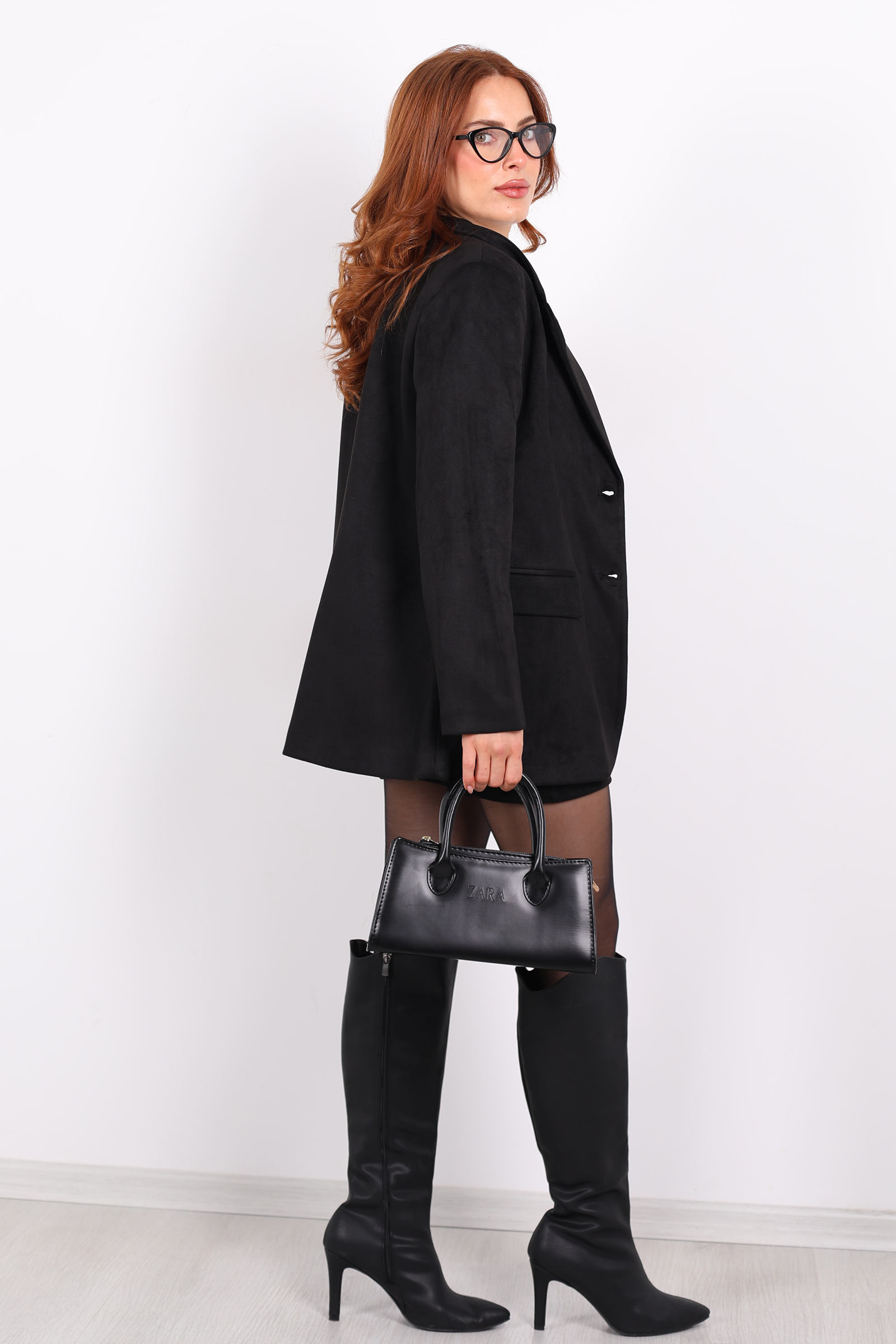 Ceket kaliteli süet benzeri bir kumaştan üretilmiş; dokusu yumuşak ve kadife hissi verir, böylece hem görsel açıdan hem dokunma açısından zengin bir deneyim sunar.Blazer kesimi sayesinde omuzlardan bele kadar net bir siluet oluşturur ve klasik bir yapı verir. Düğmeli ön kapama, ceketin formunu vurgularken kullanım kolaylığı sağlar.Uzun kollu tasarımı ve kemerli yapı, hem dengeli hem maskülen‑feminen bir uyum yaratır.