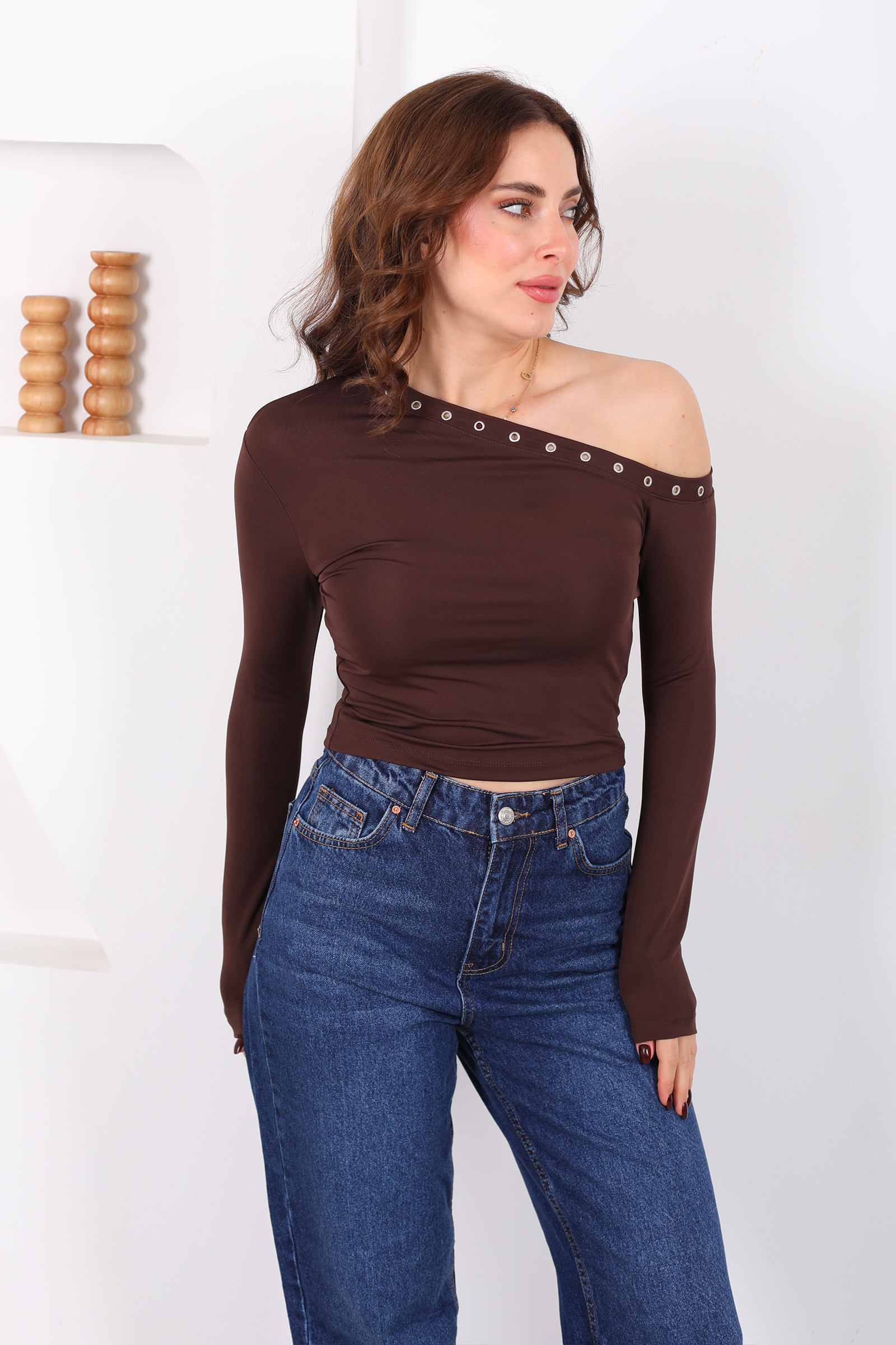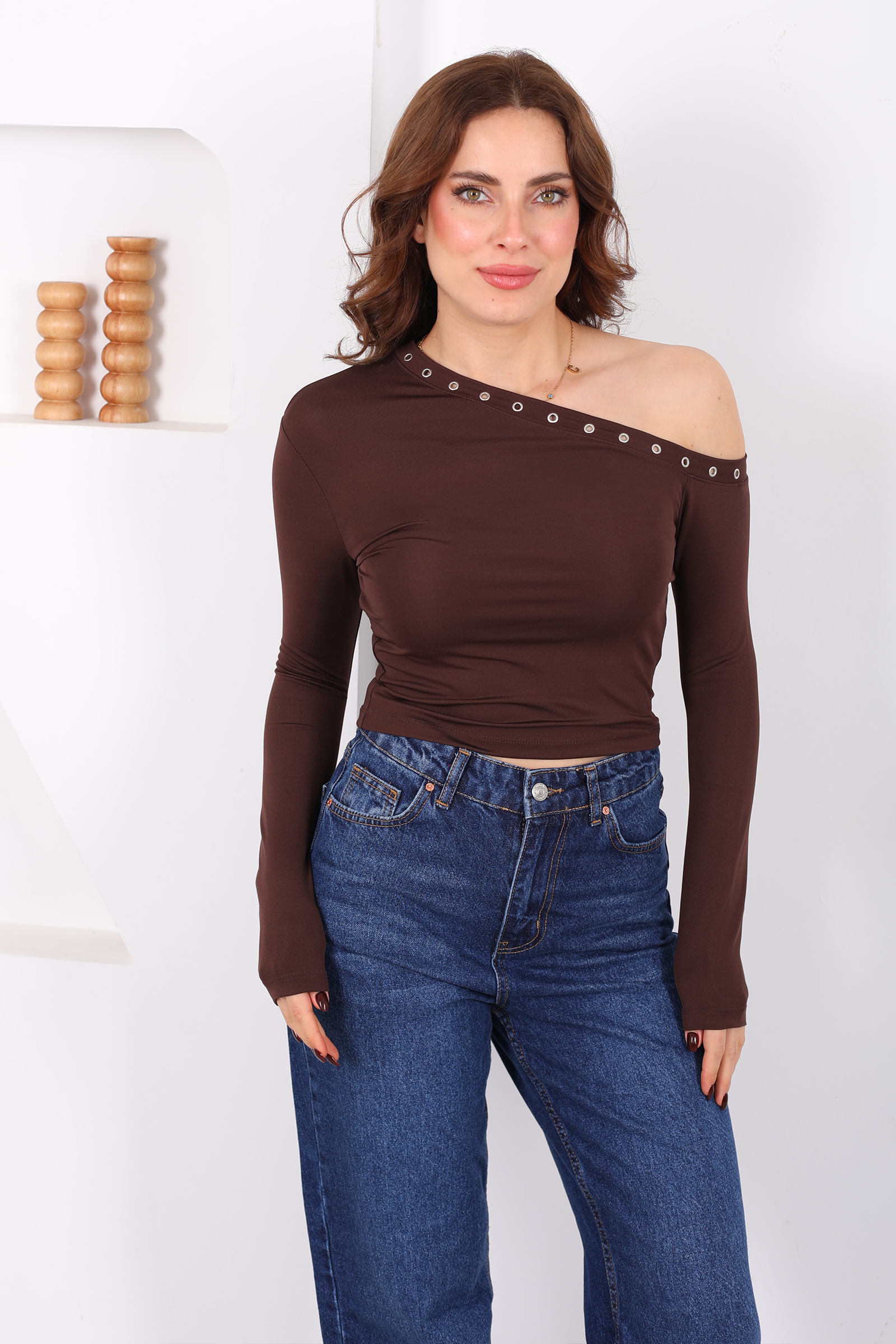 Düşük Omuz Kuş Göz Detaylı Acı Kahve Kadın Sandy Bluz