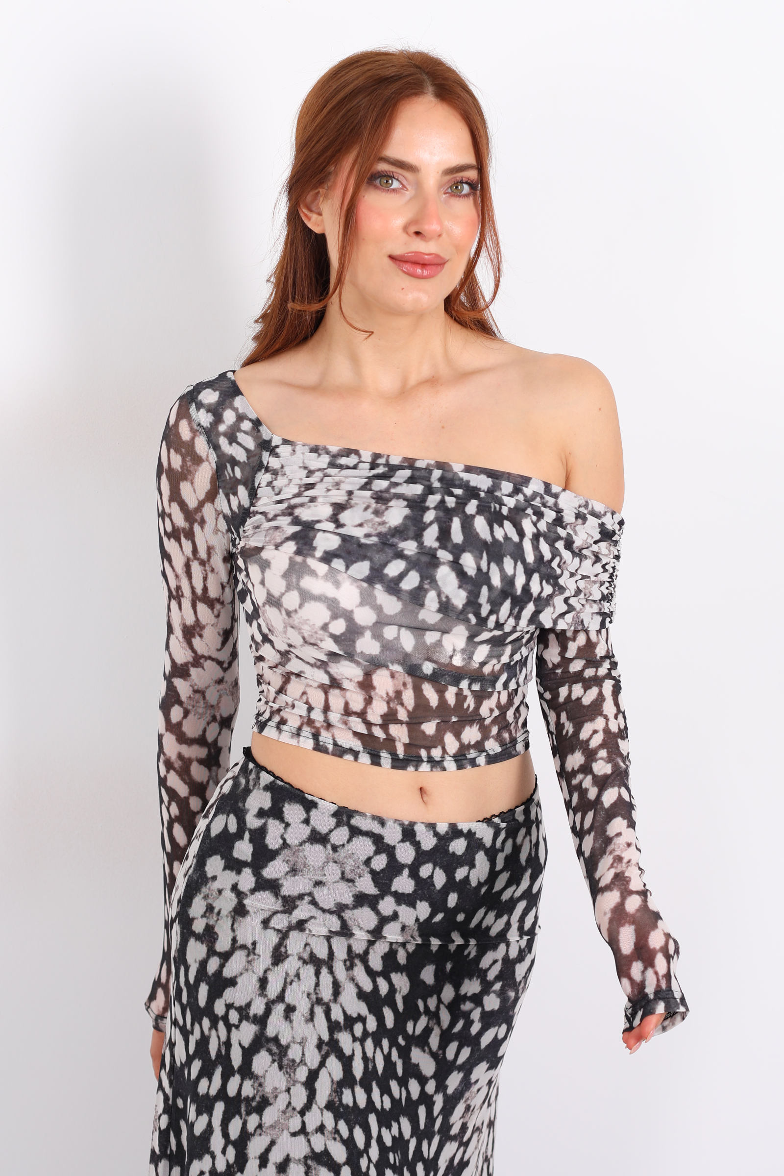 Siyah bluz, vahşi ruhunu zarif bir çizgide yansıtan leopar deseniyle dikkat çekici bir parça. Leopar baskısı, klasik siyah zeminle buluşarak sade ama güçlü bir kontrast sunar hem gündüz hem gece stillerine uygun, çok yönlü bir tercih.Modelin dikkat çeken özelliği “düşük omuz” kesimi. Drop shoulder tasarımı, omuz dikişinin doğal omuz çizgisinin biraz altına yerleştirilmesiyle oluşur. Bu stil, bluzun duruşuna salaş ama dengeli bir hava katar ve daha rahat, gevşek bir siluet yaratır.