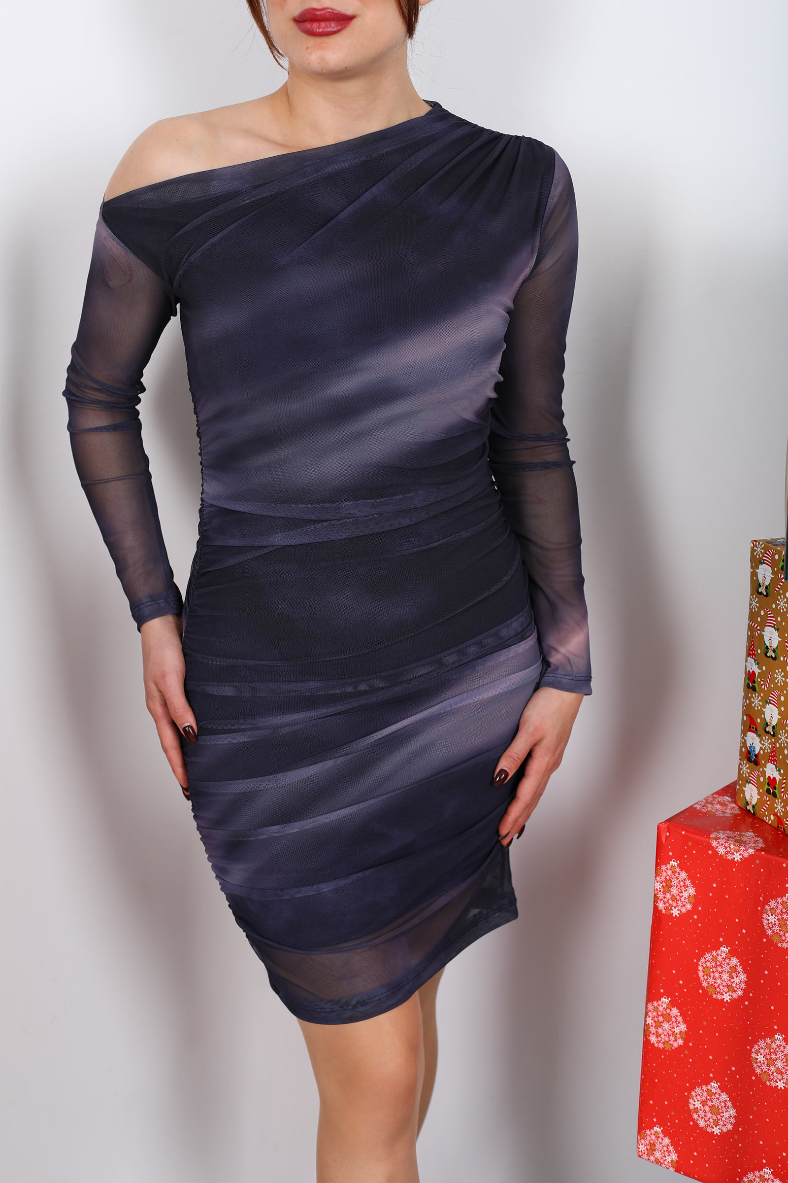 Gökyüzünün en derin gri tonlarını andıran bu antrasit tül elbise, klasik kalıpları cesur bir tasarım anlayışıyla yeniden tanımlar. Düşük omuz kesimi, omuz hattını incelikle ortaya çıkarırken elbiseye nazik bir akışkanlık verir. Yan kısımlardaki drapeler, kumaşı doğal kıvrımlarla bir araya getirerek her adımda hafif bir hareket ve hacim yaratır bu hem feminen hem de zamansız bir estetik sunar.Tülün hafifliği ve drape (kumaşın yumuşak kıvrımlarla düşmesi) tekniği, elbiseye klasik bir dokunuşla birlikte modern bir ritim kazandırır. Drapeli yapı, sadece görünüşü zenginleştirmekle kalmaz; aynı zamanda şekil ve hatlara sertlikten uzak ama etkileyici bir hacim sağlar.