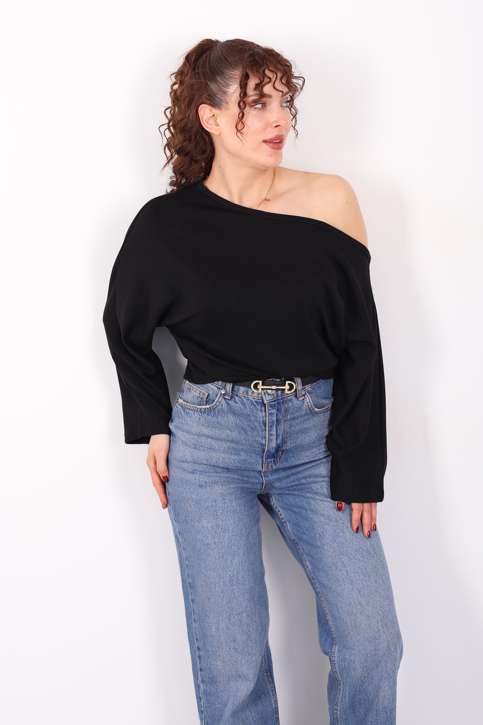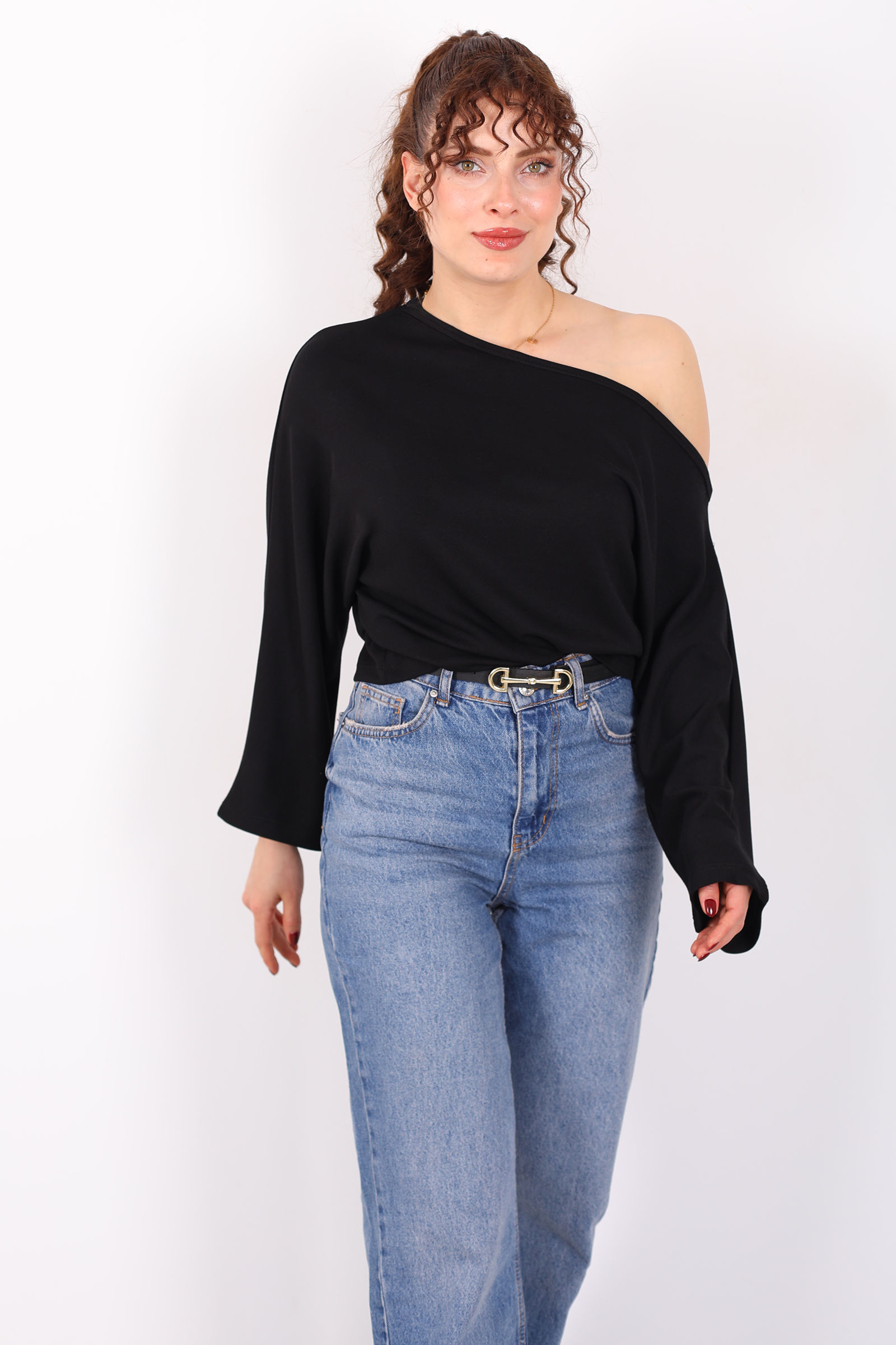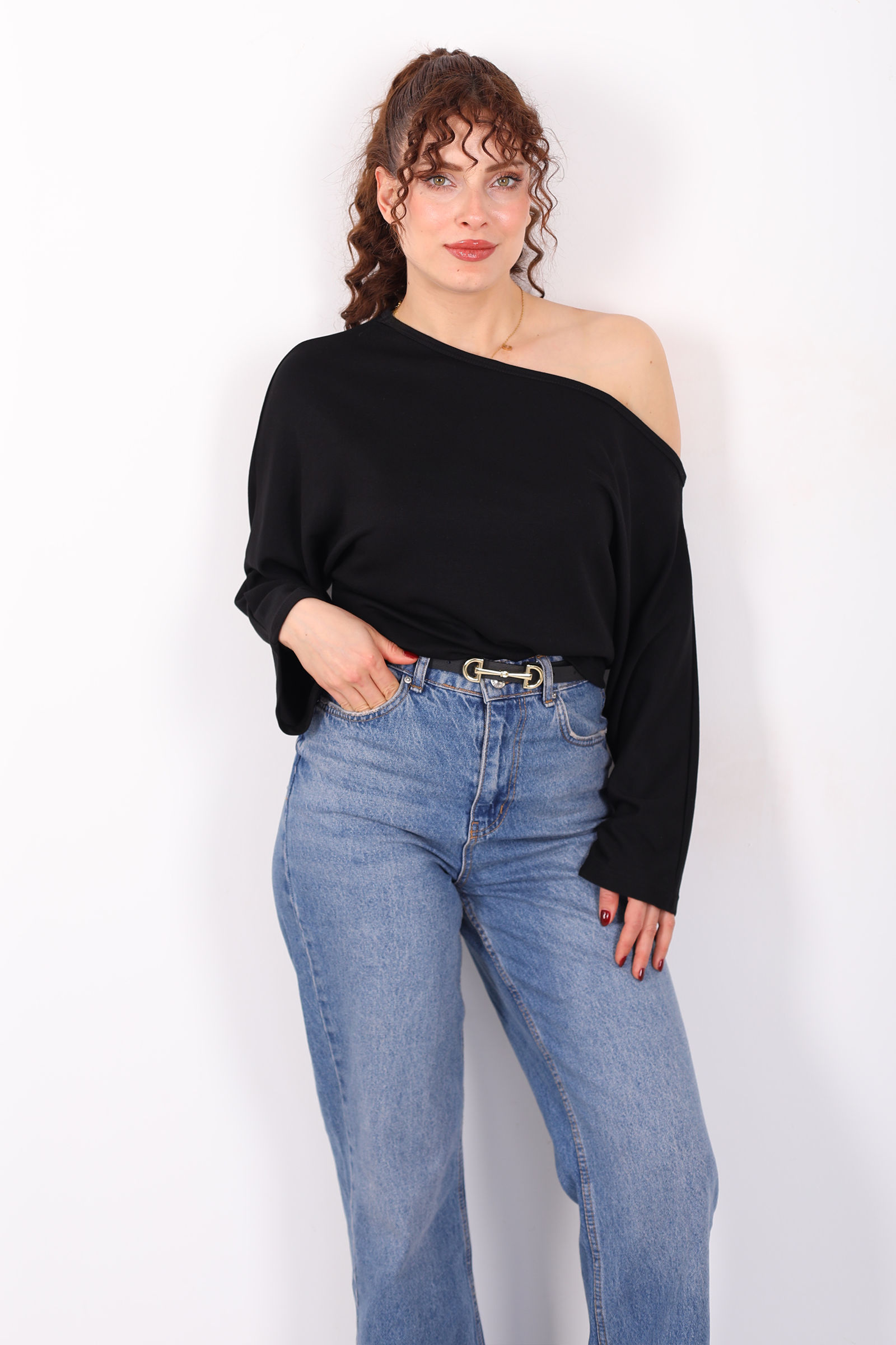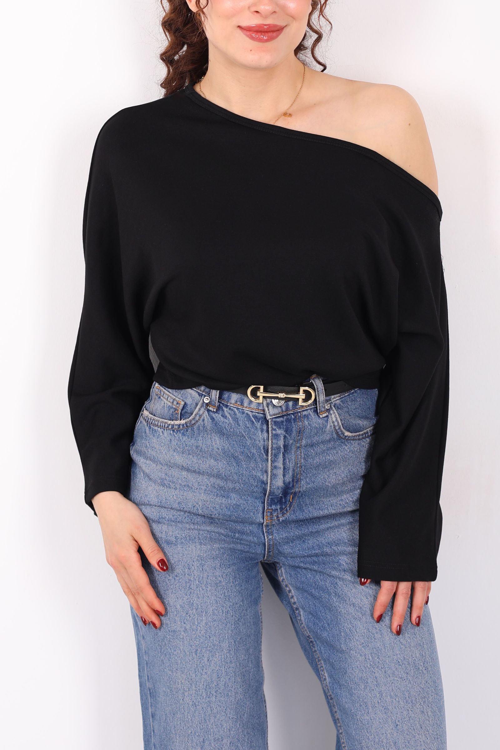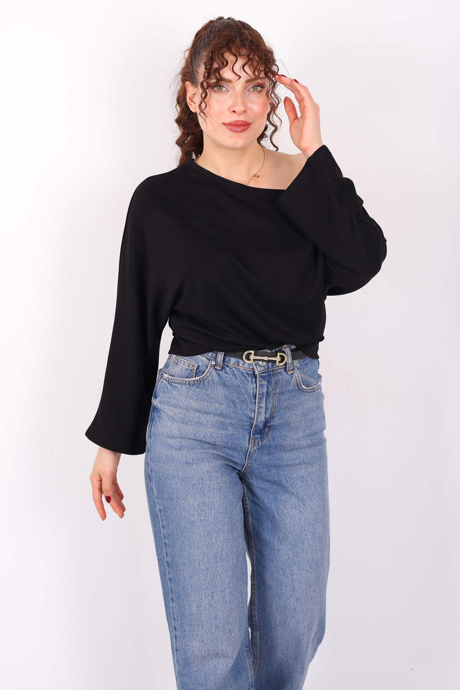 Minimalizmin sofistike yorumu düşük omuz yarasa kol siyah kadın bluz ile stilini yeniden tanımla! Derin siyah tonuyla her kombine kolayca uyum sağlayan bu bluz, modern kesimi ve akışkan siluetiyle dikkat çekiyor. Düşük omuz detayları omuz hattını zarifçe ortaya çıkarırken yarasa kol tasarımı rahat bir hareket özgürlüğü sağlar. İnce ve nefes alan kumaşıyla gün boyu konforu hissettirir ve farklı alt parçalarla kusursuz uyum yakalar.