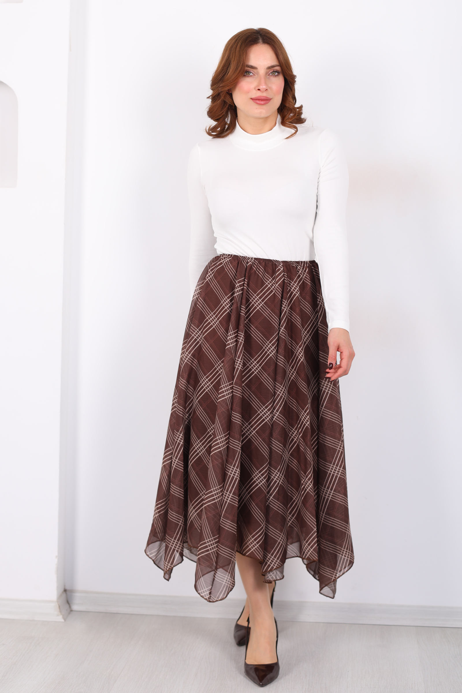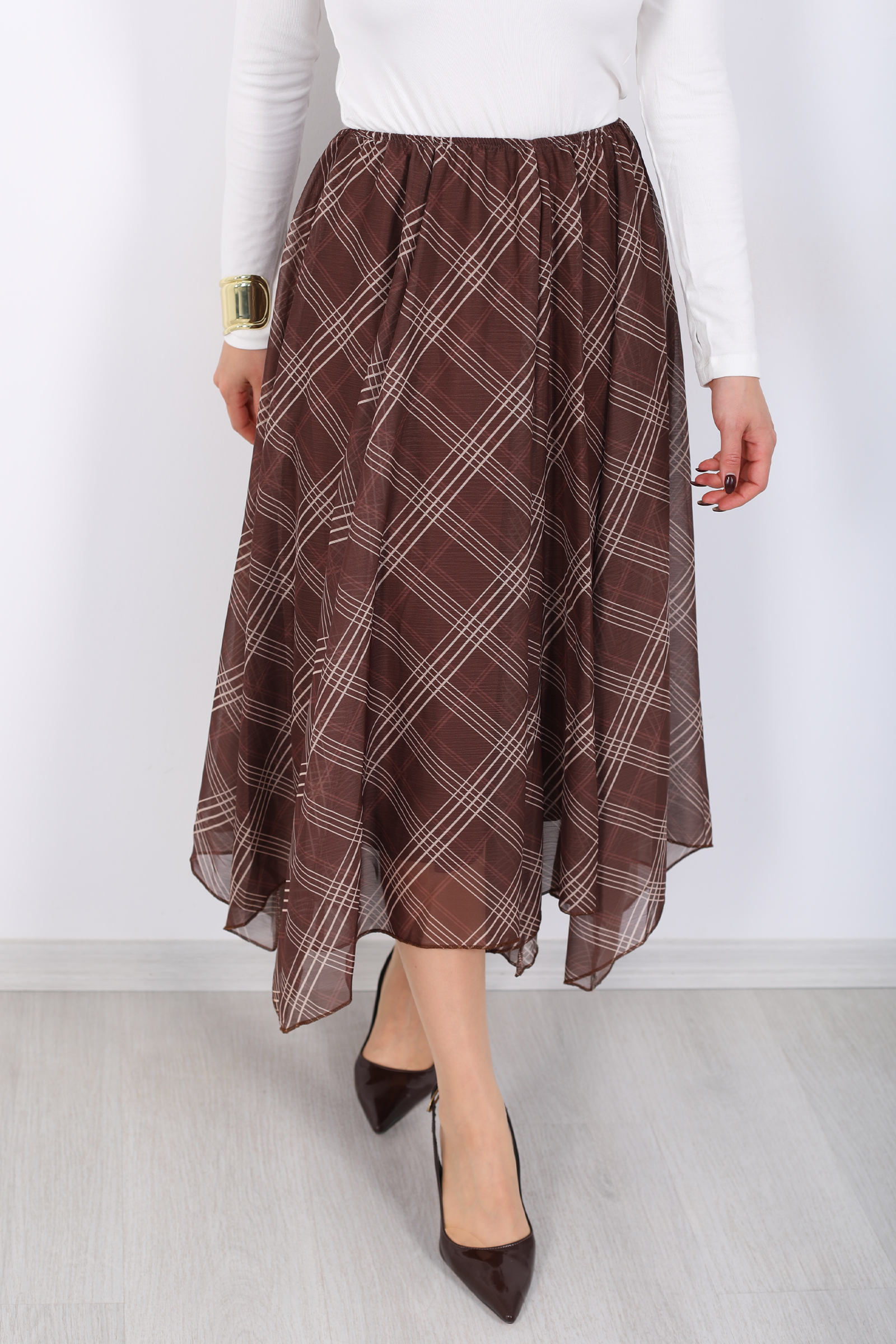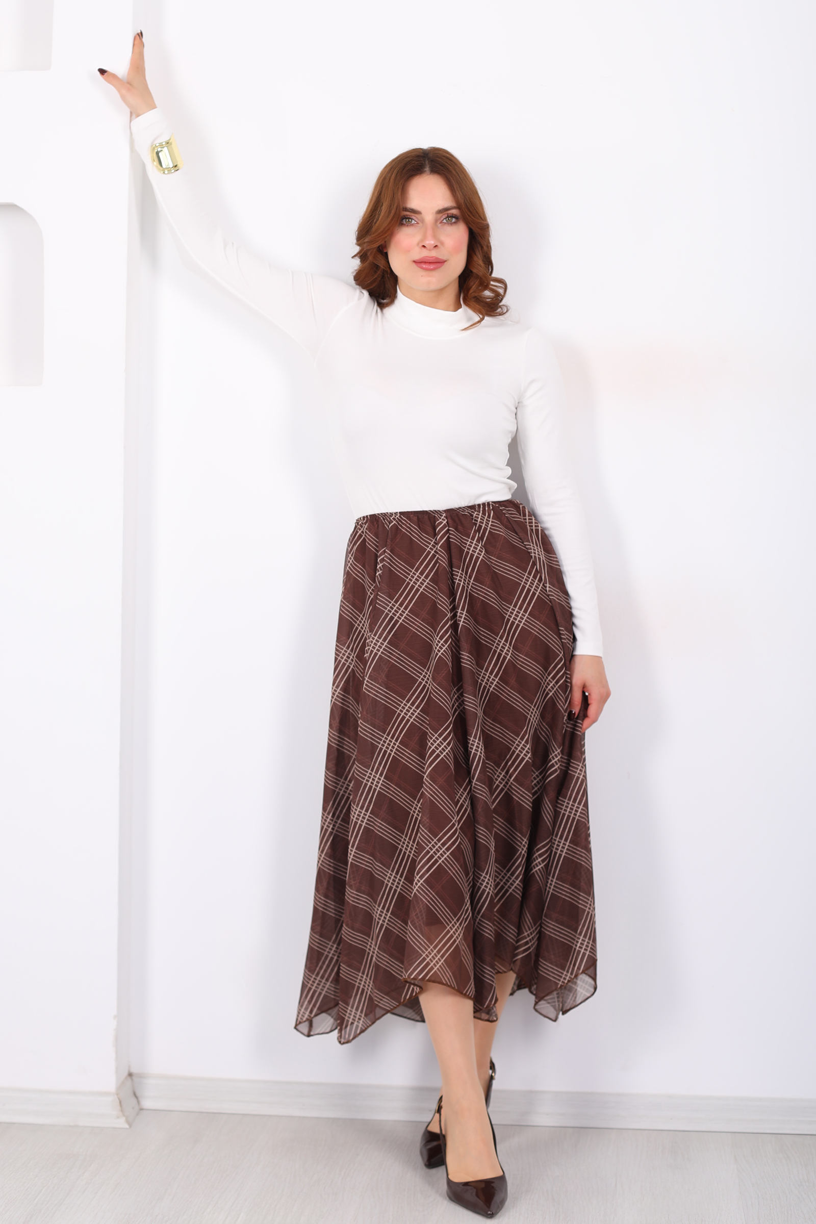 Kahverenginin sıcak tonlarını ekose deseniyle buluşturan bu asimetrik klos etek, klasik etek anlayışını dinamik bir anlatımla yeniden tasarlıyor. Kumaşın akıcı yüzeyi, yürüyüş anında adımlarınıza hafif bir ritim katarken, asimetrik kesim etek hattında modern bir akış yaratır. Ekose deseni, sadelikle sofistikeliğin dengeli bir karışımını sunar; sade üstler ya da triko parçalarla kombinlendiğinde stilinizde özgün bir karakter olur. Minimal detaylarla güçlü bir imza arayanlar için ideal bir seçim.