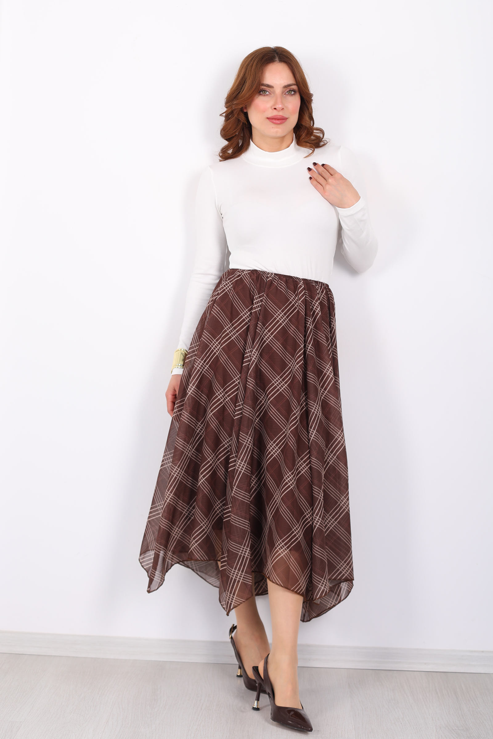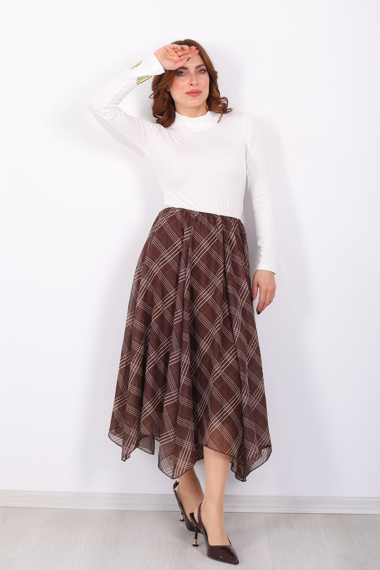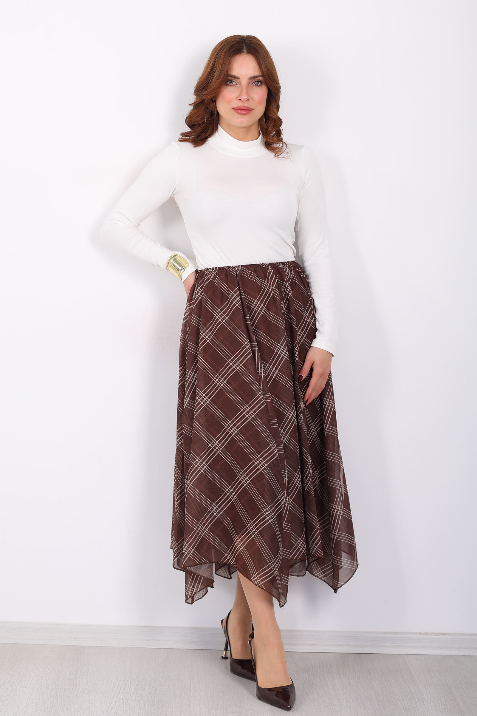 Kahverenginin sıcak tonlarını ekose deseniyle buluşturan bu asimetrik klos etek, klasik etek anlayışını dinamik bir anlatımla yeniden tasarlıyor. Kumaşın akıcı yüzeyi, yürüyüş anında adımlarınıza hafif bir ritim katarken, asimetrik kesim etek hattında modern bir akış yaratır. Ekose deseni, sadelikle sofistikeliğin dengeli bir karışımını sunar; sade üstler ya da triko parçalarla kombinlendiğinde stilinizde özgün bir karakter olur. Minimal detaylarla güçlü bir imza arayanlar için ideal bir seçim.