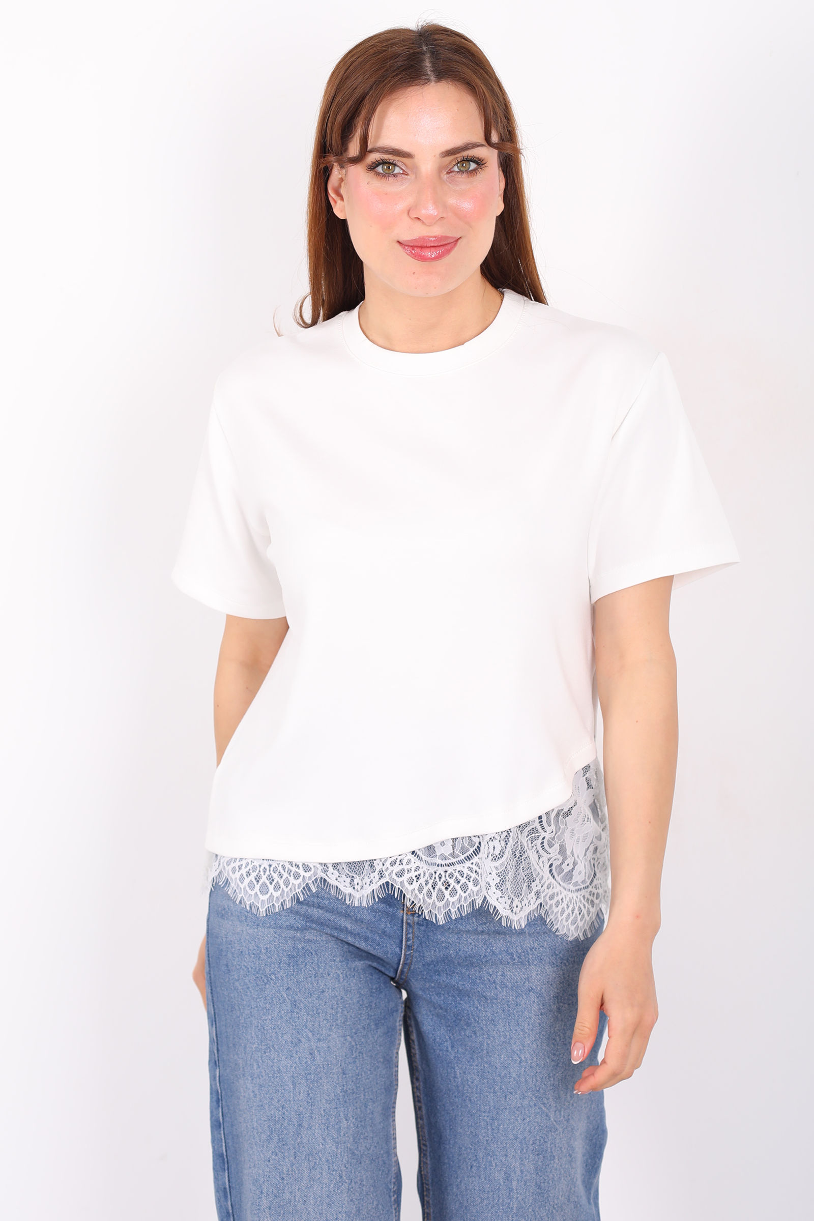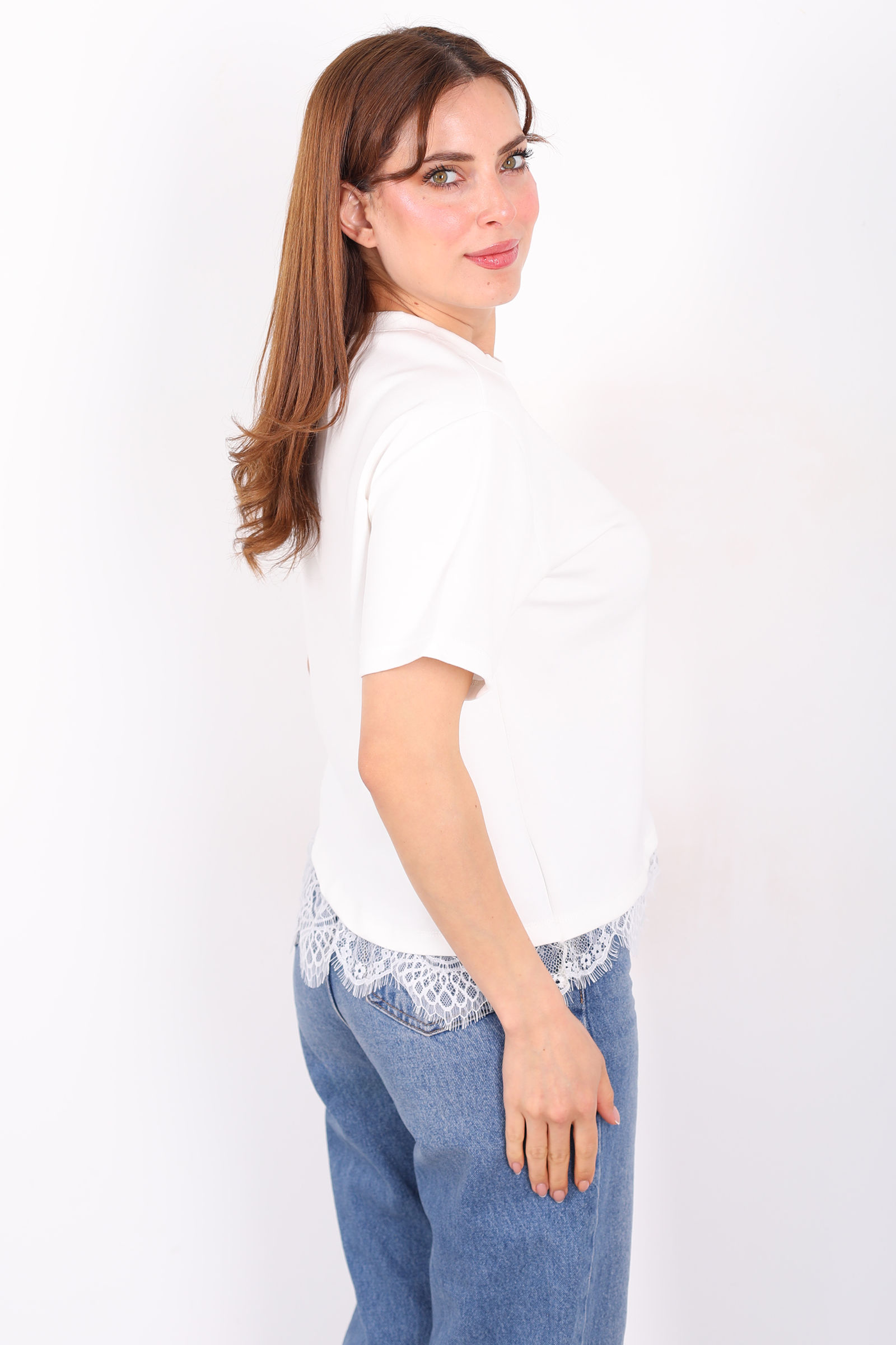 Eteği Dantelli Bisiklet Yaka Ekru Kadın T-Shirt