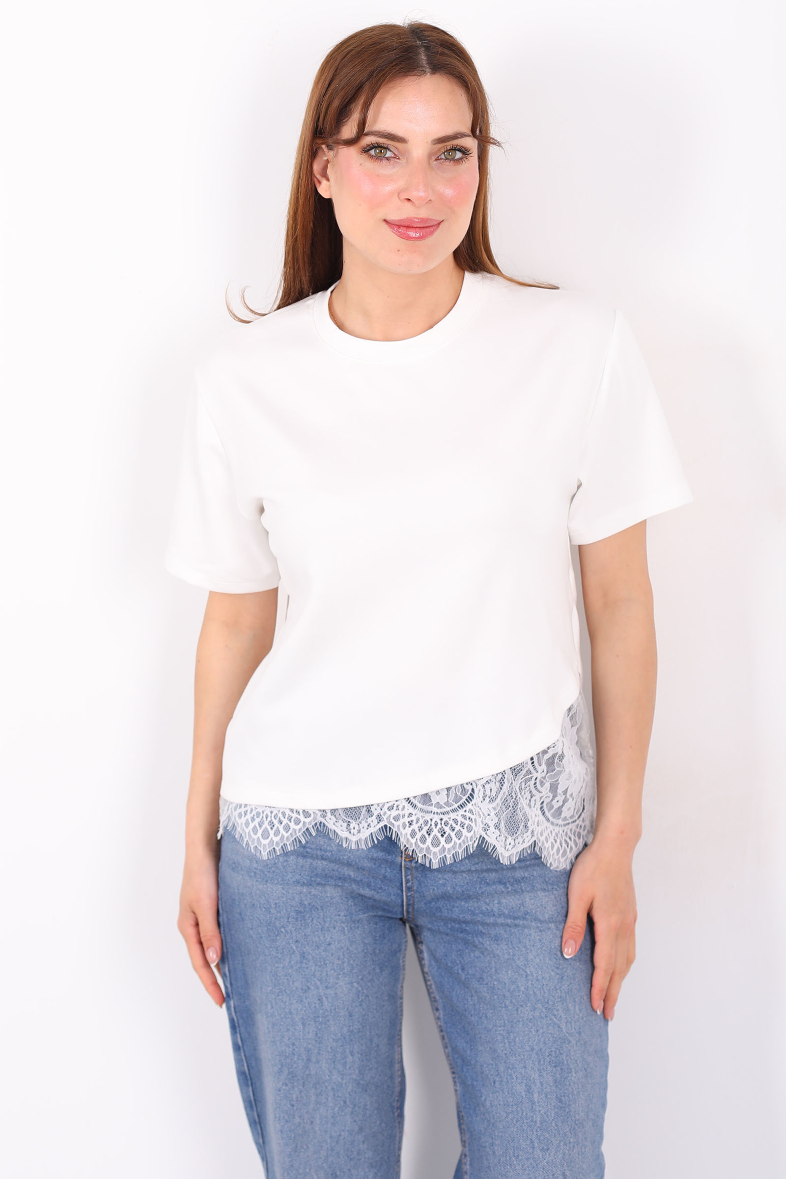 Eteği Çapraz Dantelli Ekru Kadın Kısa Kol T-Shirt