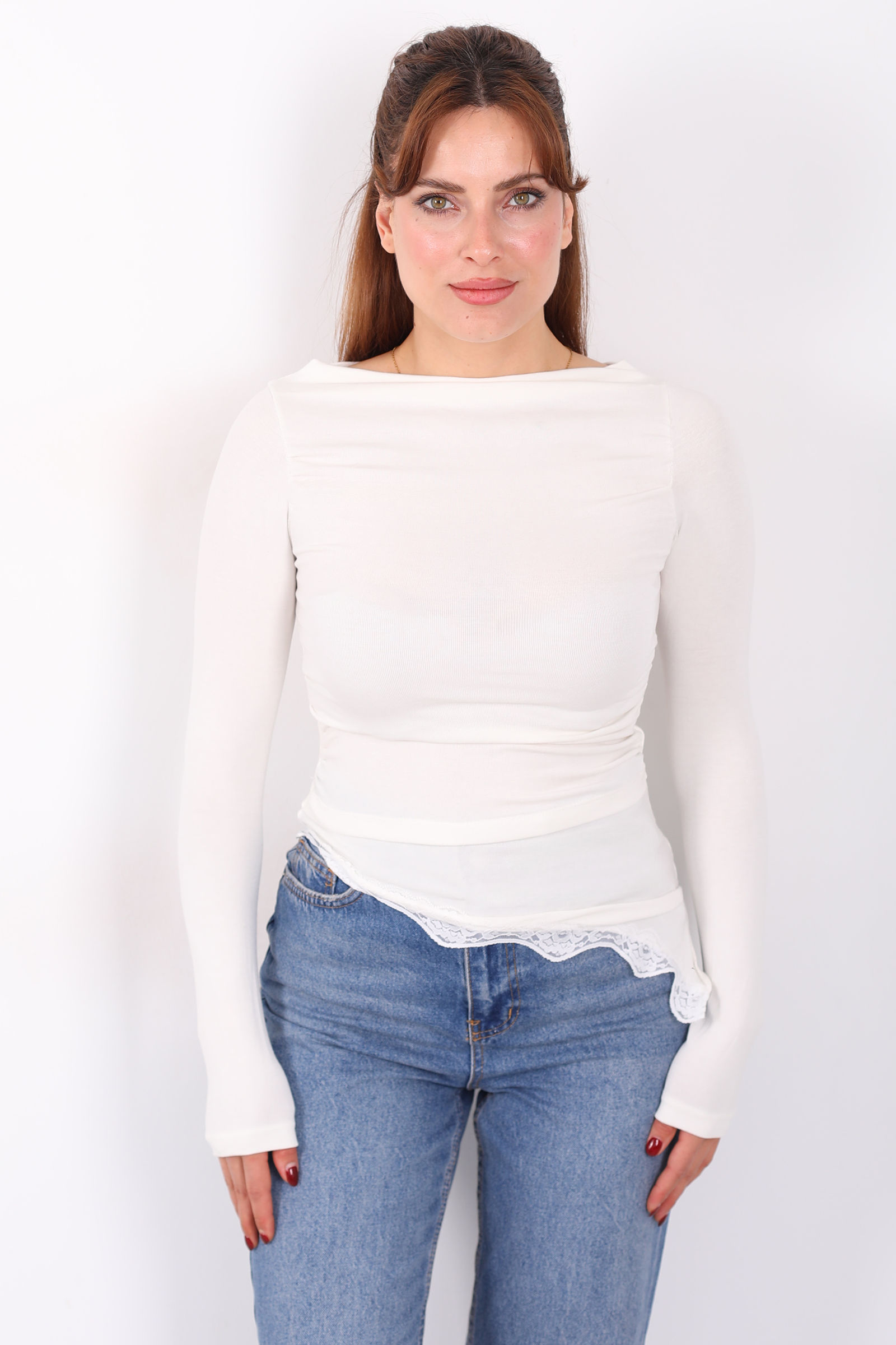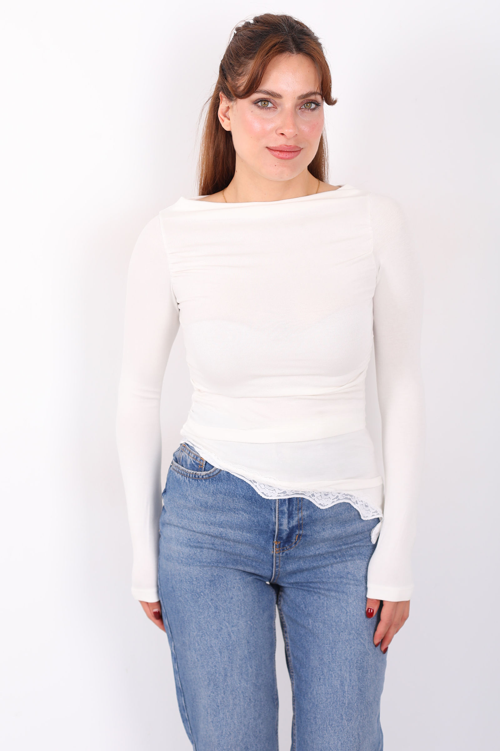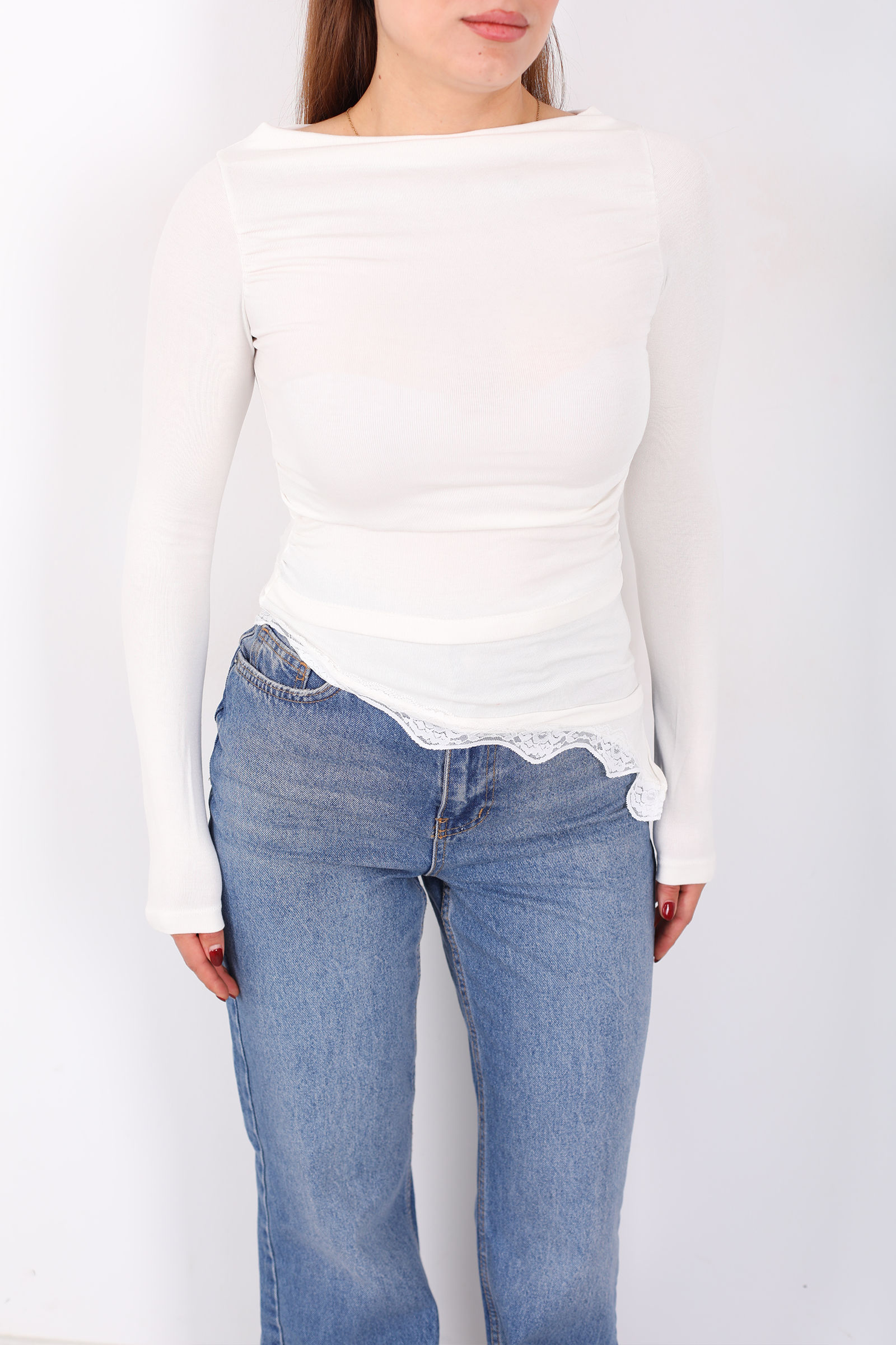 Eteği Dantel Detaylı Asimetrik Kadın Ekru Drapeli Bluz