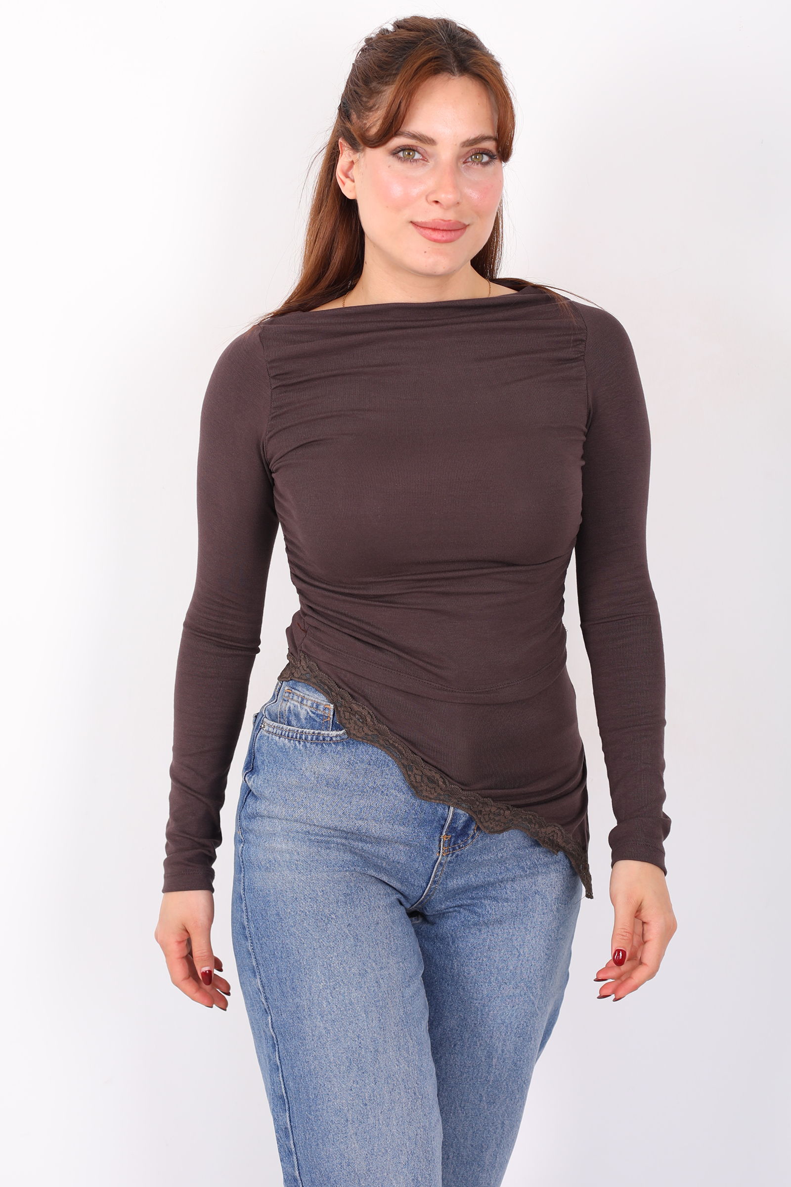 Eteği Dantel Detaylı Asimetrik Kadın Kahverengi Drapeli Bluz