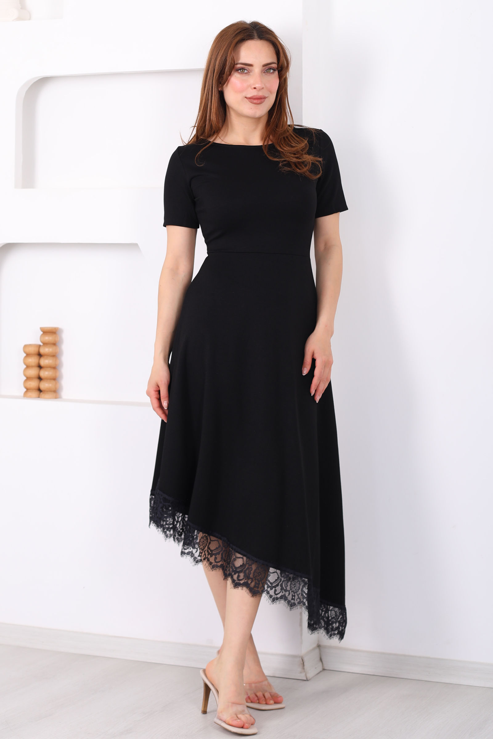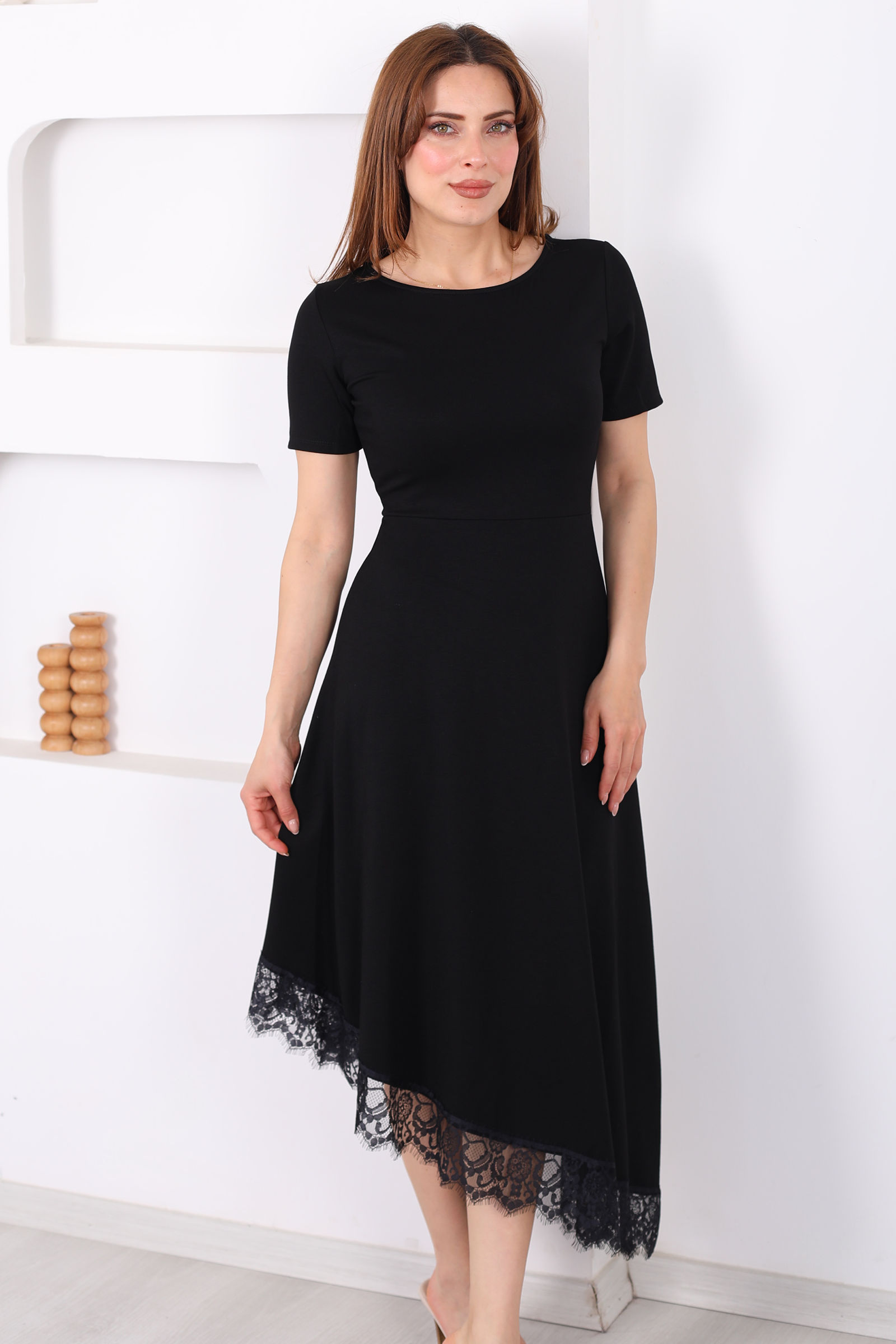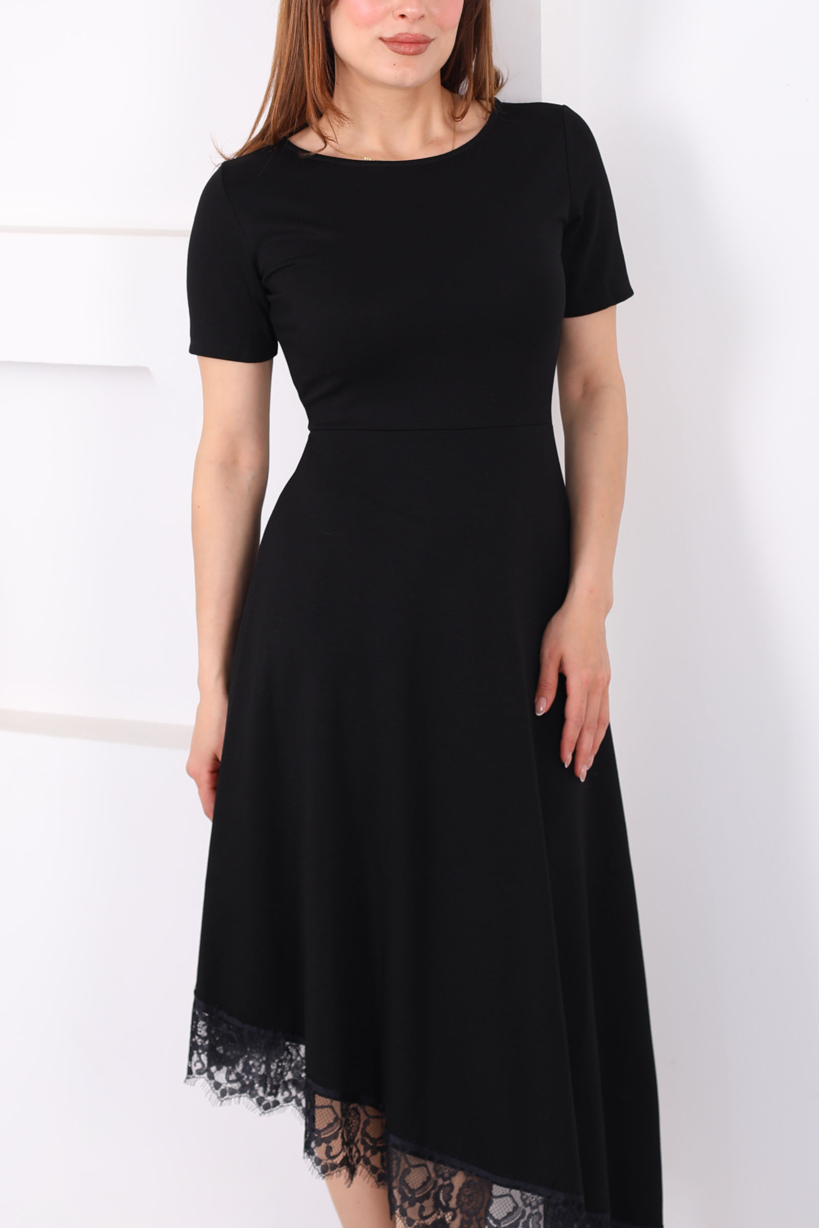 Eteği Dantelli Kadın Siyah Asimetrik Midi Modal Elbise
