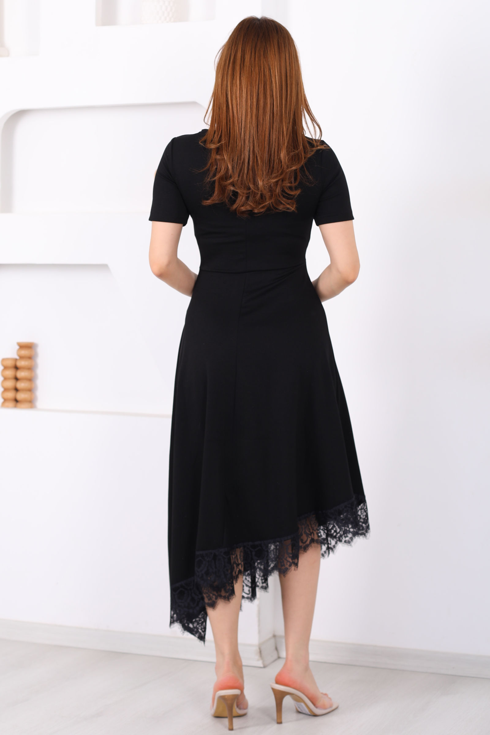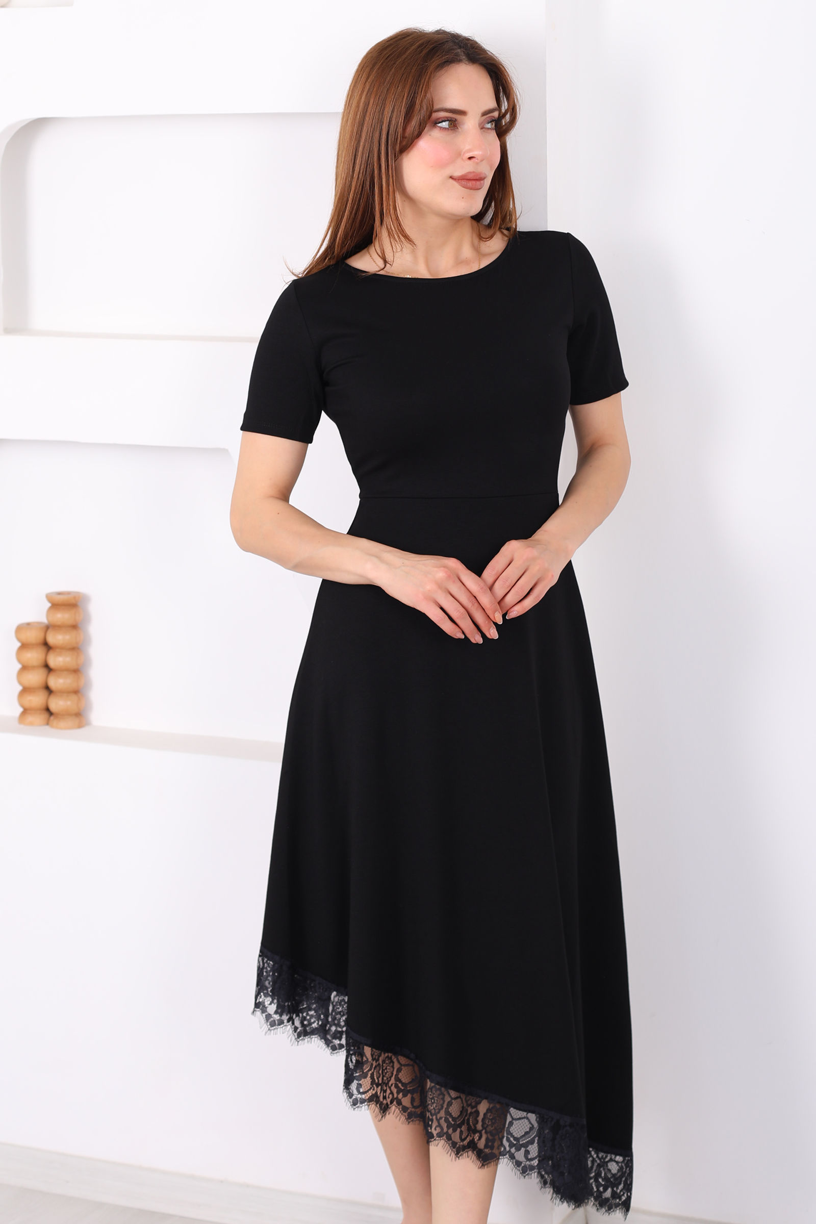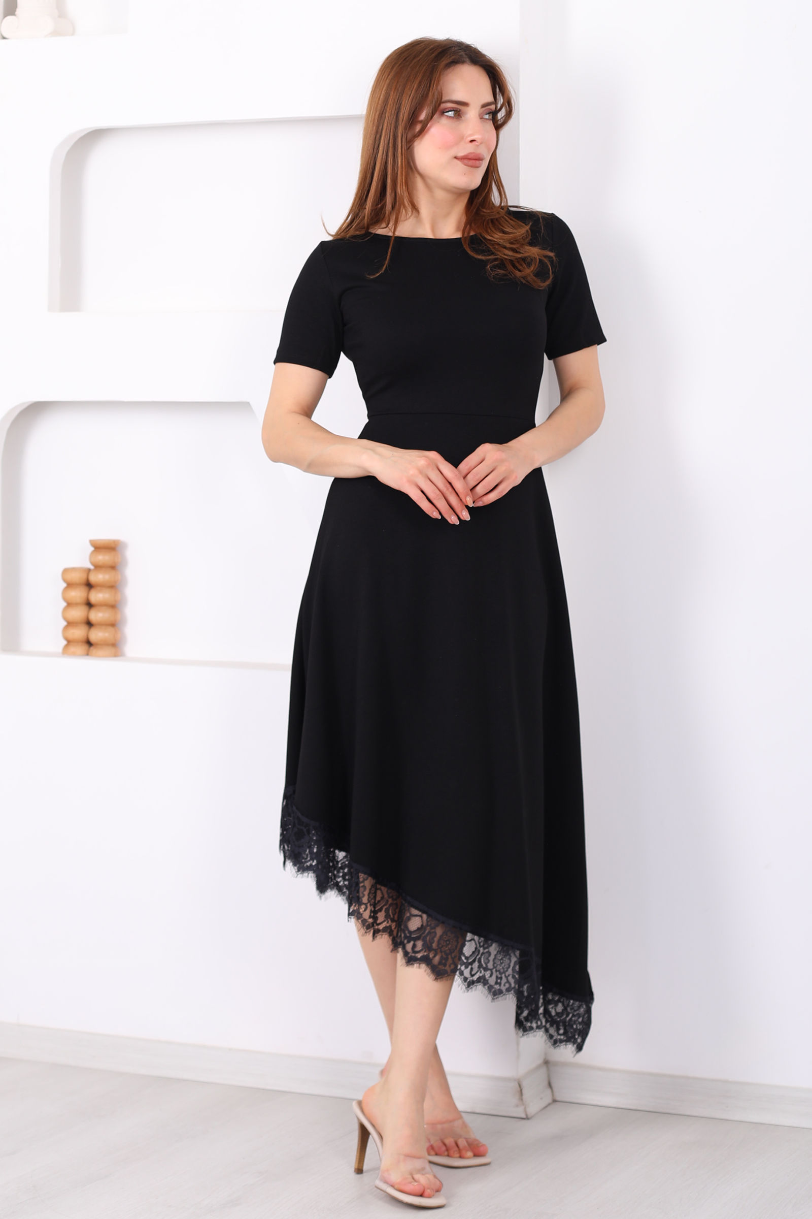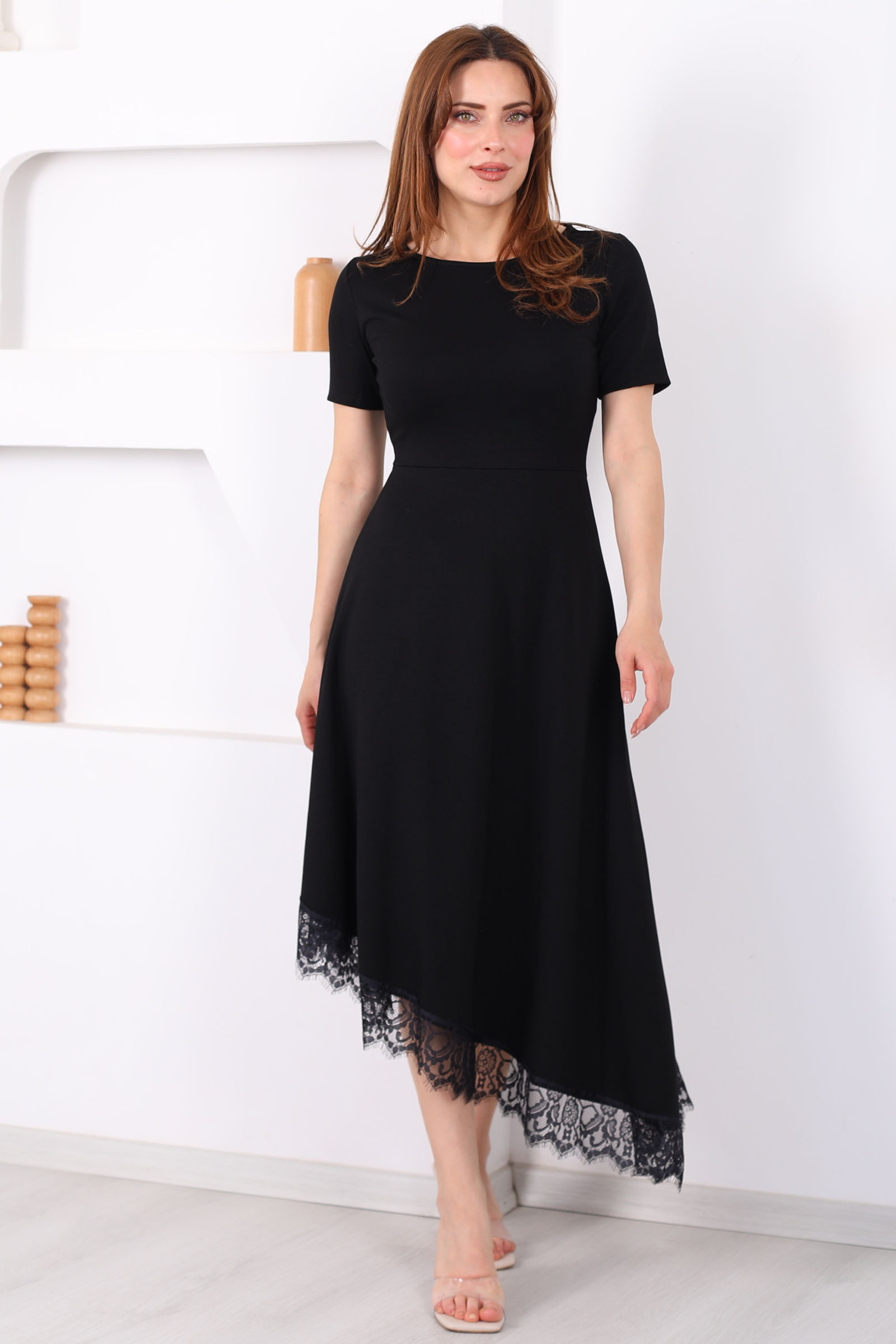 Eteği Dantelli Kadın Siyah Asimetrik Midi Modal Elbise
