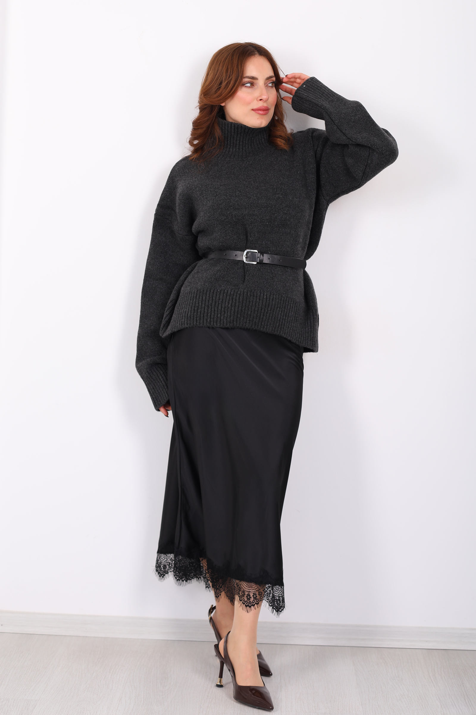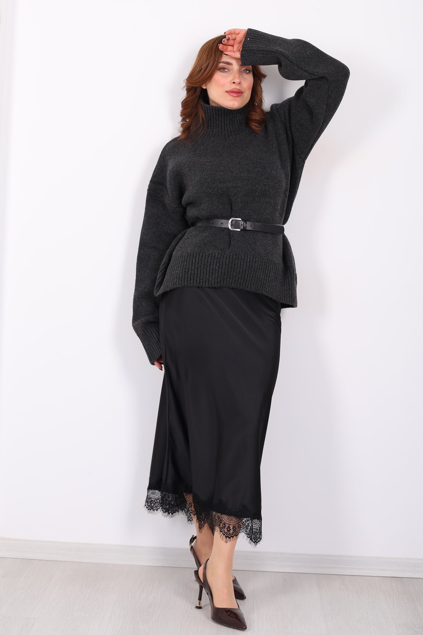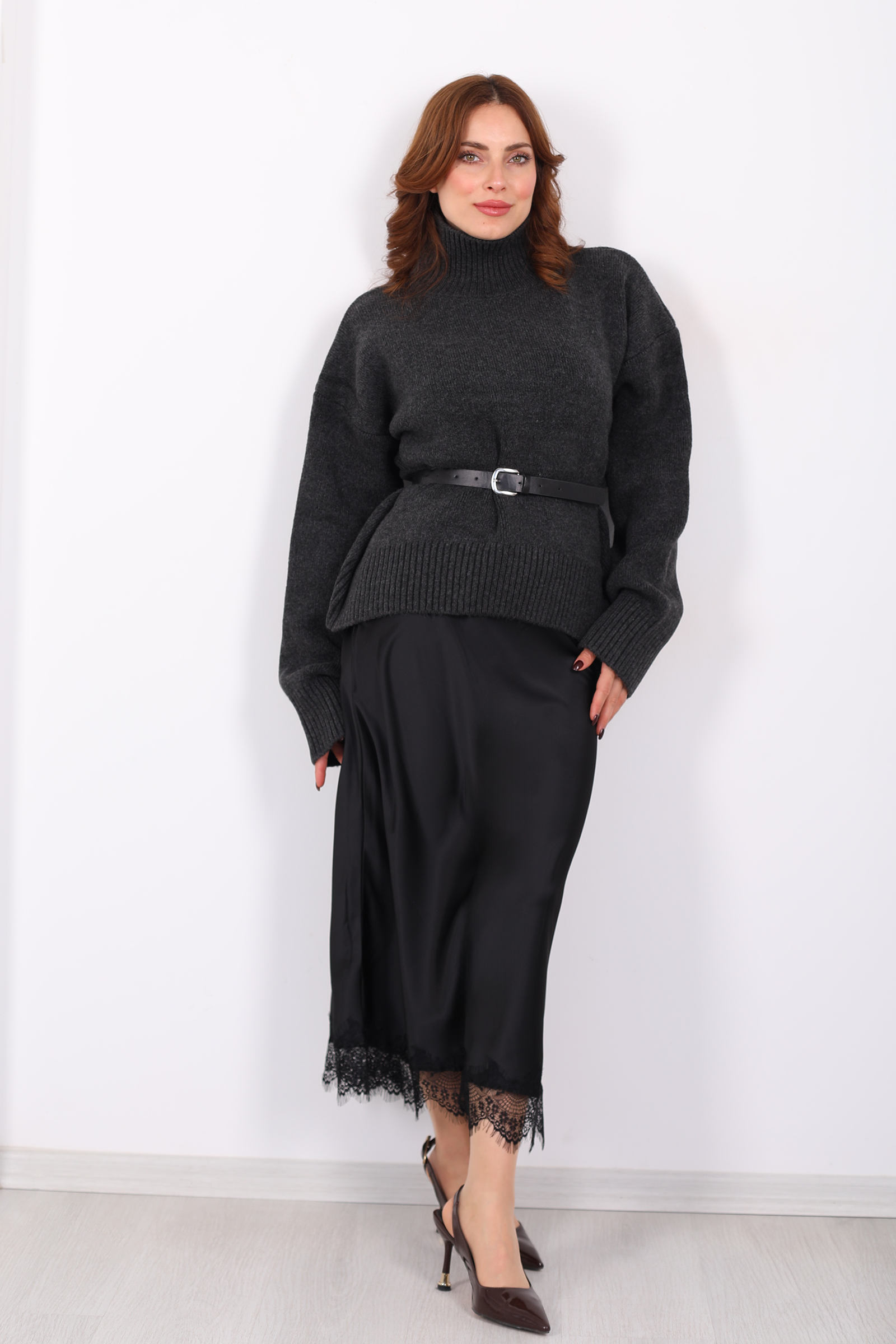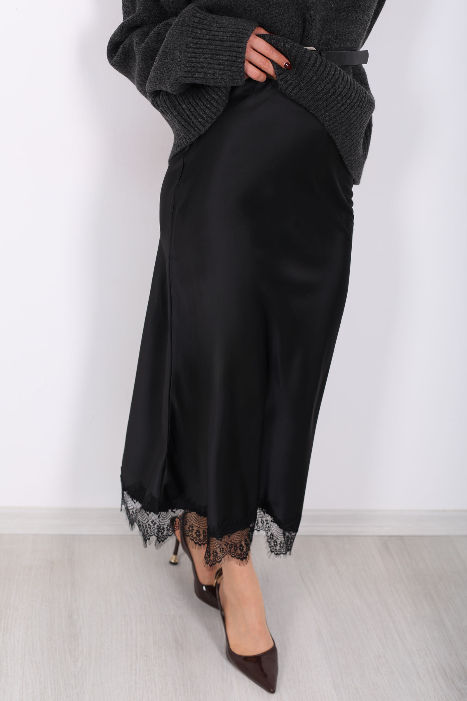 Siyahın zamansız zarafetiyle tasarlanmış bu maxi saten etek, gece şıklığını gündelik dokunuşlarla birleştiriyor. Parlak saten yüzey, yürüyüşünüze akıcı bir hareket katarken eteğin alt kısmındaki ince dantel detayı, her adımda feminen bir imza bırakır. Uzun kesimiyle zarafet ve gizem arasında dengeli bir duruş oluşturur; bu da etekle yapılan kombinlerin klasikle modern arasında köprü kurmasını sağlar.