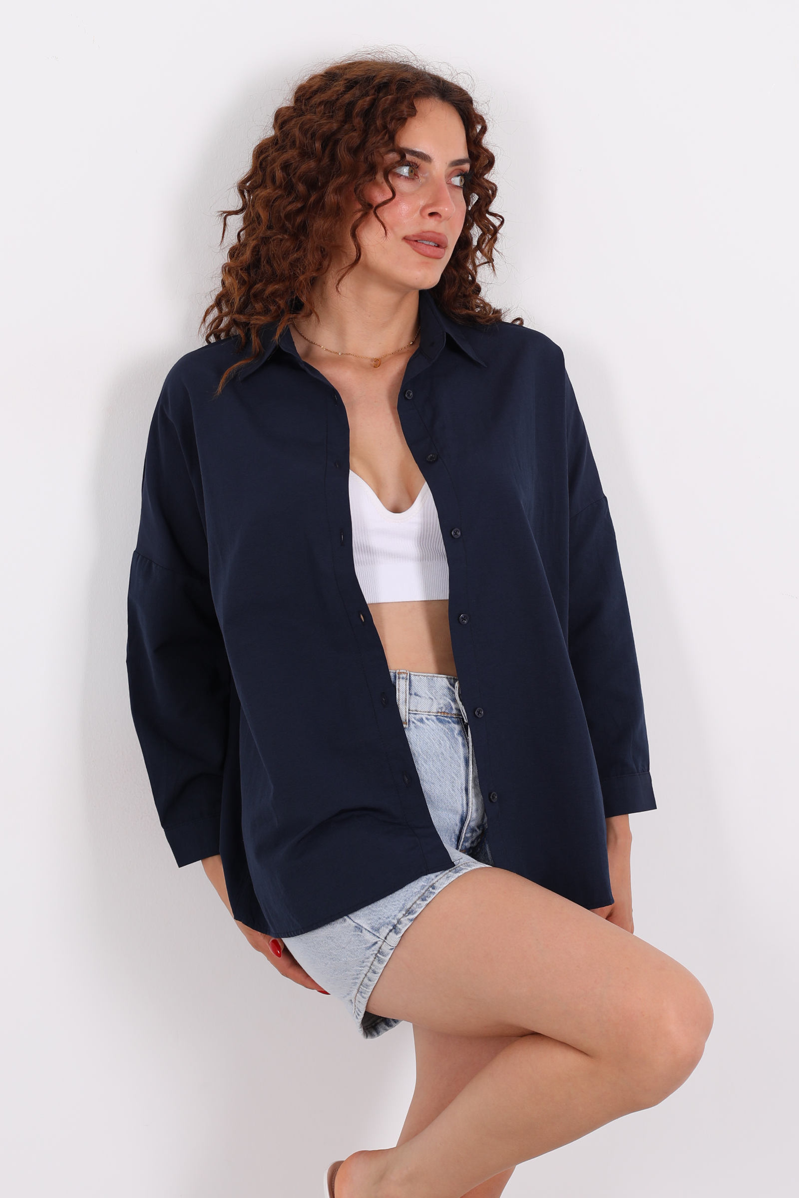 Şıklık ve rahatlığı bir arada sunan lacivert oversize kadın gömlek, modern gardıropların stil ikonu olacak bir parça. Oval kesimli eteği zarafeti vurgularken, oversize kesimi gün boyu konfor sağlar. Lacivert tonuyla hem gündüz iş şıklığını hem de akşam buluşmalarına uyum sağlayacak çok yönlü bir görünüm sunar.Hafif ve dökümlü dokusuyla her vücut tipine uyum sağlarken, düğmeli ön kapanış ve klasik yakası ile zamansız bir duruş yakalar.