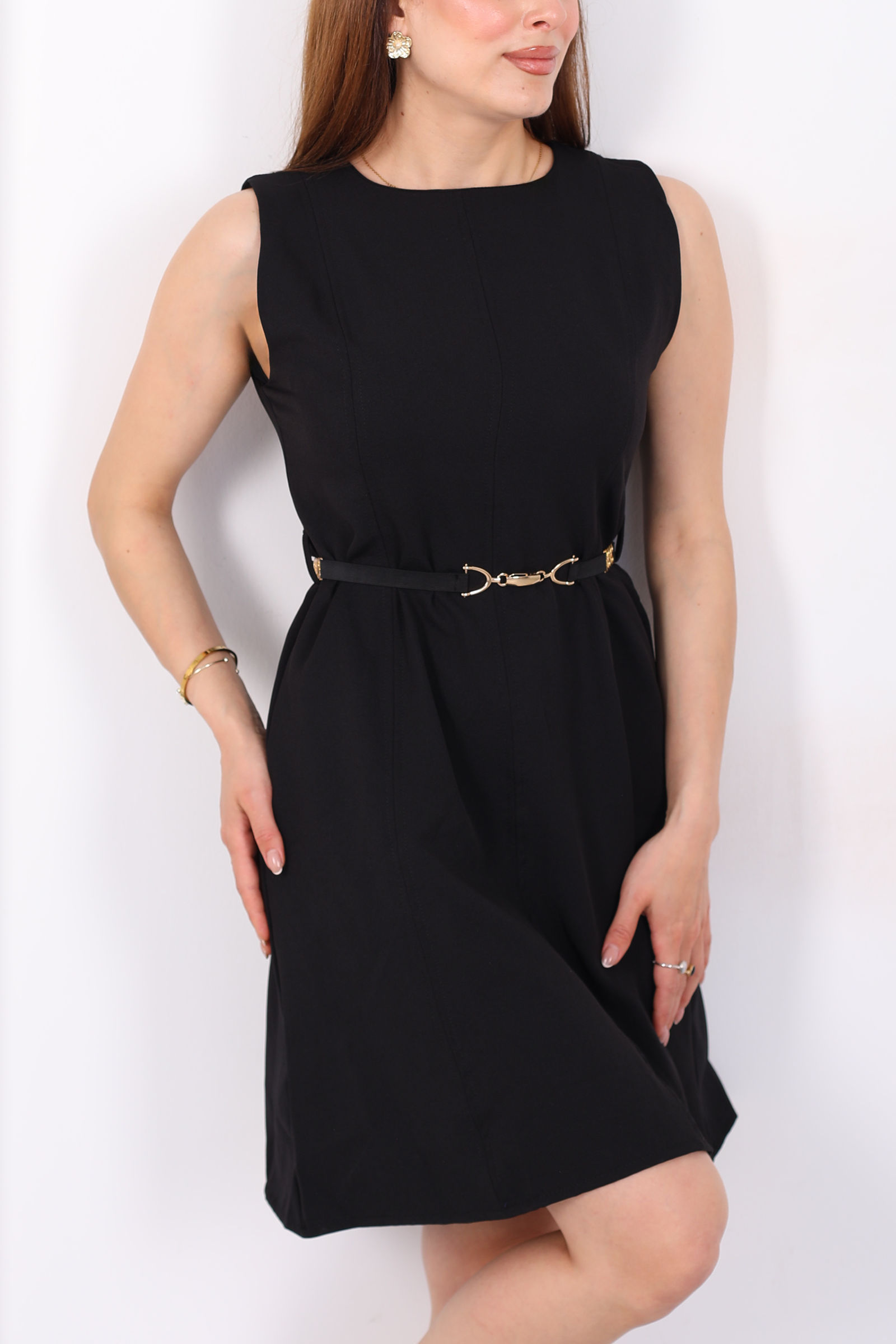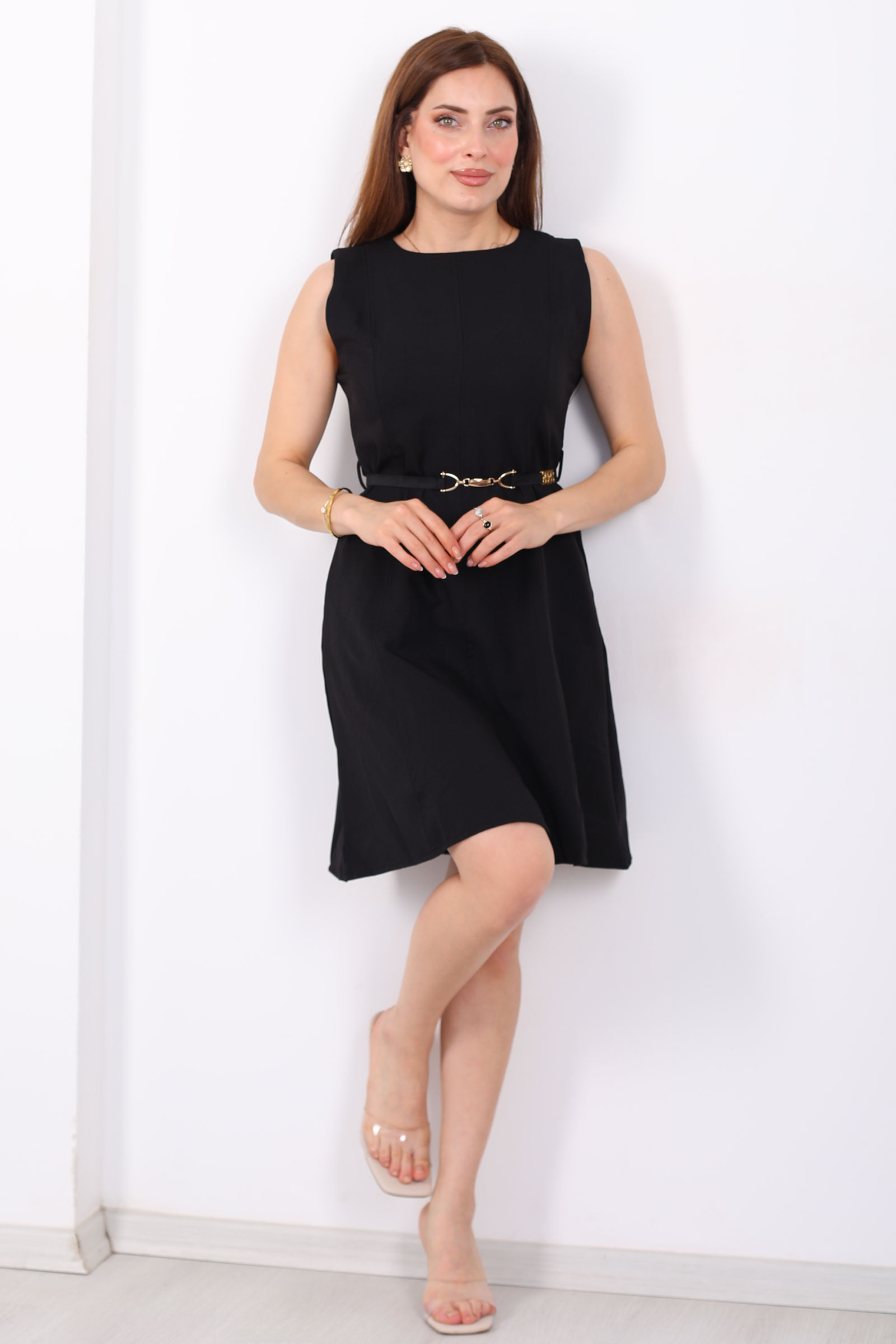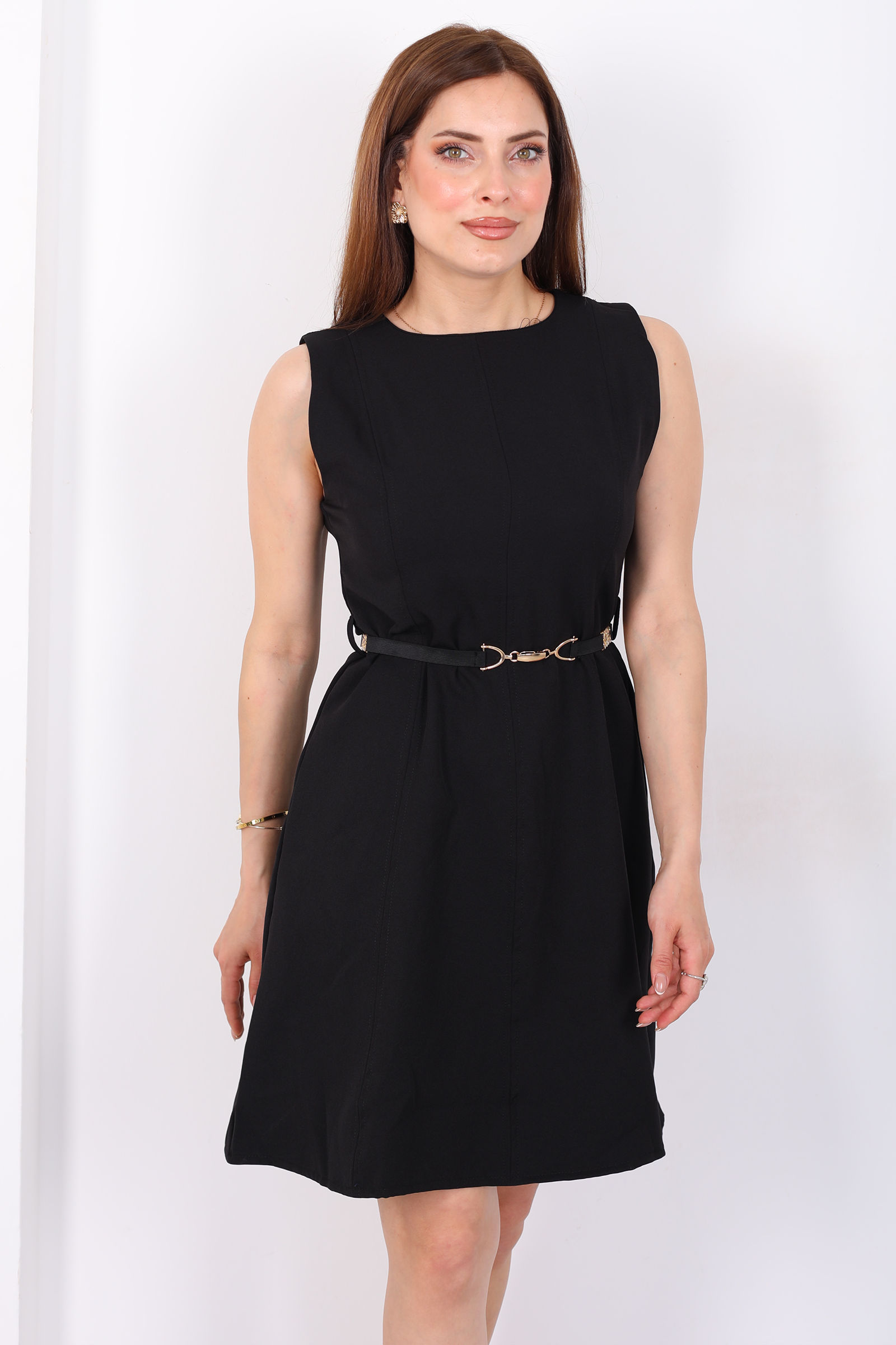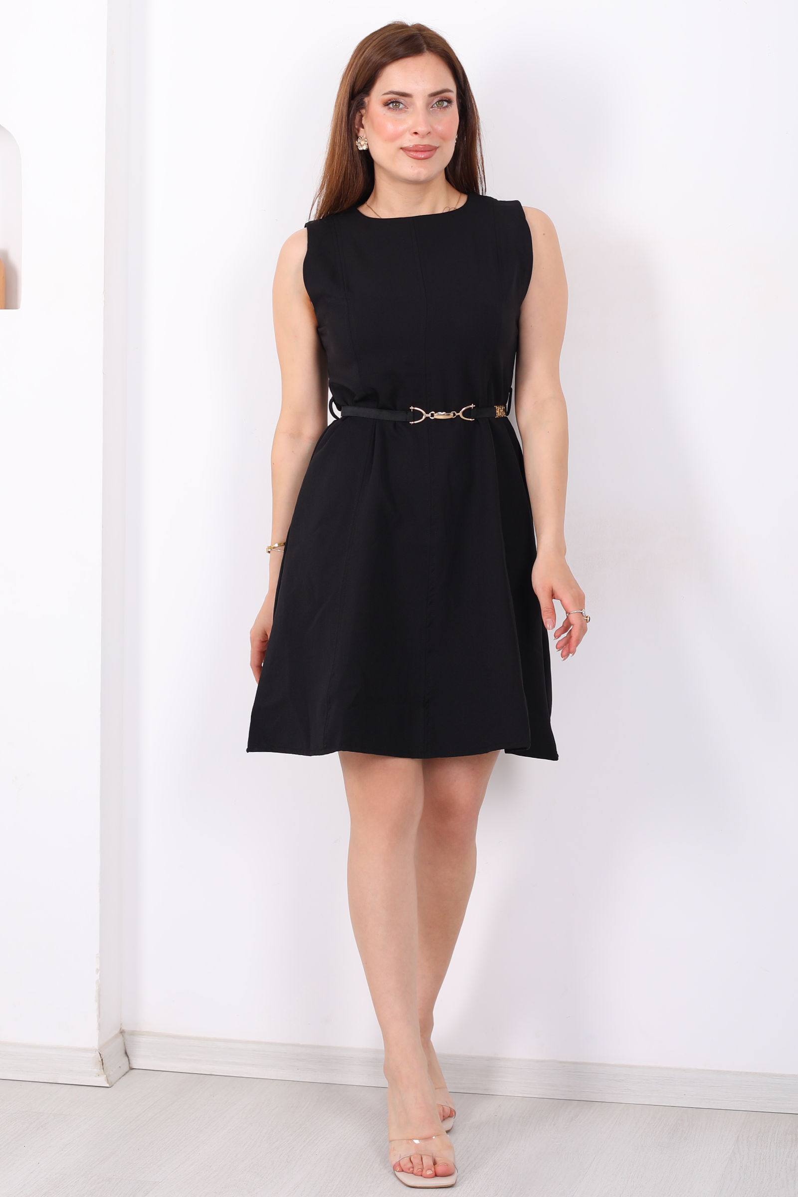Eteği Volanlı Kemerli Kadın Siyah Kolsuz Mini Elbise