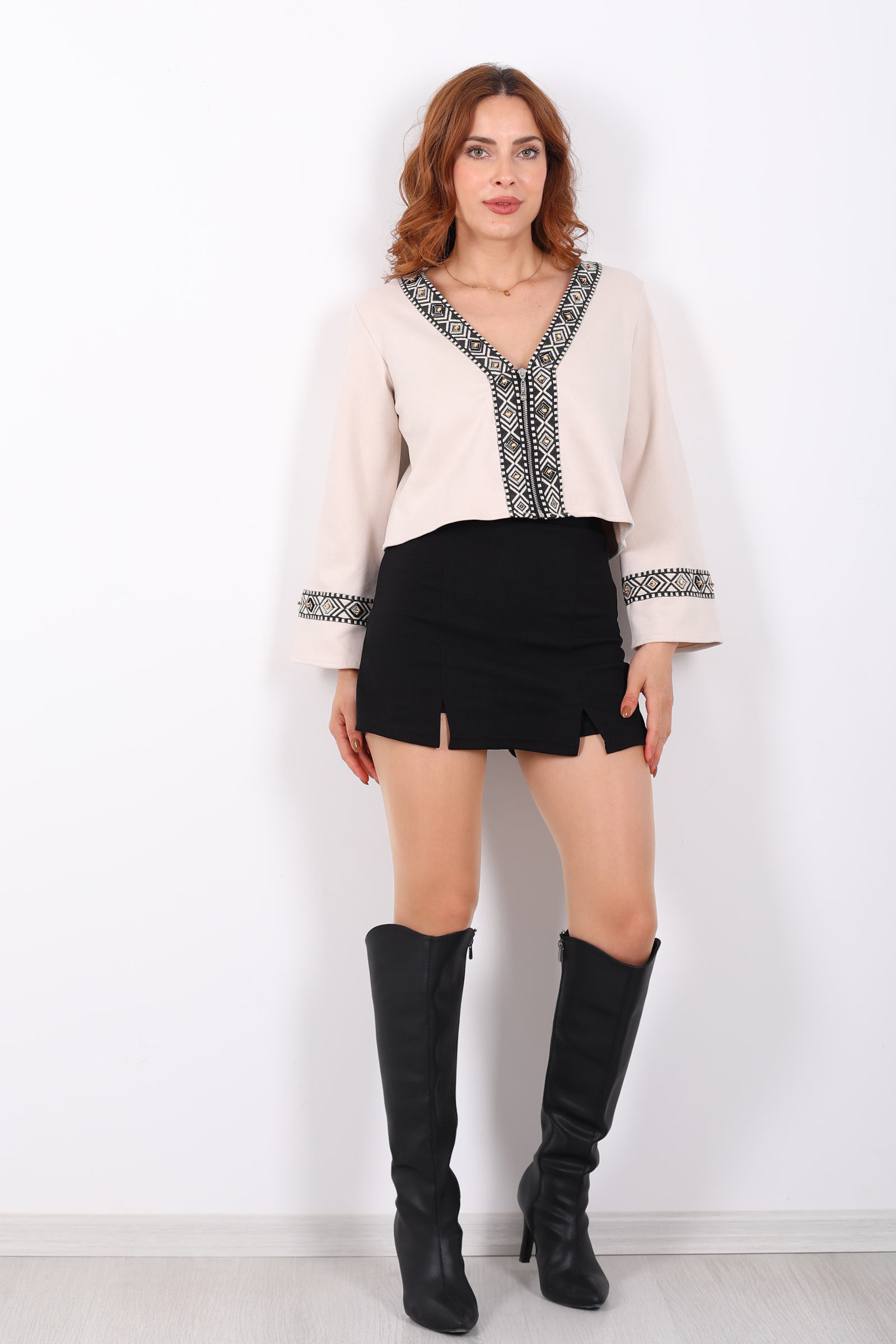 Etnik Desen Şeritli Kısa Taş Rengi Kadın Süet Ceket