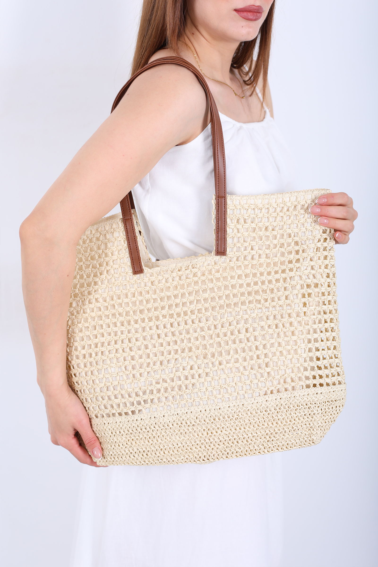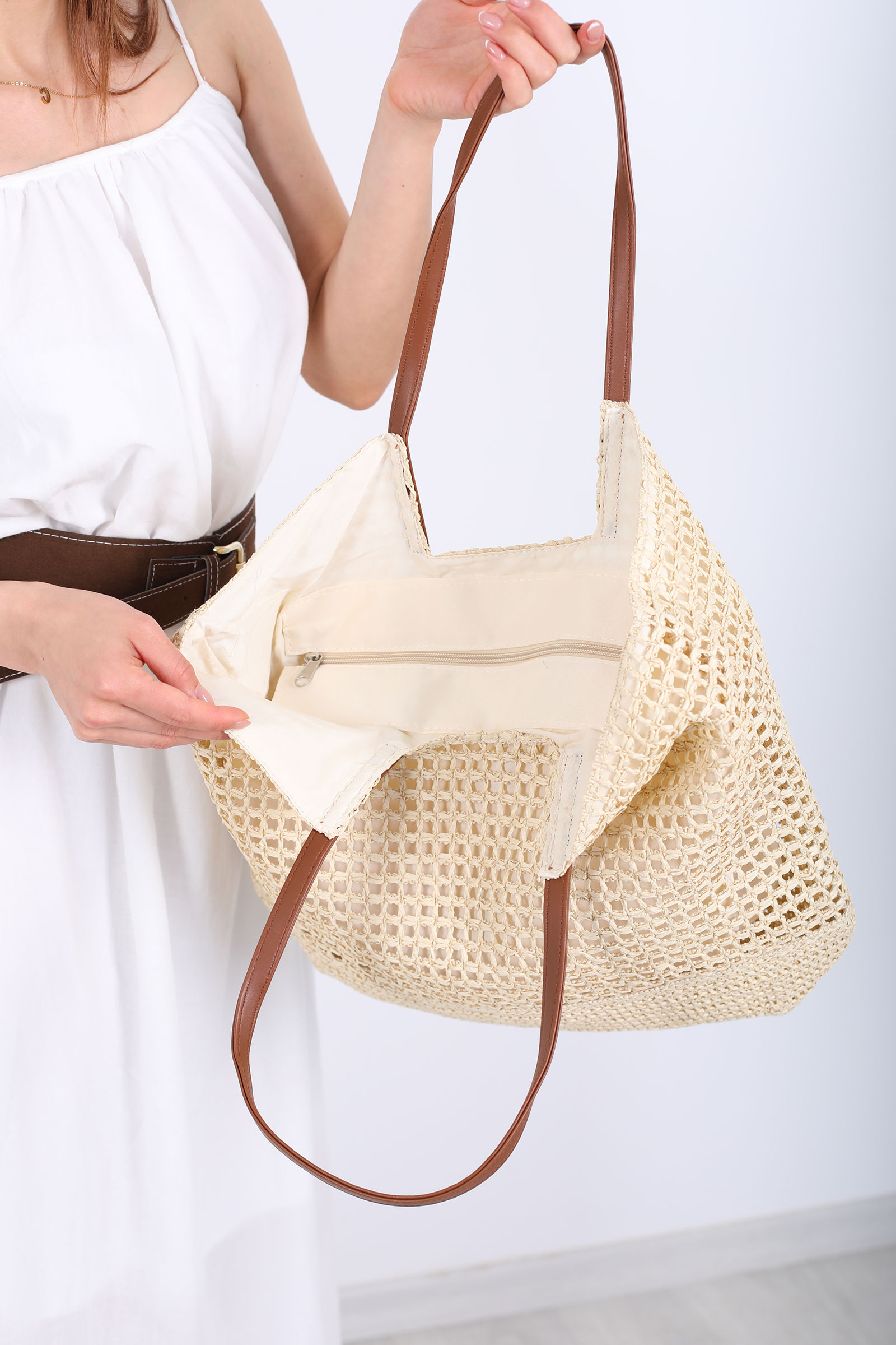 Fermuarlı Delikli Krem Hasır Omuz Çantası