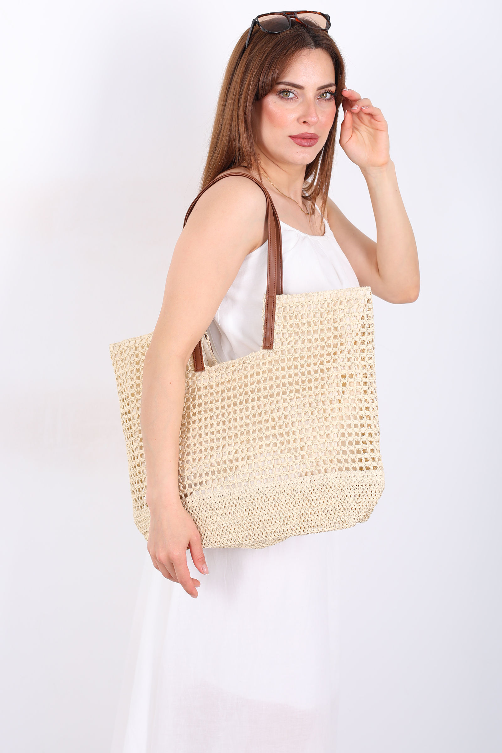 Çizgili Hasır Örme Açık Kahve Plaj Çantası