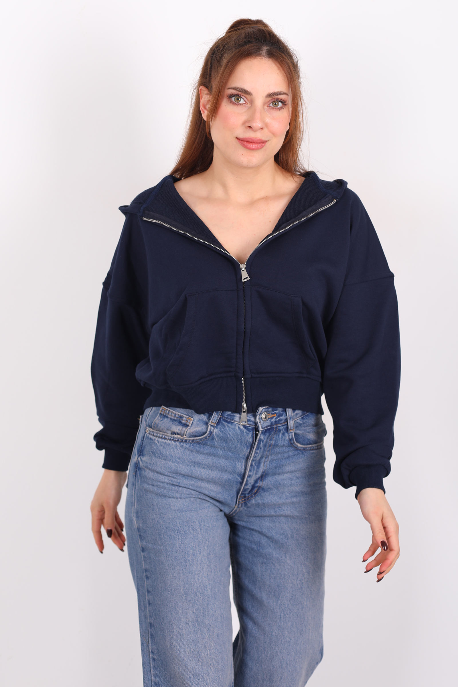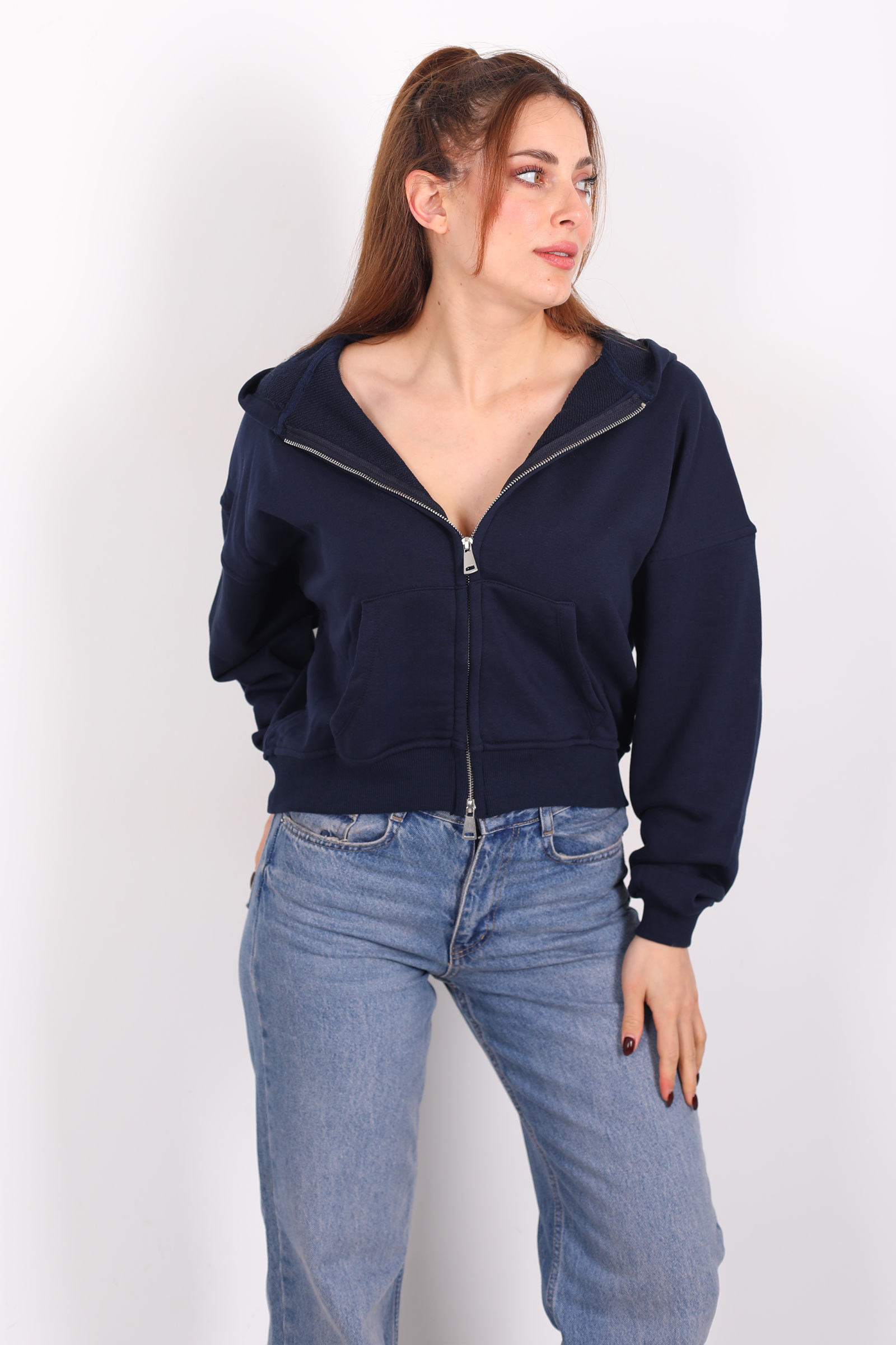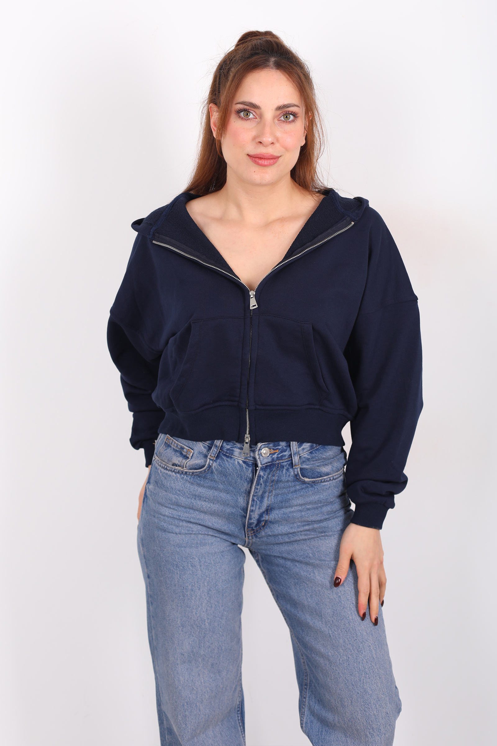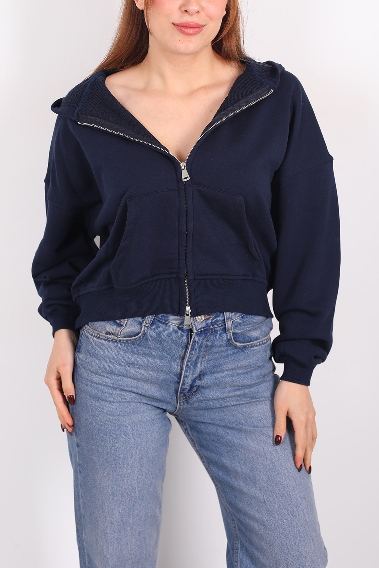 Pratik fermuar detayları hareket özgürlüğü tanırken kapüşon tasarımı serin havalarda ekstra koruma sağlar. Bu sweatshirt’ü jean, jogger ya da rahat kumaş pantolonlarla birleştirerek cool bir şehir kombini oluşturabilirsiniz. Lacivertin nötr ama karakterli rengi, aksesuarlarla kolay stil oyunları yapmanıza olanak tanır. Minimal çizgide ama etkisi yüksek bir günlük dış giyim parçasıdır.