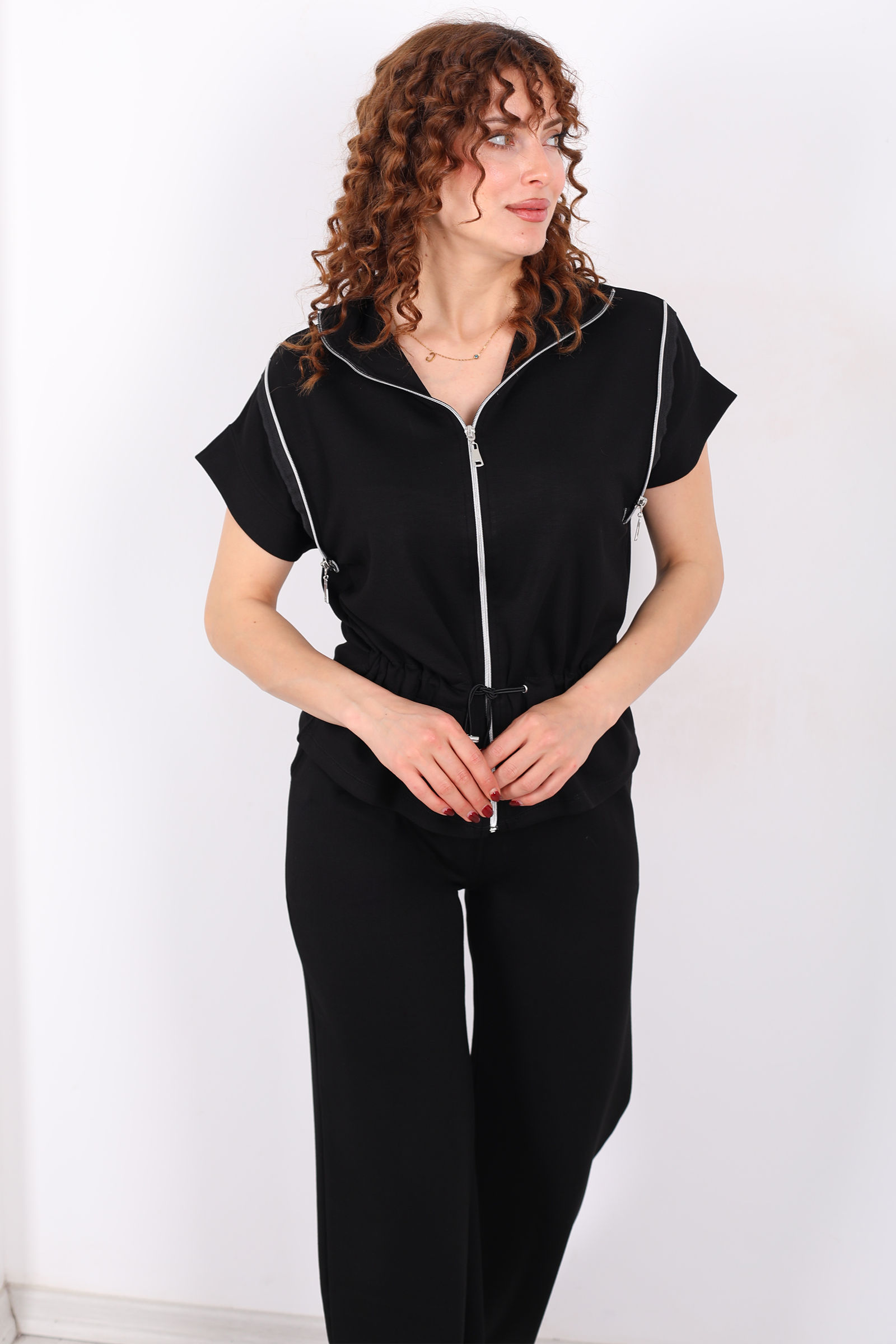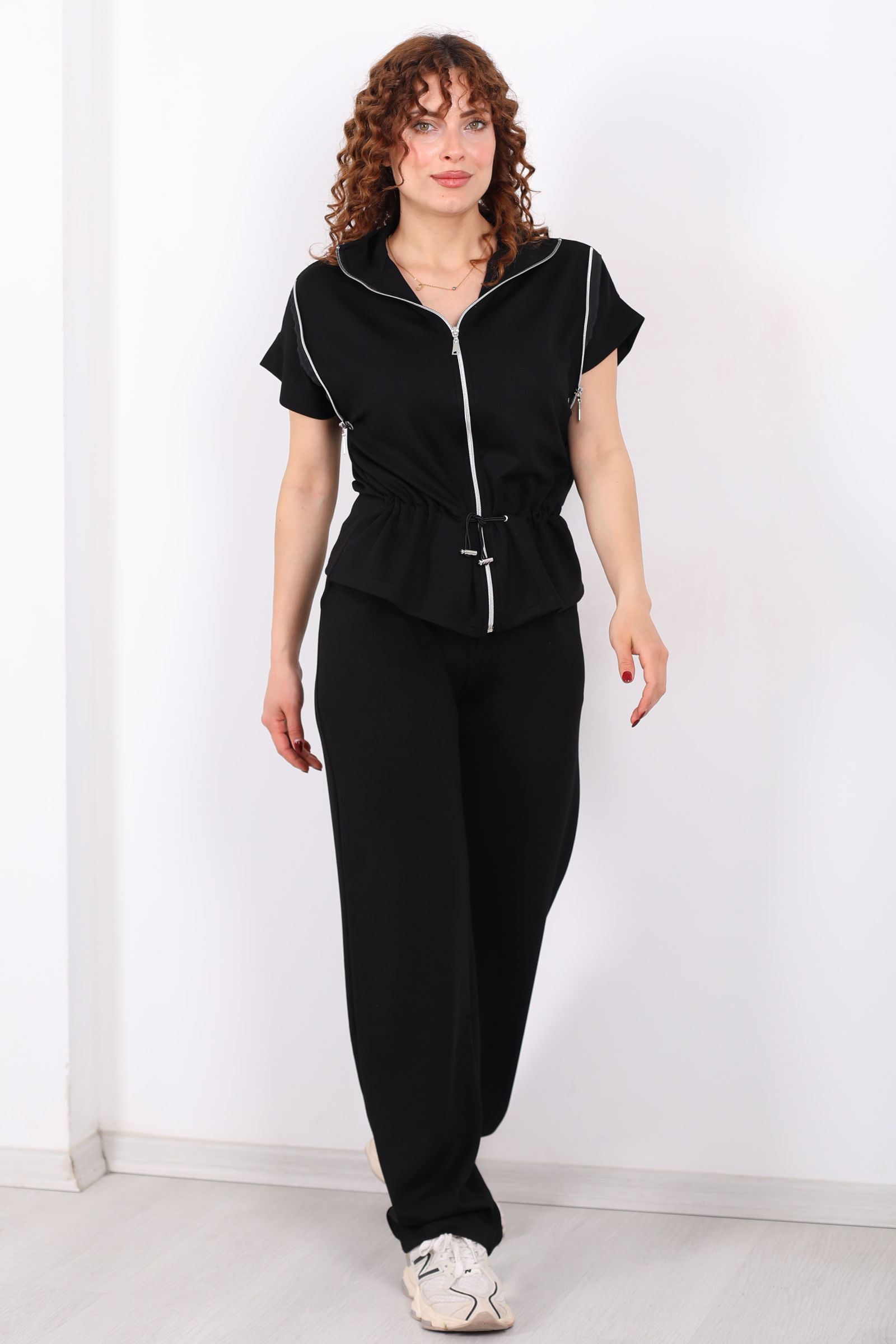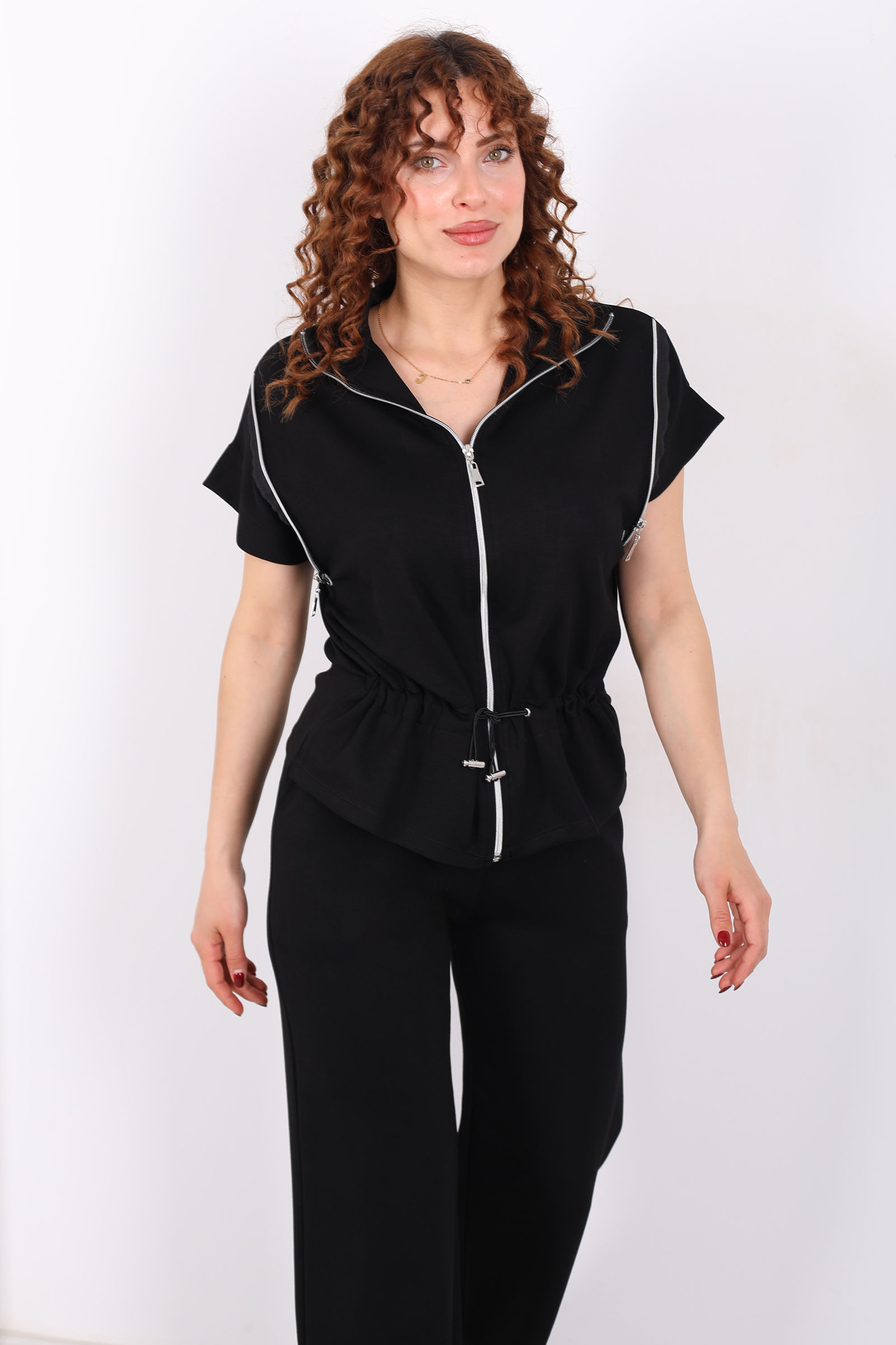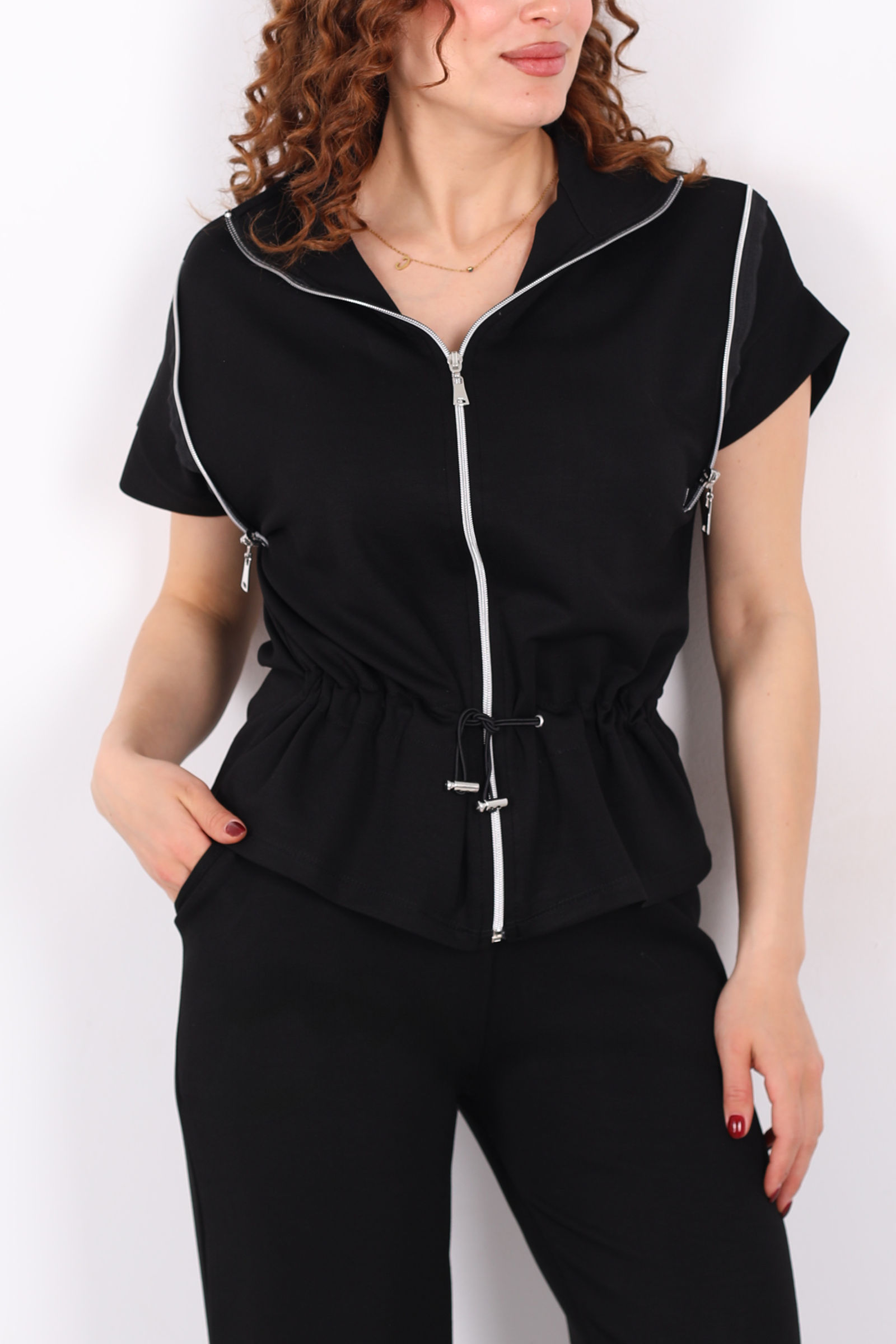 Fermuarlı Kısa Kol Stoperli Siyah Kadın Takım