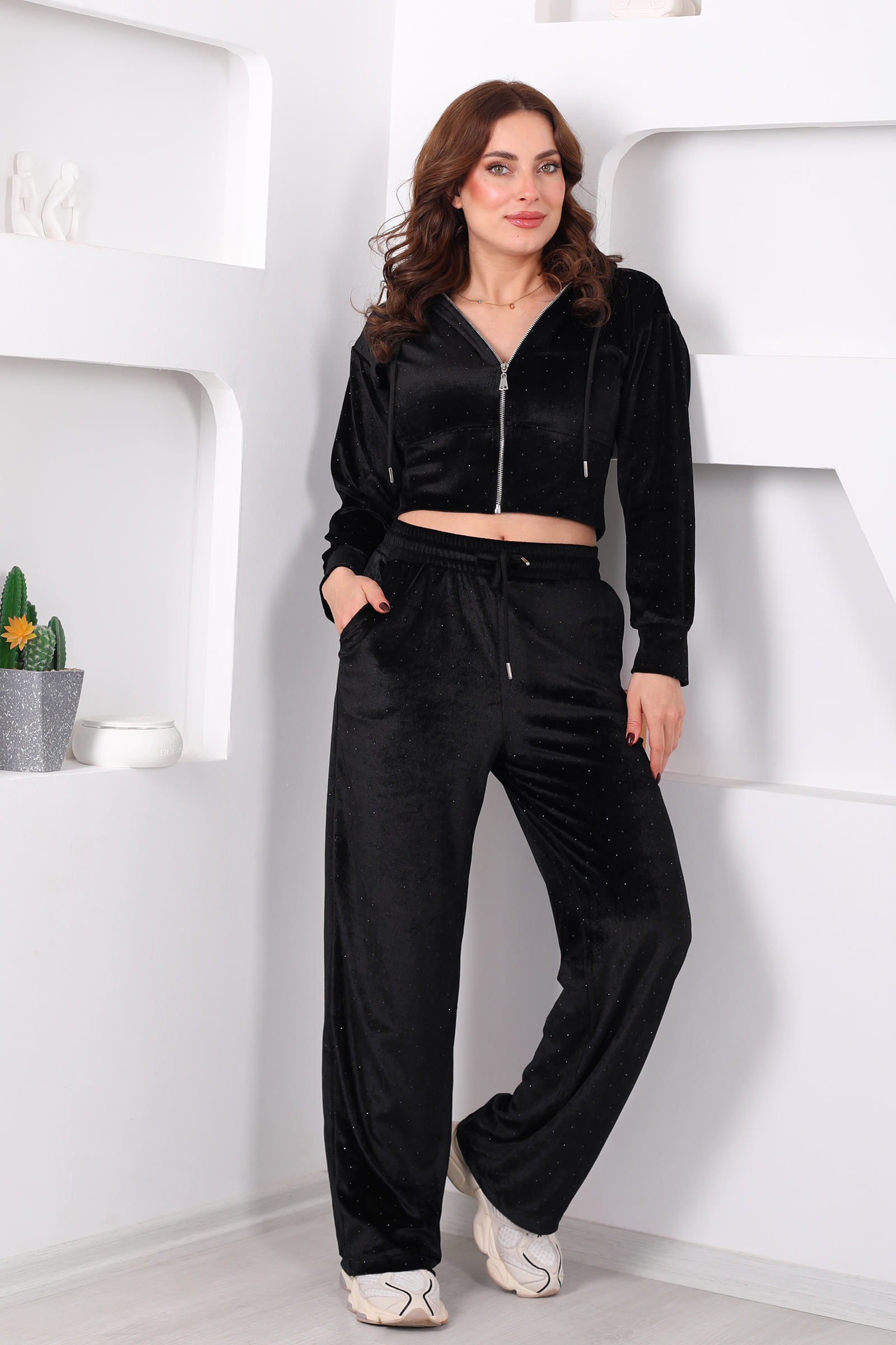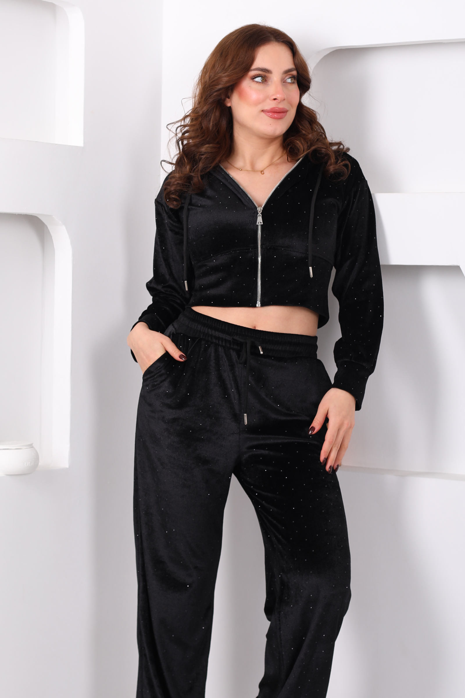Fermuarlı Taşlı Ceket Pantolon Siyah Kadın Kadife Takım