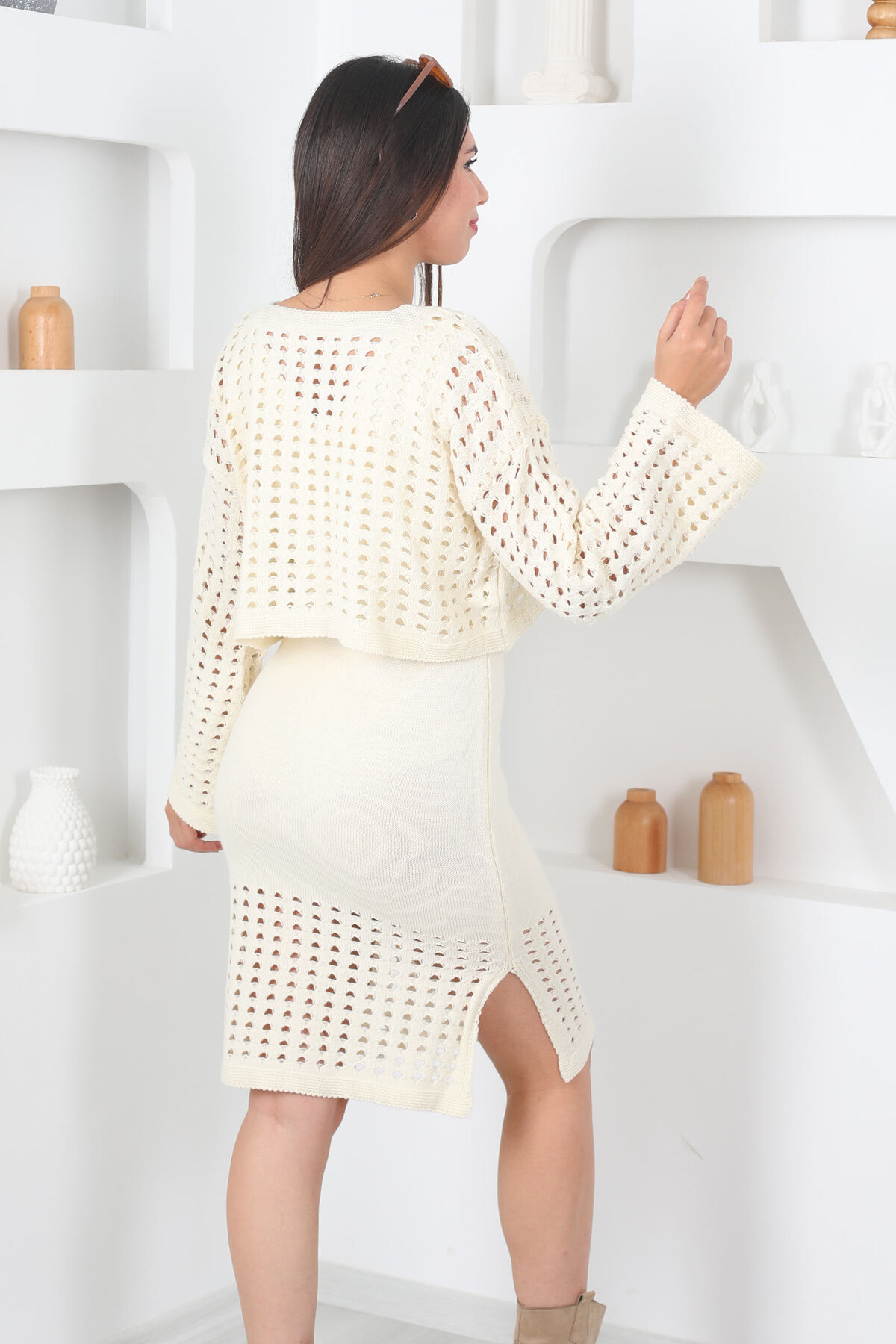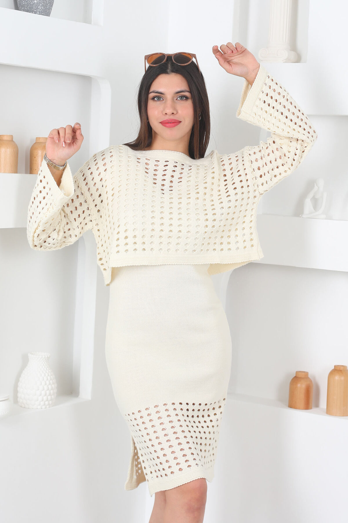 Fileli Kadın Taş Rengi Triko Crop Elbise Takım