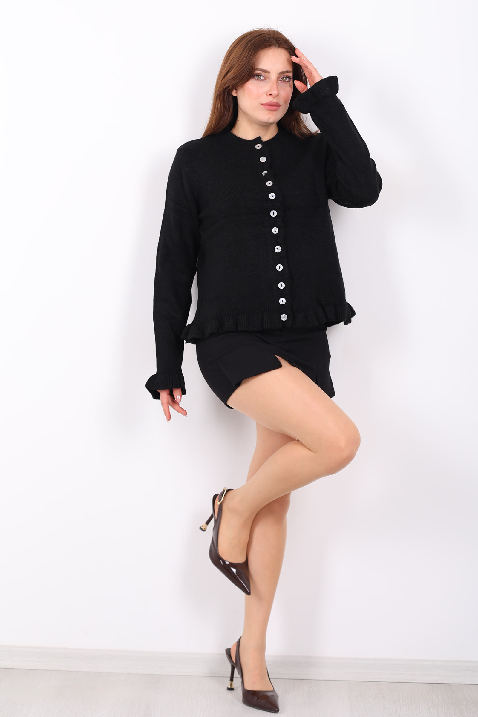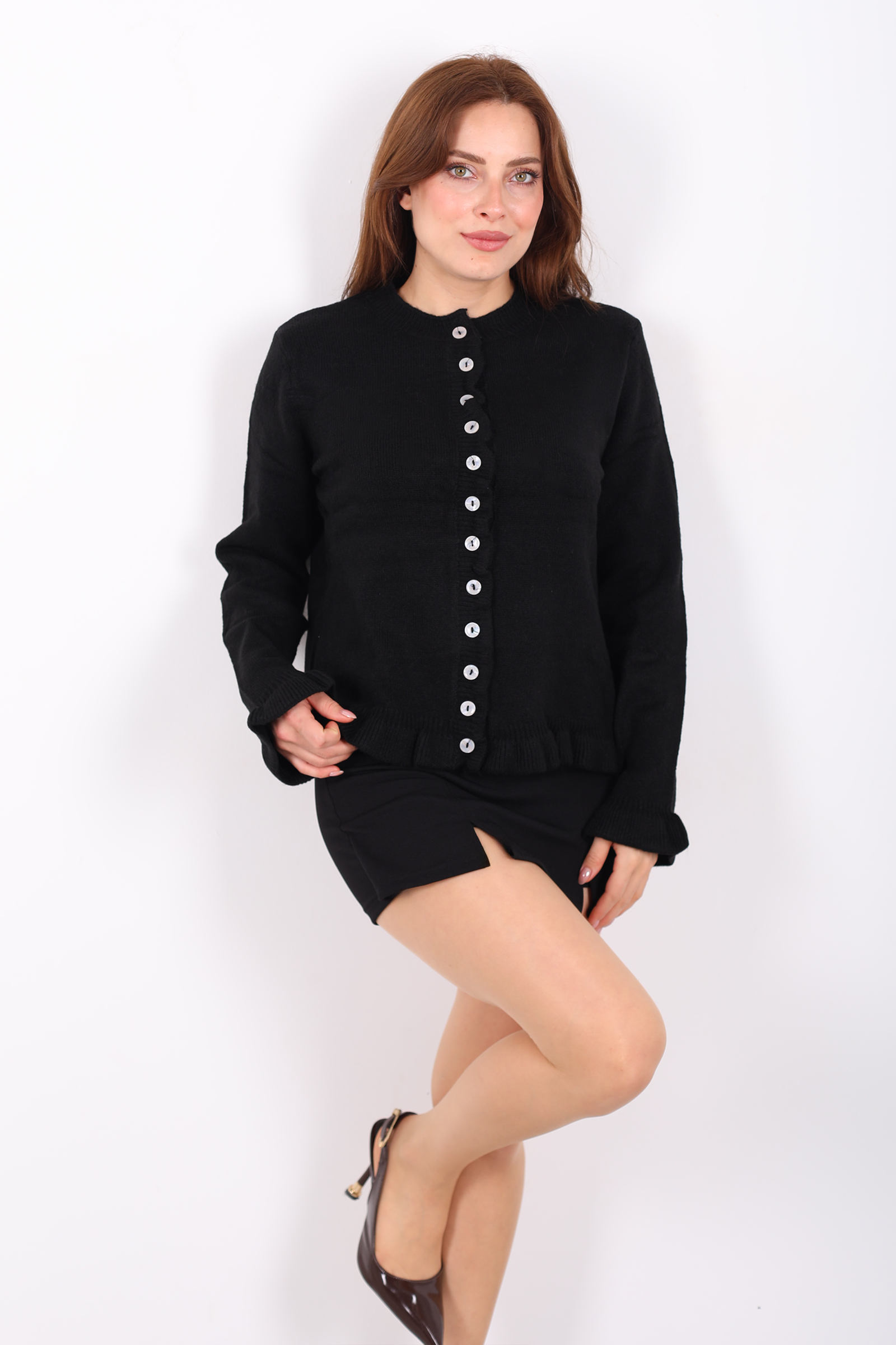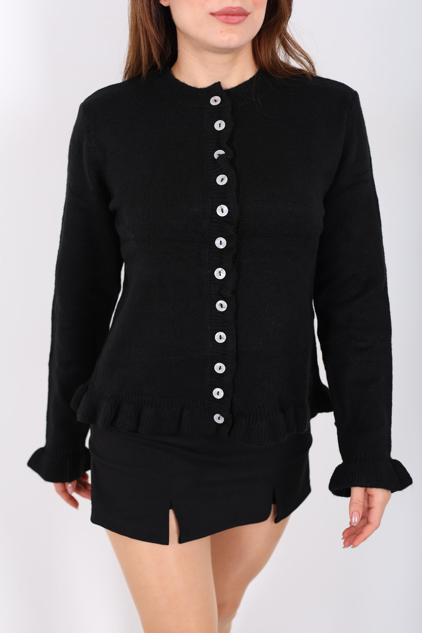 Bu siyah firfirli triko hırka, klasik hırka modeline zarif bir feminen dokunuş ekleyen detaylarla öne çıkıyor. Ön kısmındaki düğmeler, sade yapıya şık bir hareket kazandırırken; uçlardaki firfirler parçaya yumuşak bir hava veriyor. Esnek örgü stili, farklı üstlerle rahat kombinlenebilecek şekilde tasarlandı. Siyahın çok yönlü tonuyla jean, kumaş pantolon ya da eteklerle kolaylıkla eşleşir; günün her saatinde stilinizi tamamlar. Serin havalarda üzerine hafif bir dış giyim eklemek için de ideal olan bu parça, gardırobunuzu zenginleştirecek günlük favorilerden biri olacak.