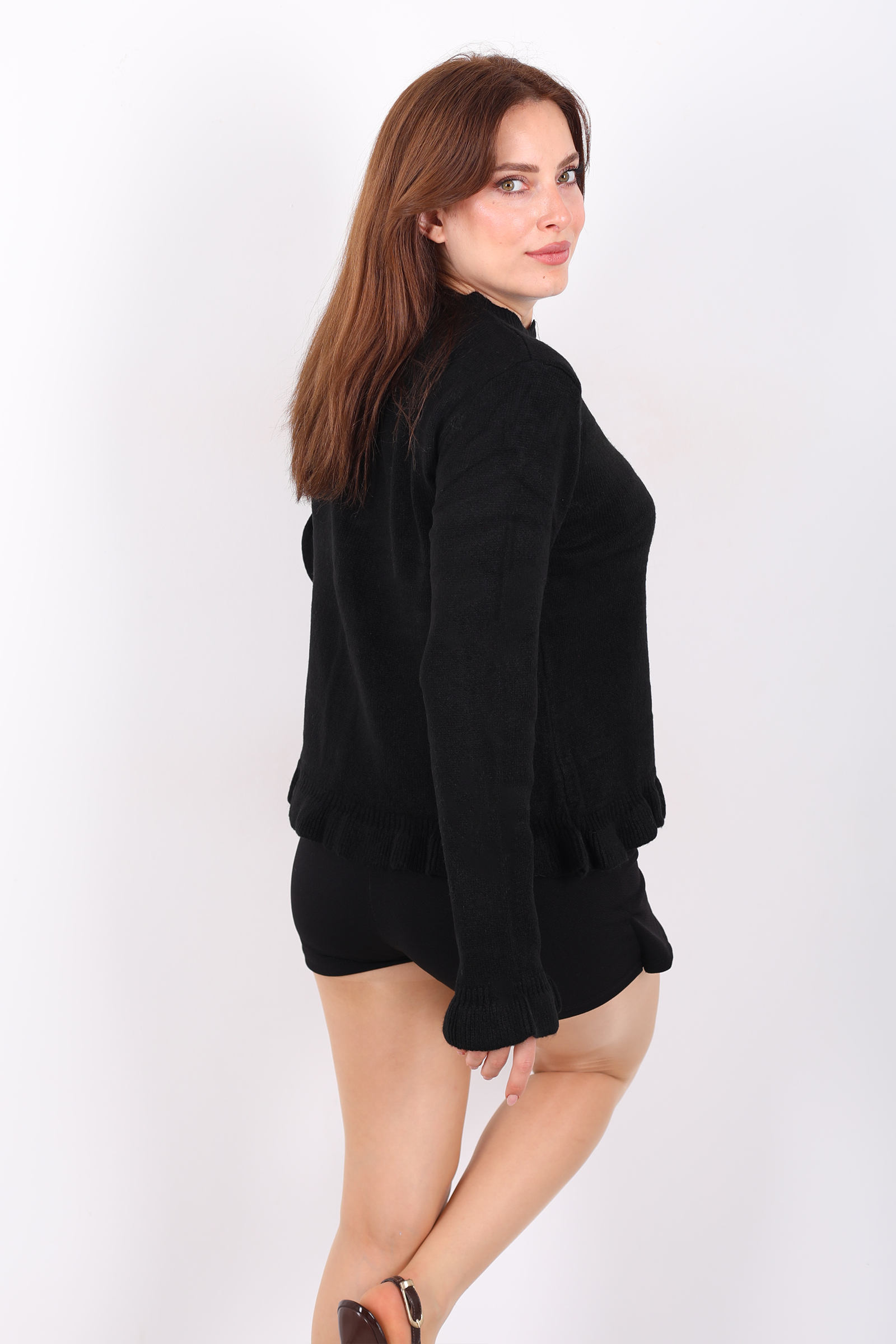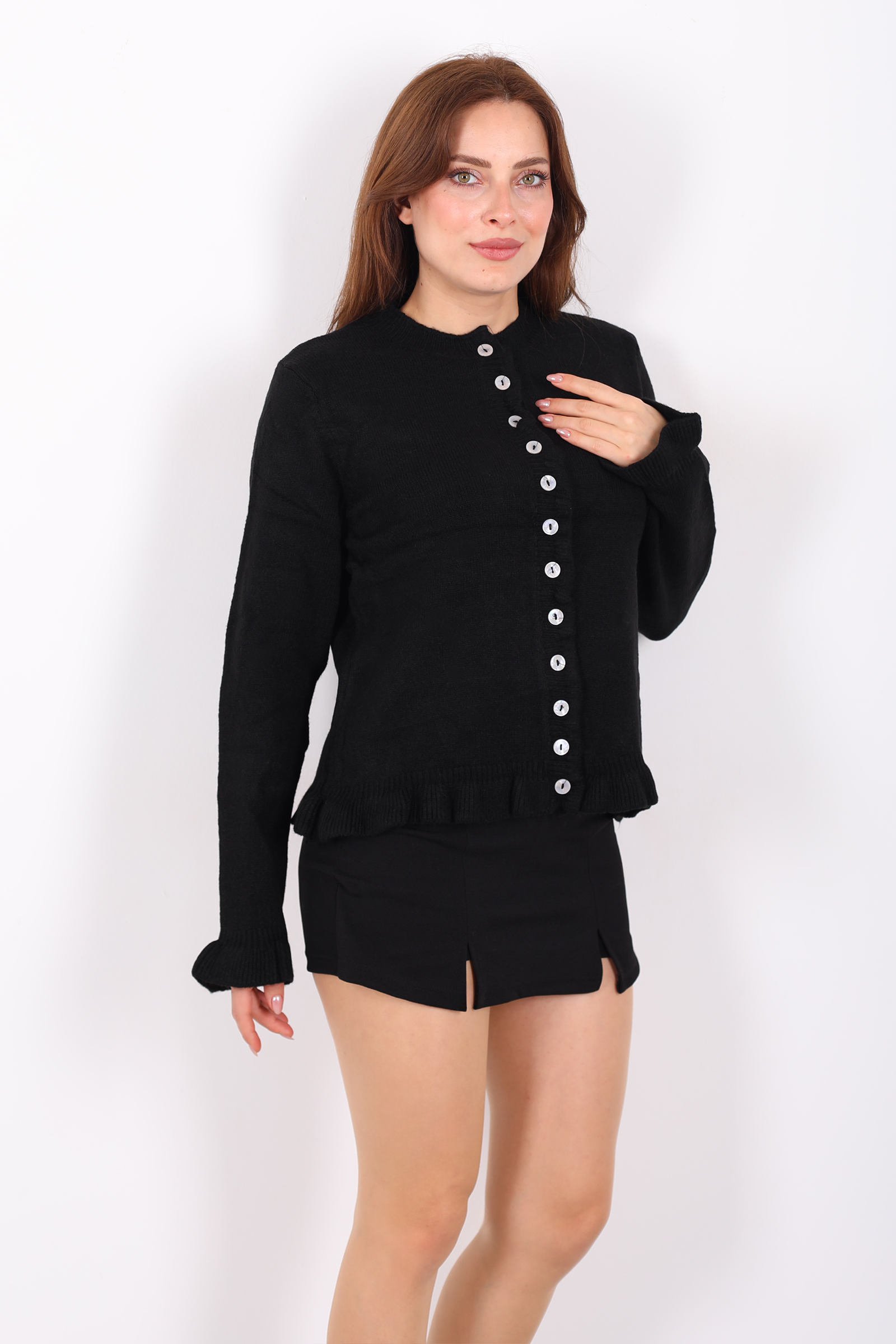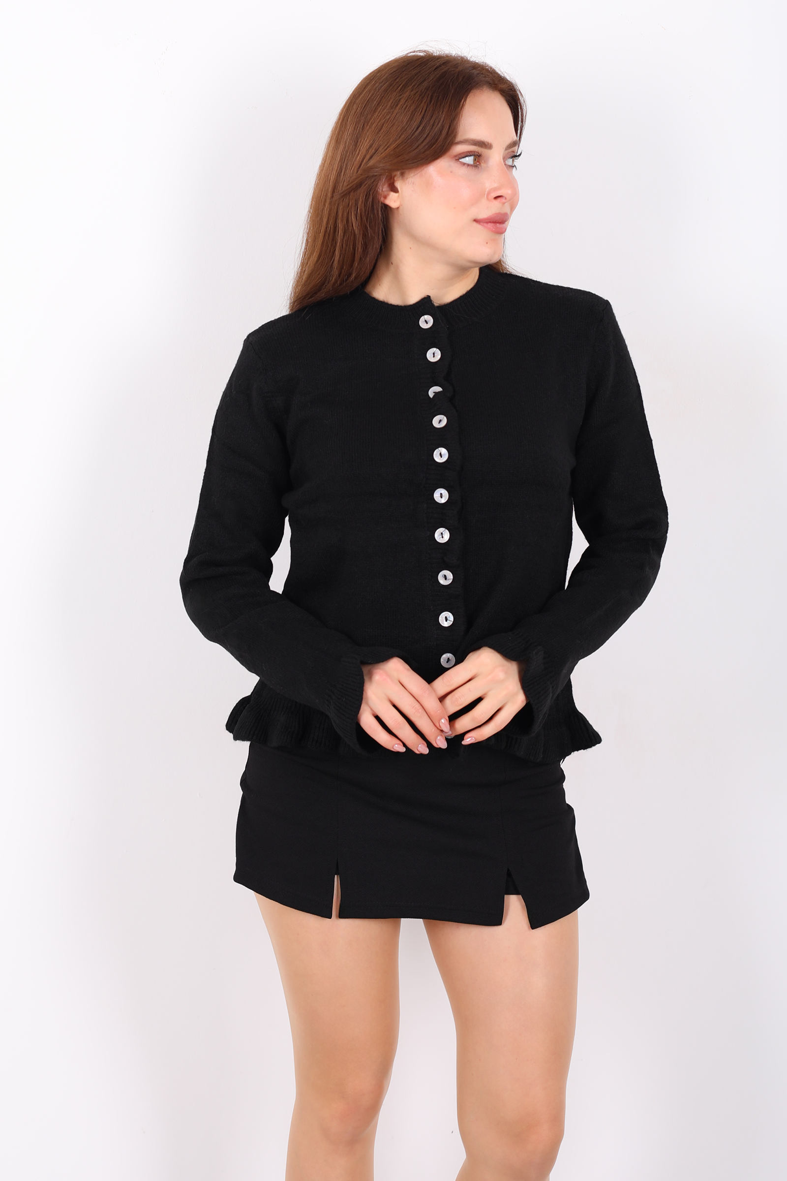 Bu siyah firfirli triko hırka, klasik hırka modeline zarif bir feminen dokunuş ekleyen detaylarla öne çıkıyor. Ön kısmındaki düğmeler, sade yapıya şık bir hareket kazandırırken; uçlardaki firfirler parçaya yumuşak bir hava veriyor. Esnek örgü stili, farklı üstlerle rahat kombinlenebilecek şekilde tasarlandı. Siyahın çok yönlü tonuyla jean, kumaş pantolon ya da eteklerle kolaylıkla eşleşir; günün her saatinde stilinizi tamamlar. Serin havalarda üzerine hafif bir dış giyim eklemek için de ideal olan bu parça, gardırobunuzu zenginleştirecek günlük favorilerden biri olacak.