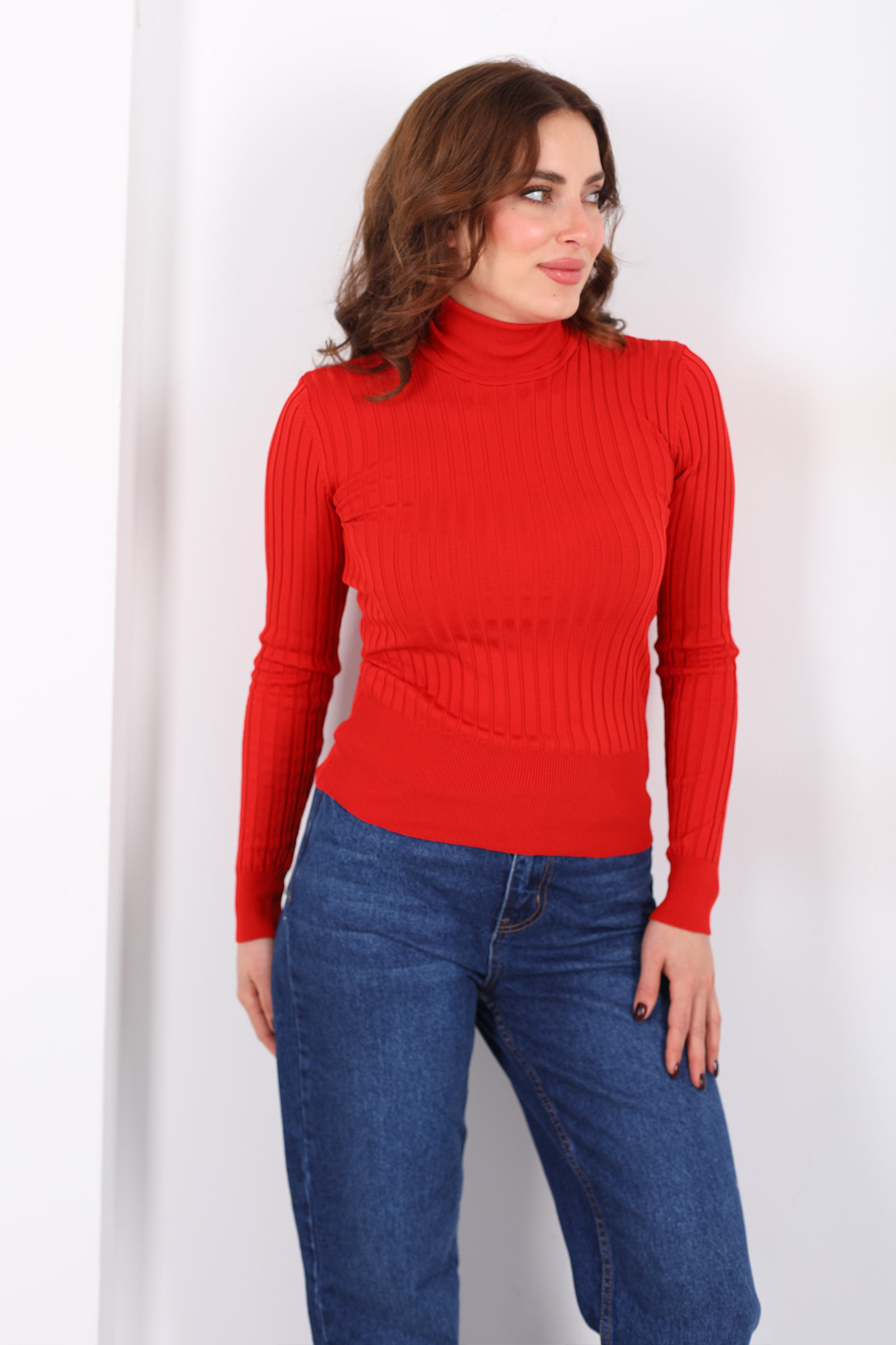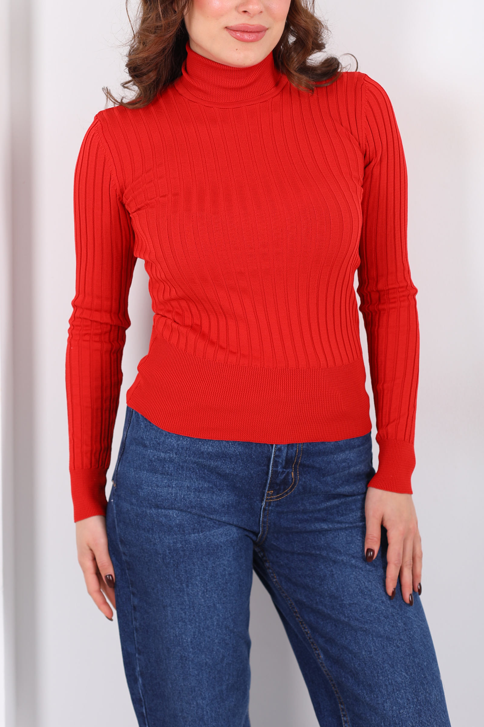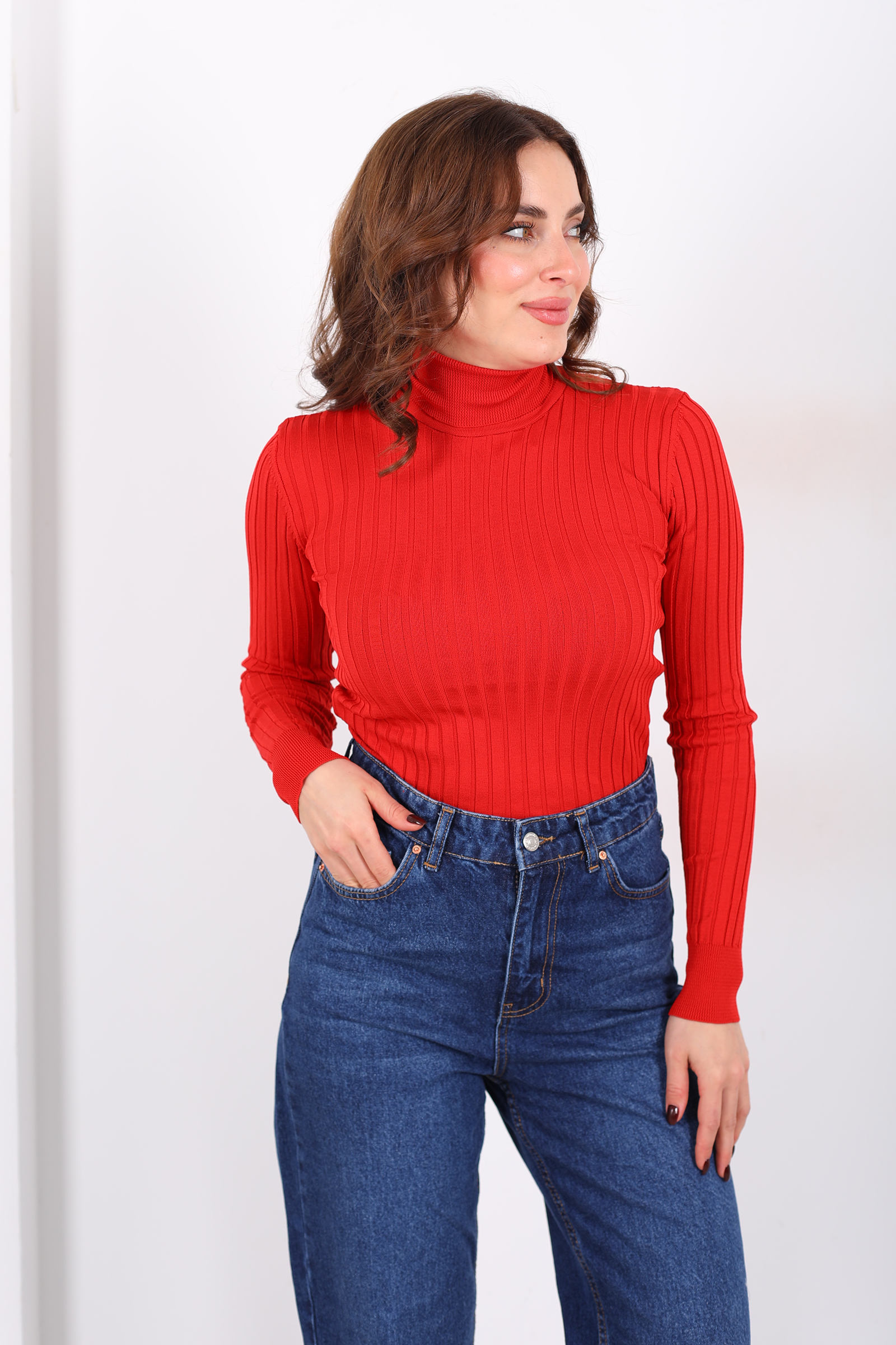 Fitilli Balıkçı Yaka Kırmızı Kadın Triko Kazak