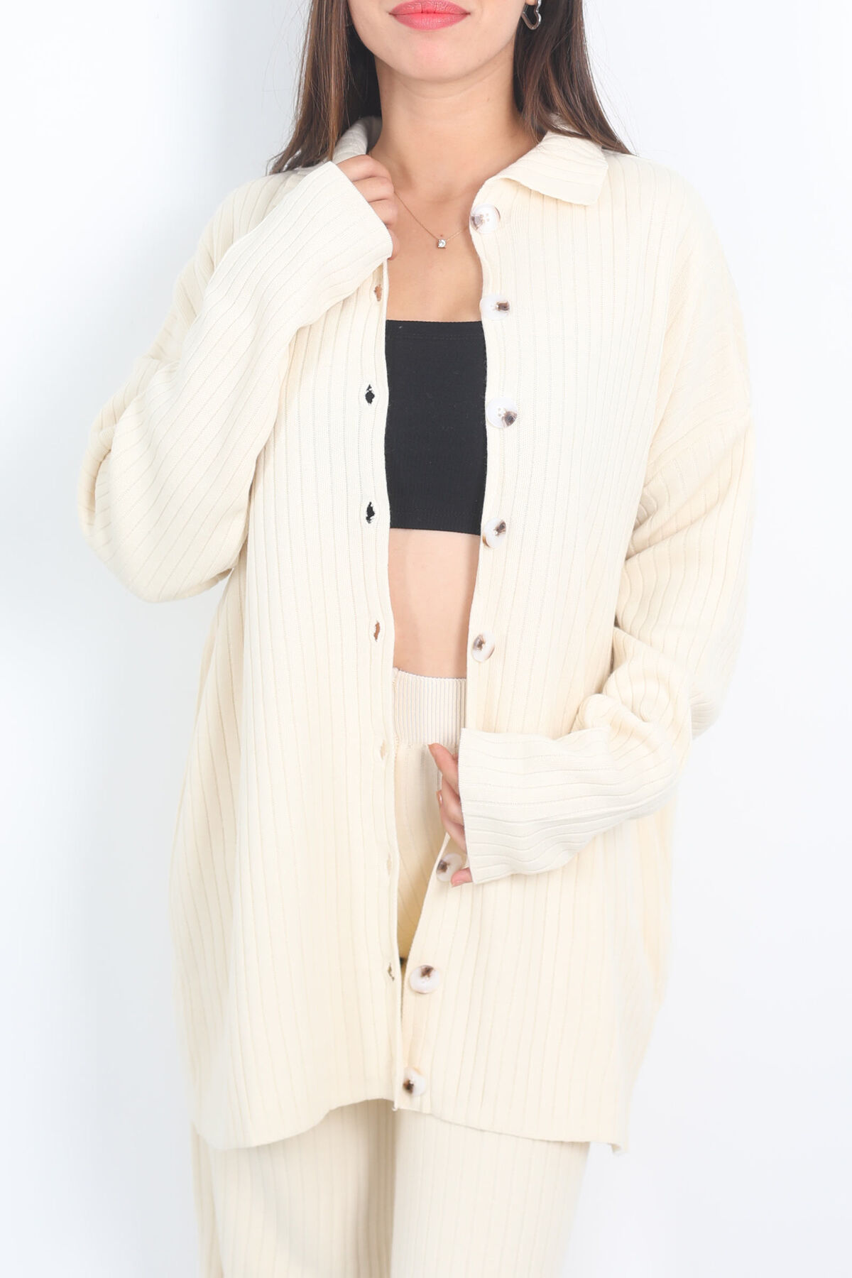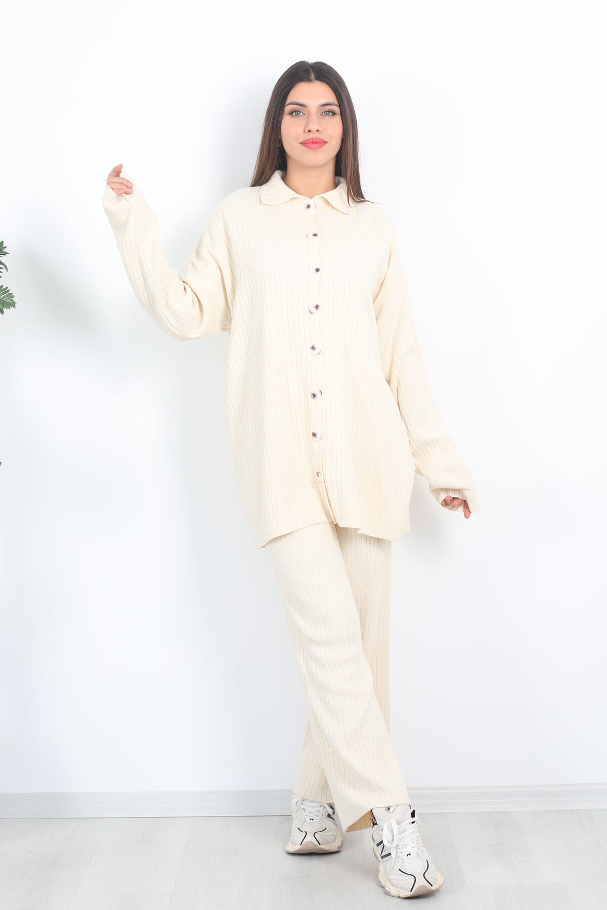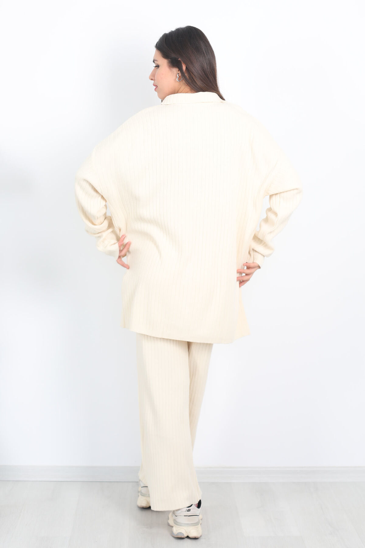 Fitilli Bol Paça Triko Taş Rengi Kadın Gömlek Takım