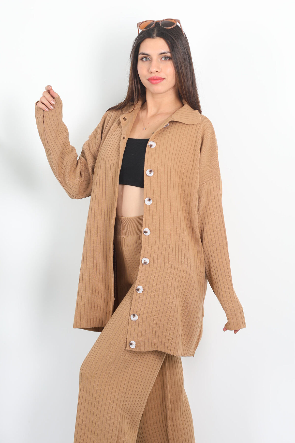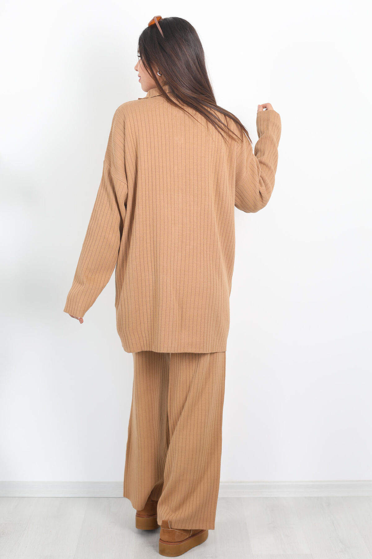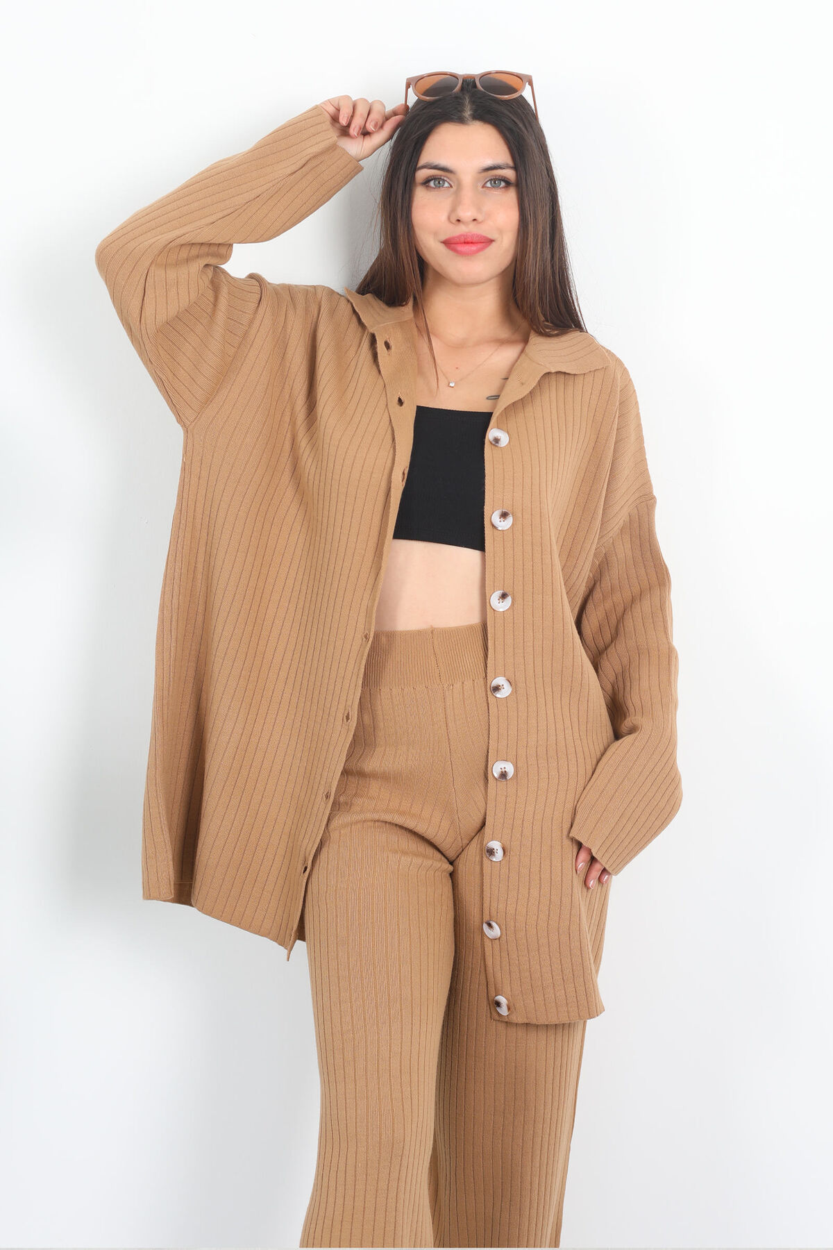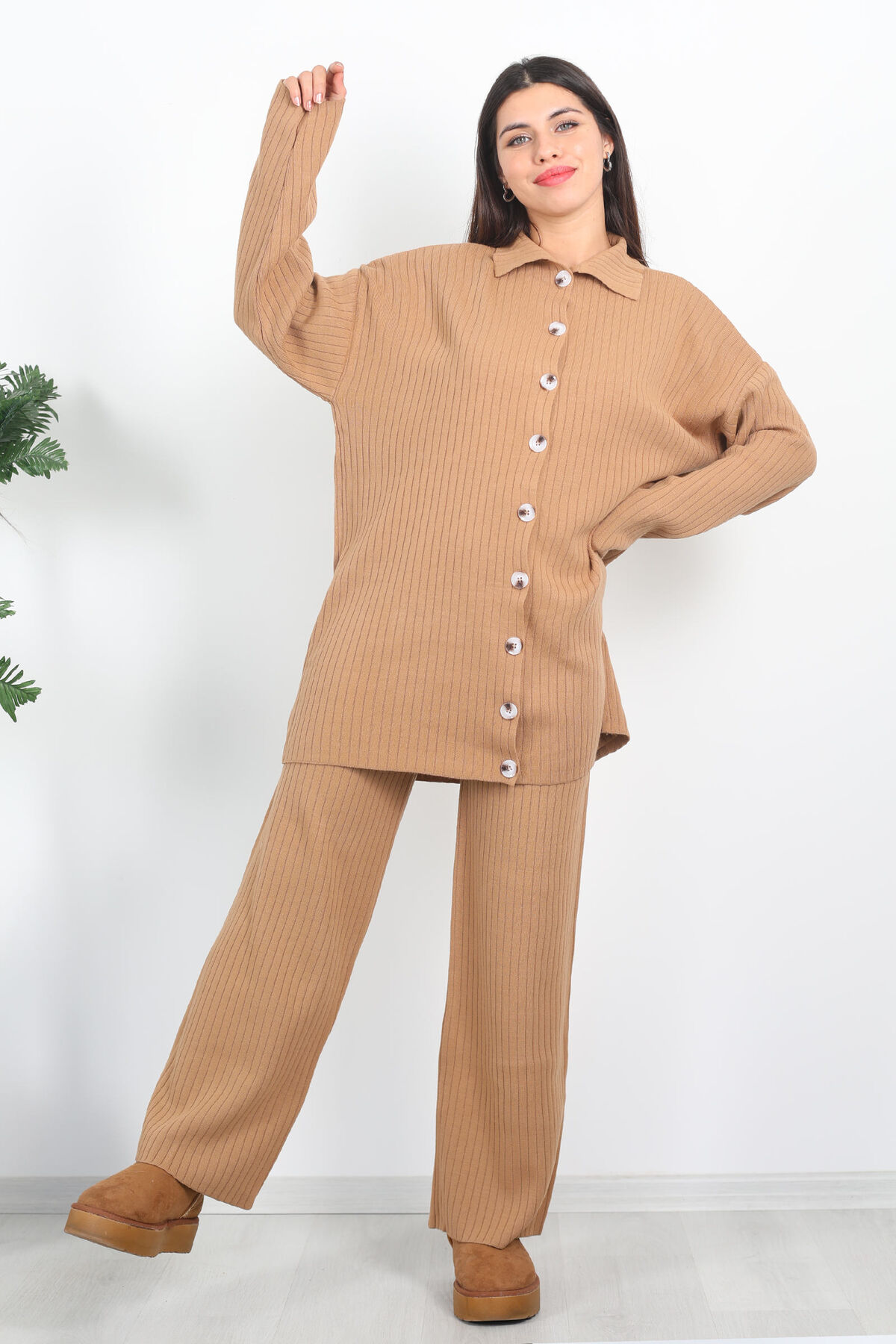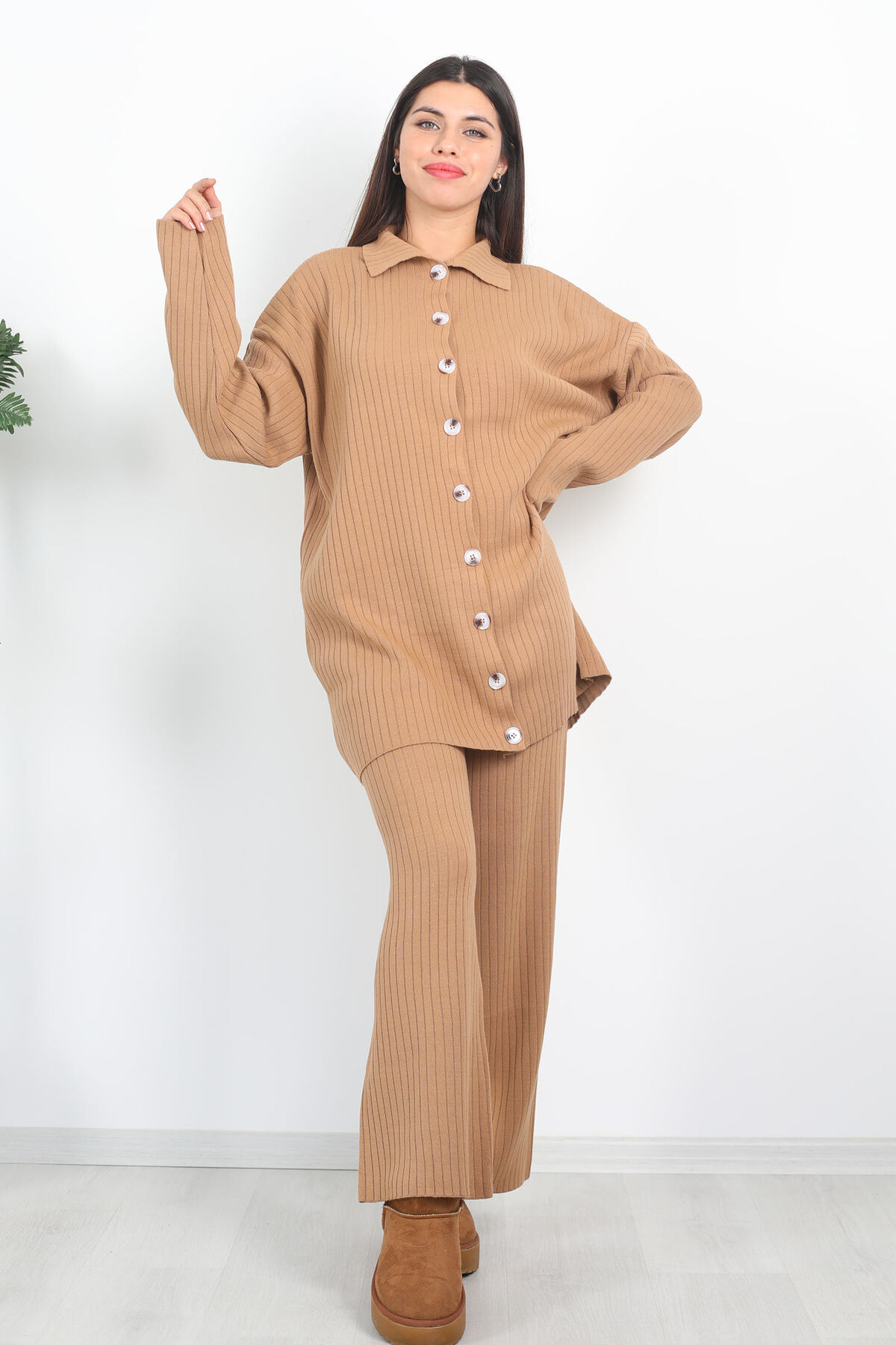 Fitilli Bol Paça Triko Vizon Kadın Gömlek Takım