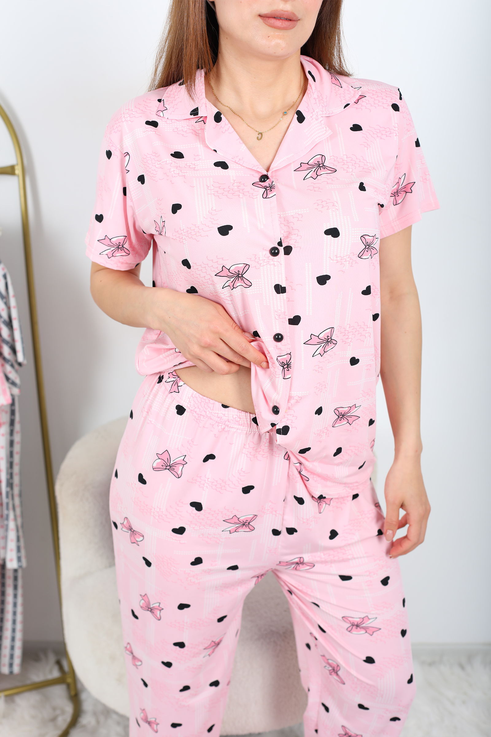 Fiyonk Desenli Düğmeli Pembe Kadın Pijama Takımı