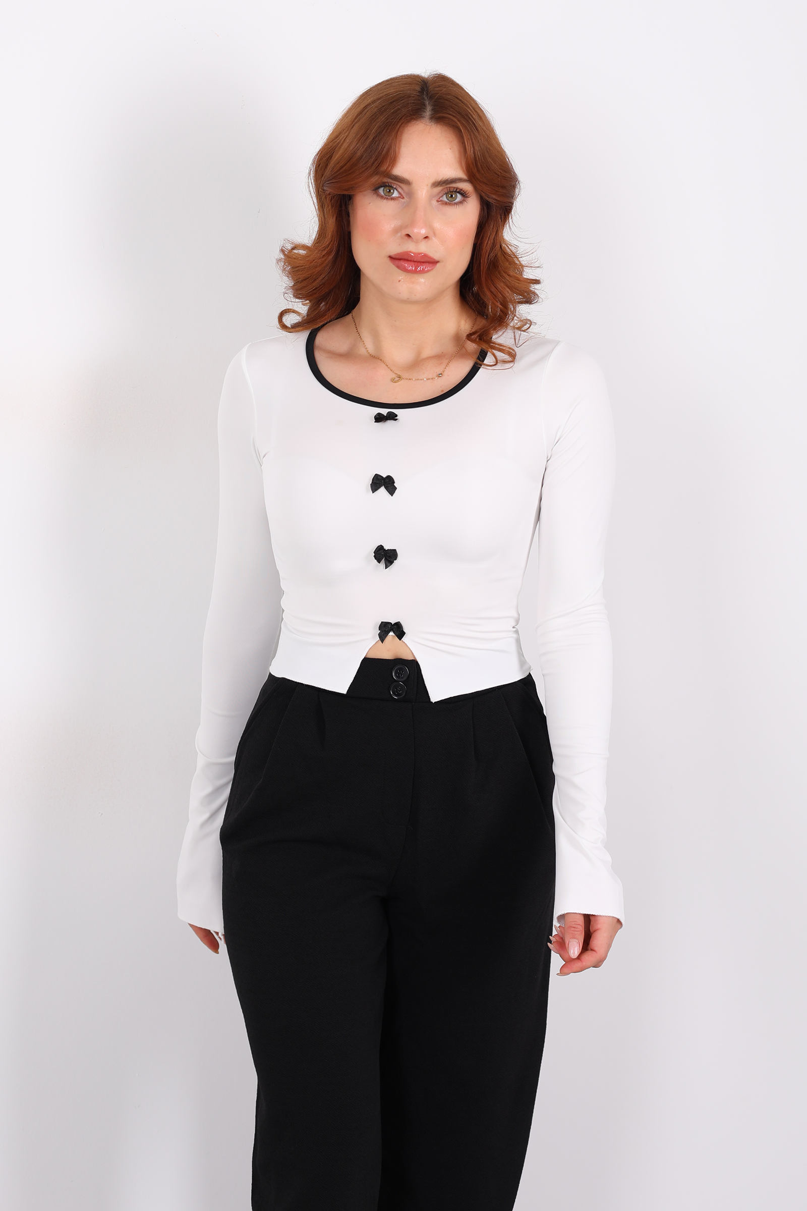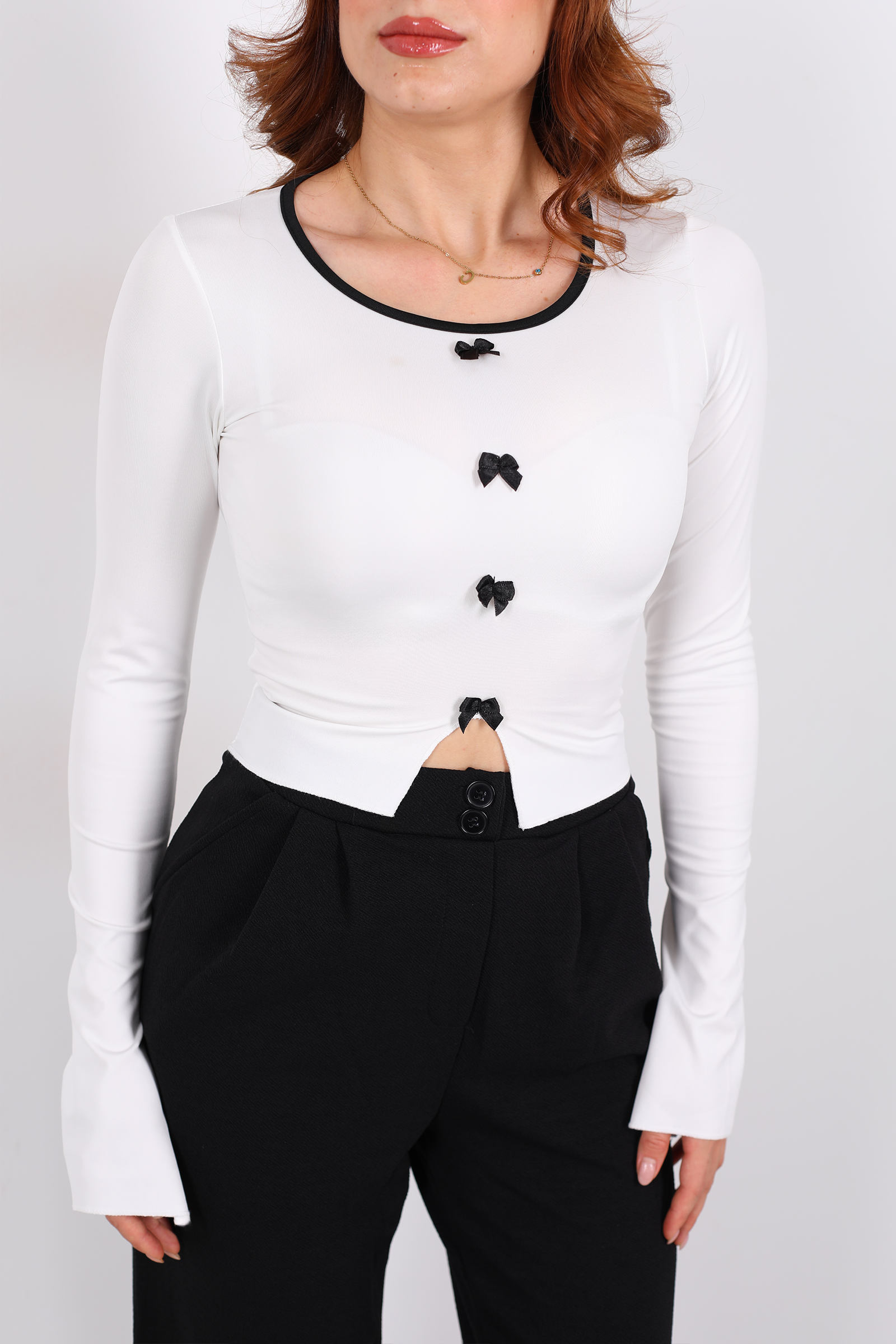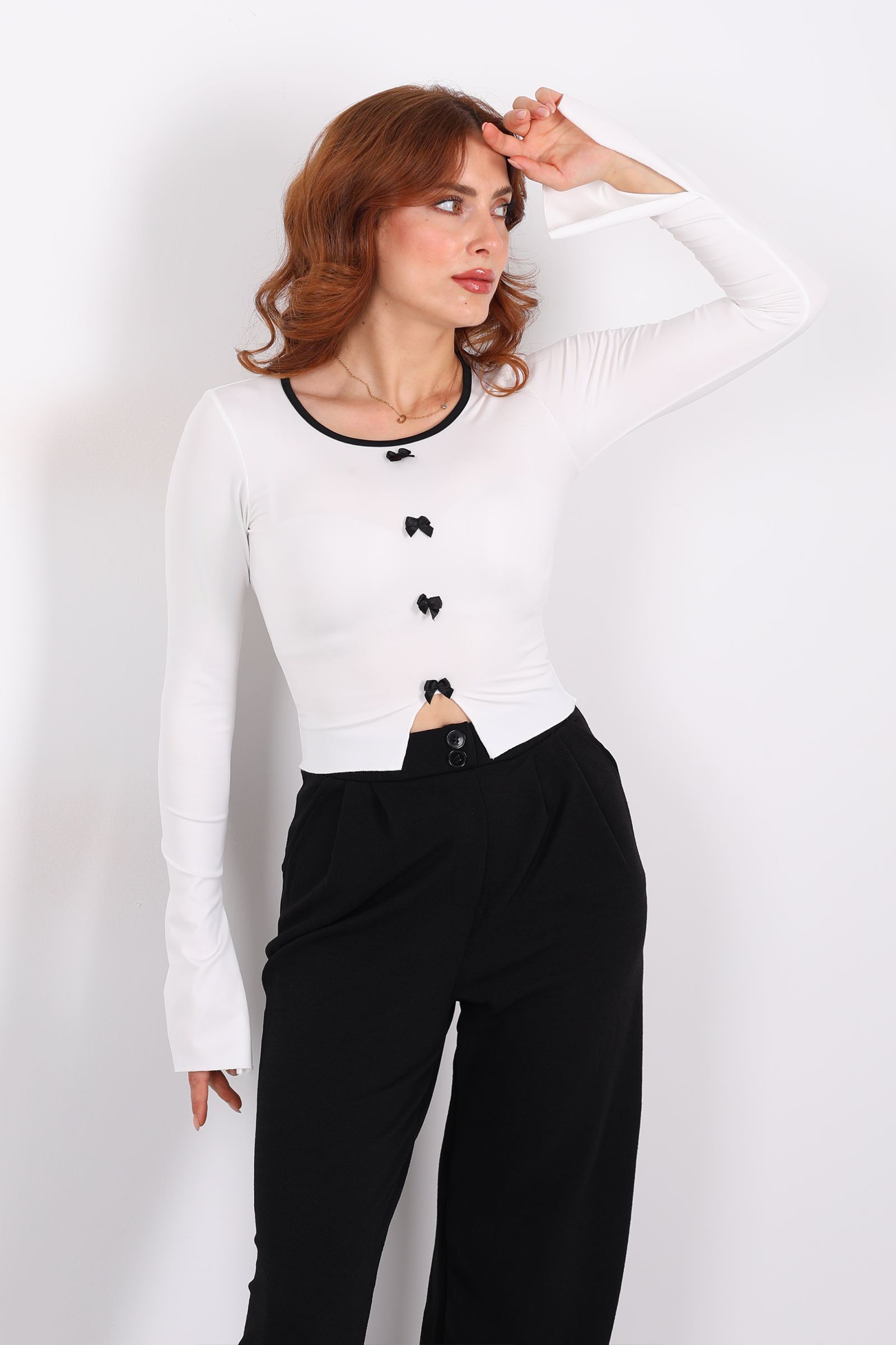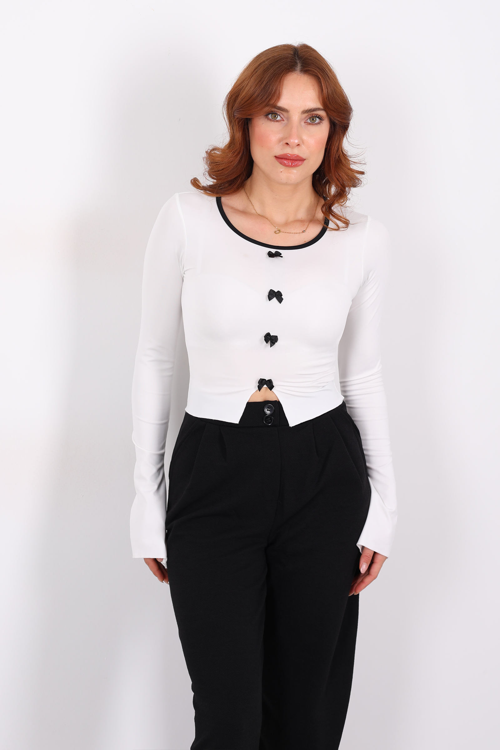 Beyaz zarafetin en romantik yorumu bu bluzda hayat buluyor. Fiyonk detayları, göğsün üzerinde sevimli ve feminen bir vurgu oluştururken, yırtmaclı kol tasarımı harekete her adımda zarif bir akıcılık katıyor.Kumaş büyük olasılıkla yumuşak ve hafif bir yapıya sahip: muhtemelen viskon, polyester ya da ince bir pamuk karışımı kullanılmış. Bu sayede bluz hem gün boyu konfor sunar hem de gerektiğinde şık bir görünüm için ideal bir temel parça olur.Kalıp olarak ne çok dar ne de aşırı bol; vücudu nazikçe eğerken dinamizmi ve özgür hareket alanını korur. Fiyonk dokunuşu, bluzun klasik siluetini feminen bir estetikle dengeler.