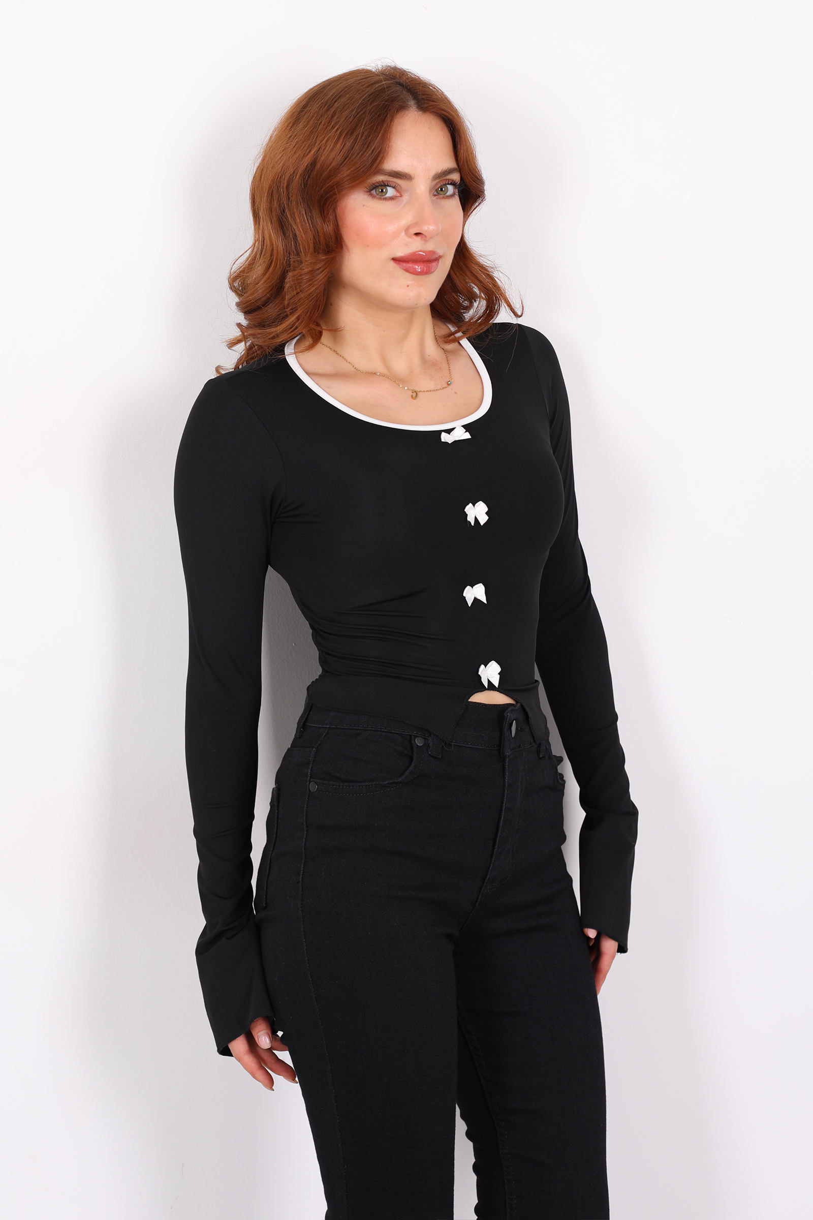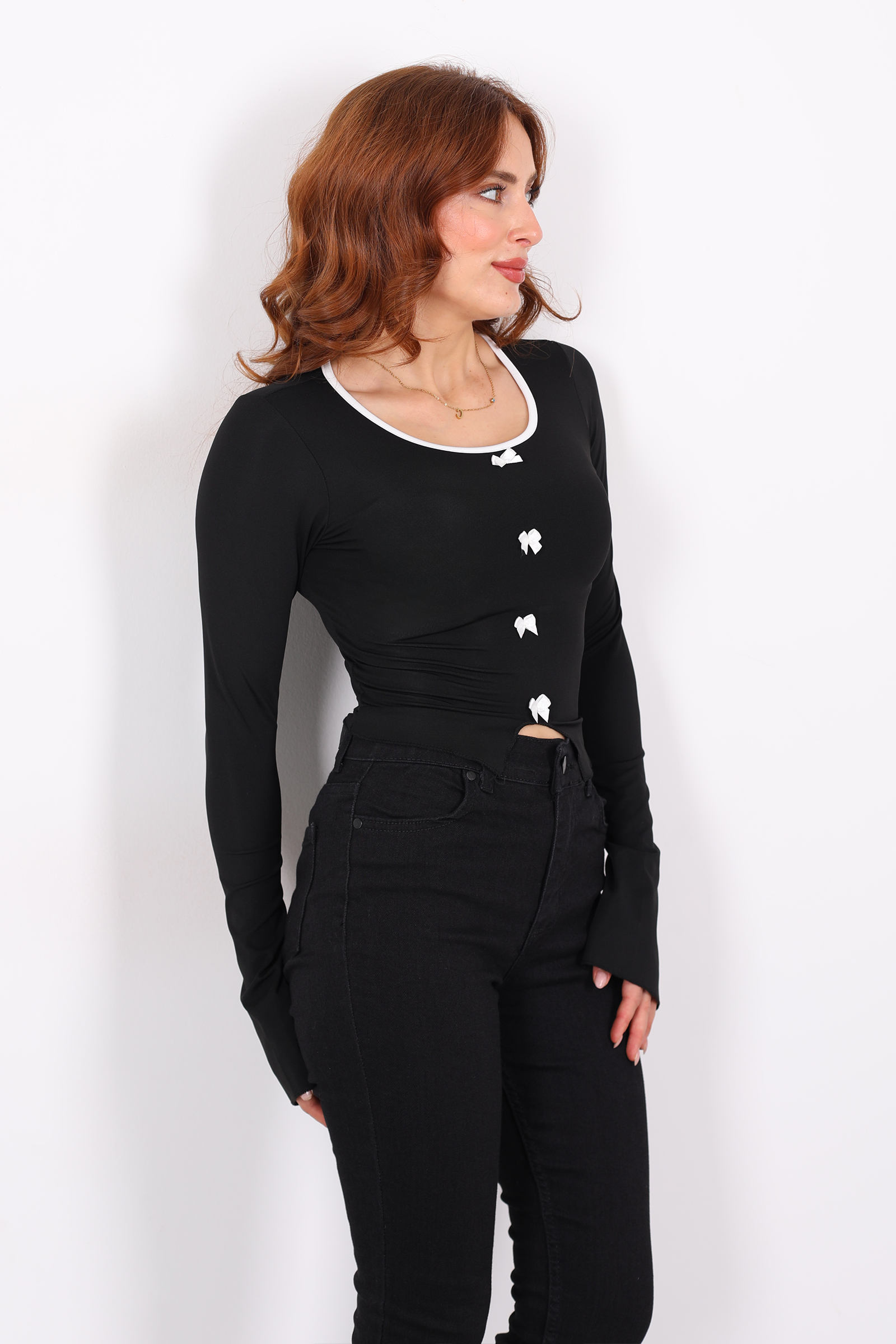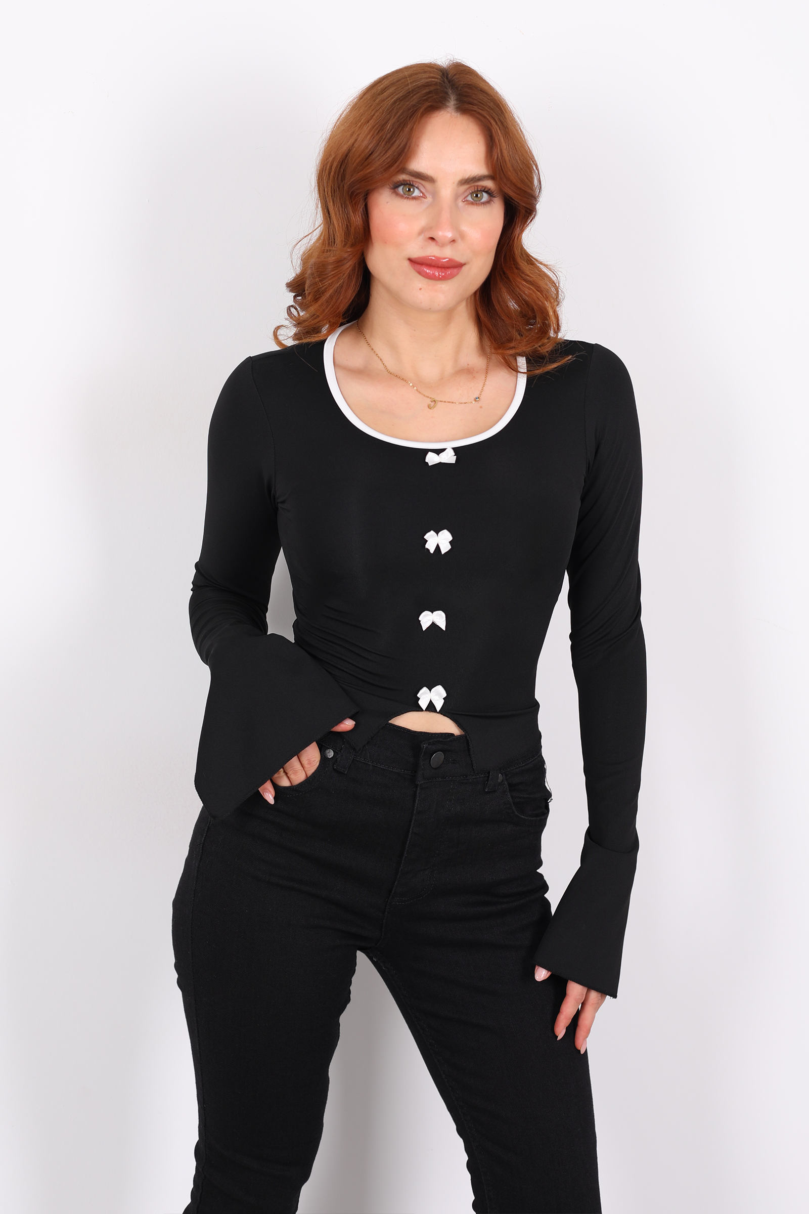 Geceye ve gündüze uygun, zarafetiyle dikkat çeken bir bluz: derin siyah tonuyla fiyonklu detayların feminen dokunuşunu buluşturuyor. Kollardaki yırtmac, hem hafif bir hava kazandırıyor hem de hareket anında gölgeler ve ışık içinde zarif bir akıcılık sunuyor.Fiyonklar, göğüs hattında ince bir vurguyla göze çarpıyor ve bluzun klasik siluetini feminen bir zarafetle dengeliyor. Bu kuşağa benzer detaylar, bluzun hem romantik hem de modern bir hava taşımasını sağlıyor.